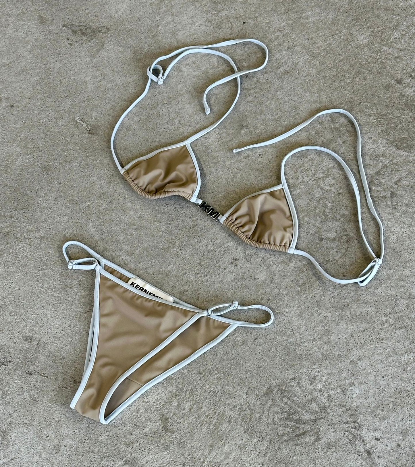 Beige og lysegrå bikini fra Kernemilk. Denne bikini består af 'Sica' bikini-top og 'Cassi' bikini-underdel - begge dele med tynde justerbare stropper. Toppen har et sølv logo i metal på fronten samt en bindbåndslukning bagpå.