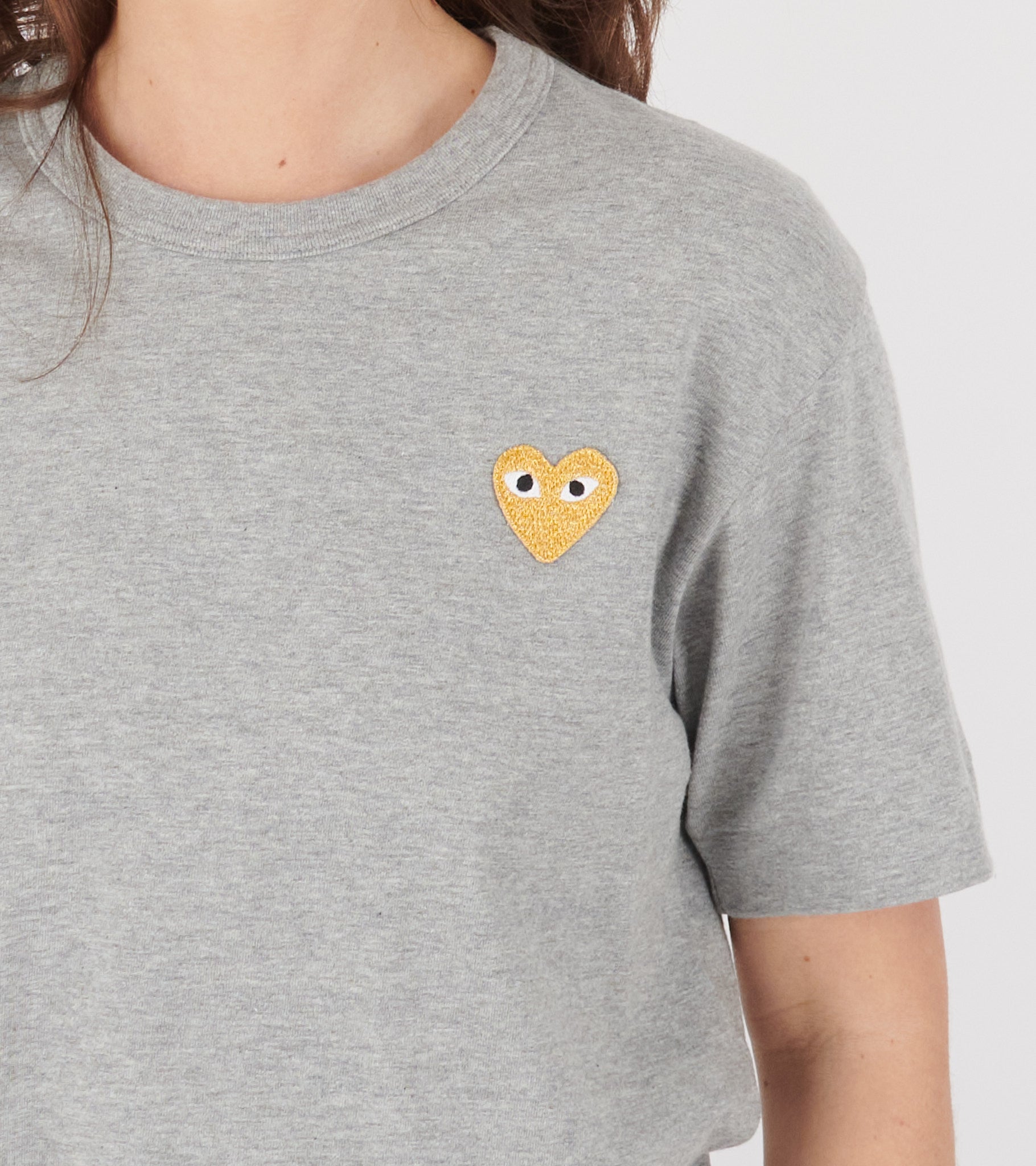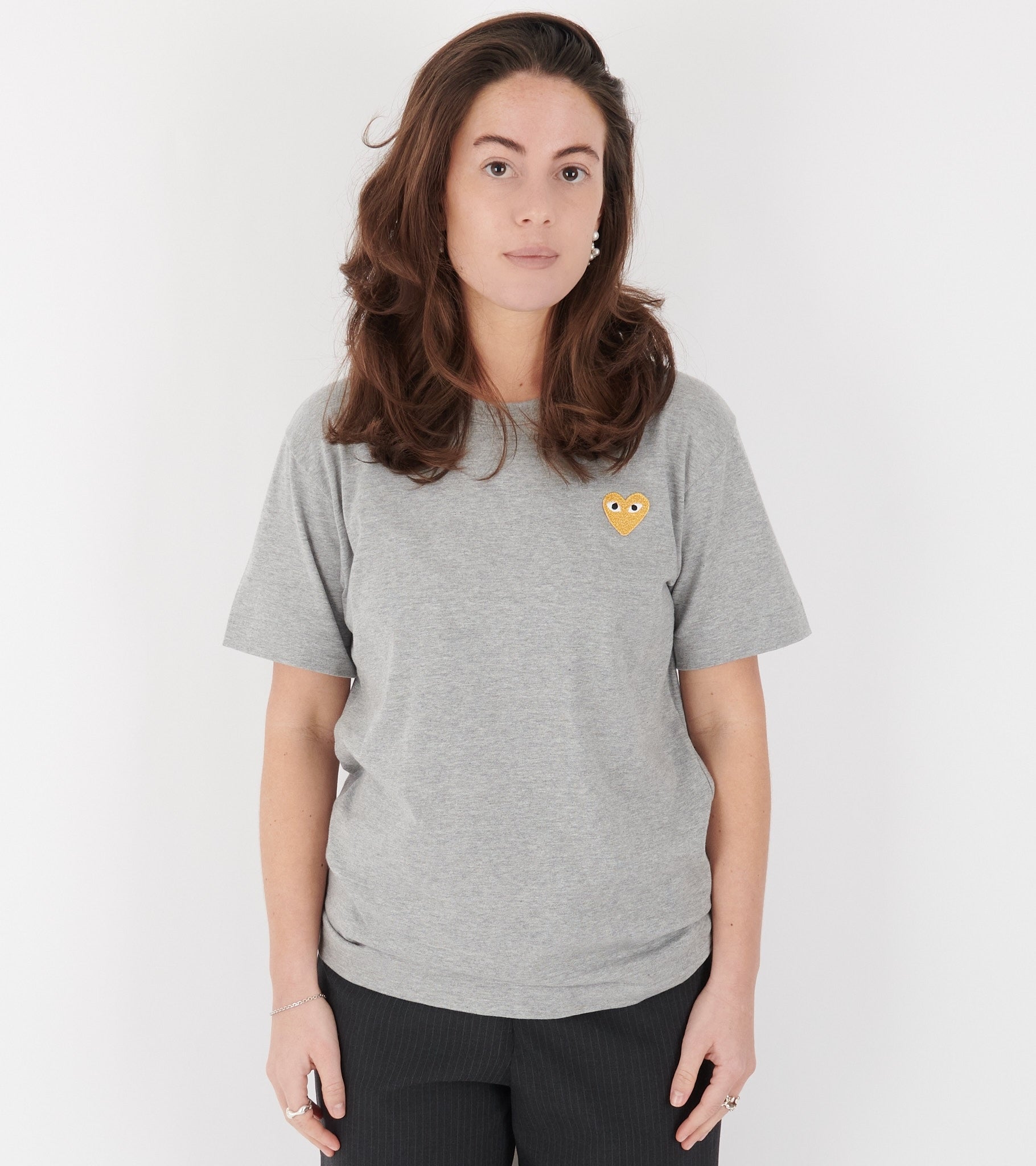Grå unisex t-shirt fra Comme des Garcons PLAY med mærkets karakteristiske hjerte med øjne. Det ikoniske hjerte med øjnene fra PLAY er designet af Filip Pagowski og er gennemgående på alle PLAY produkter. Denne t-shirt har et lille broderet hjerte i guld ved venstre bryst.