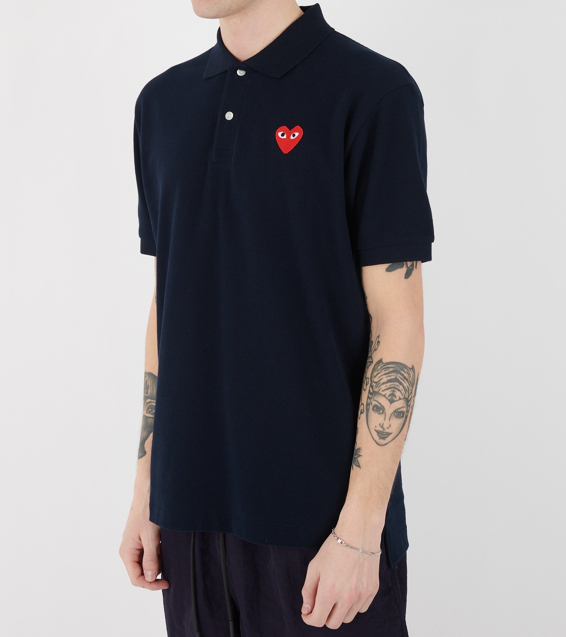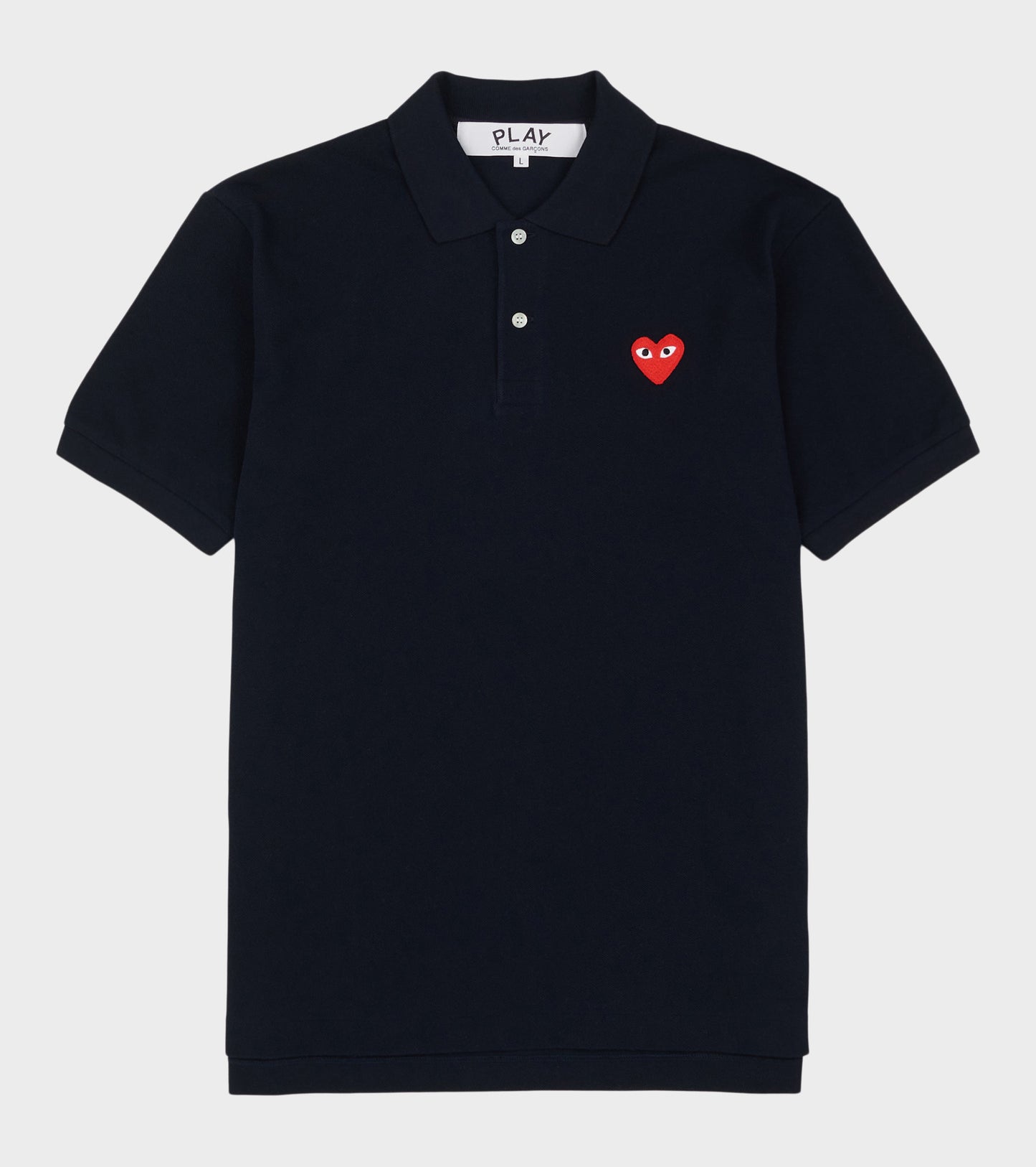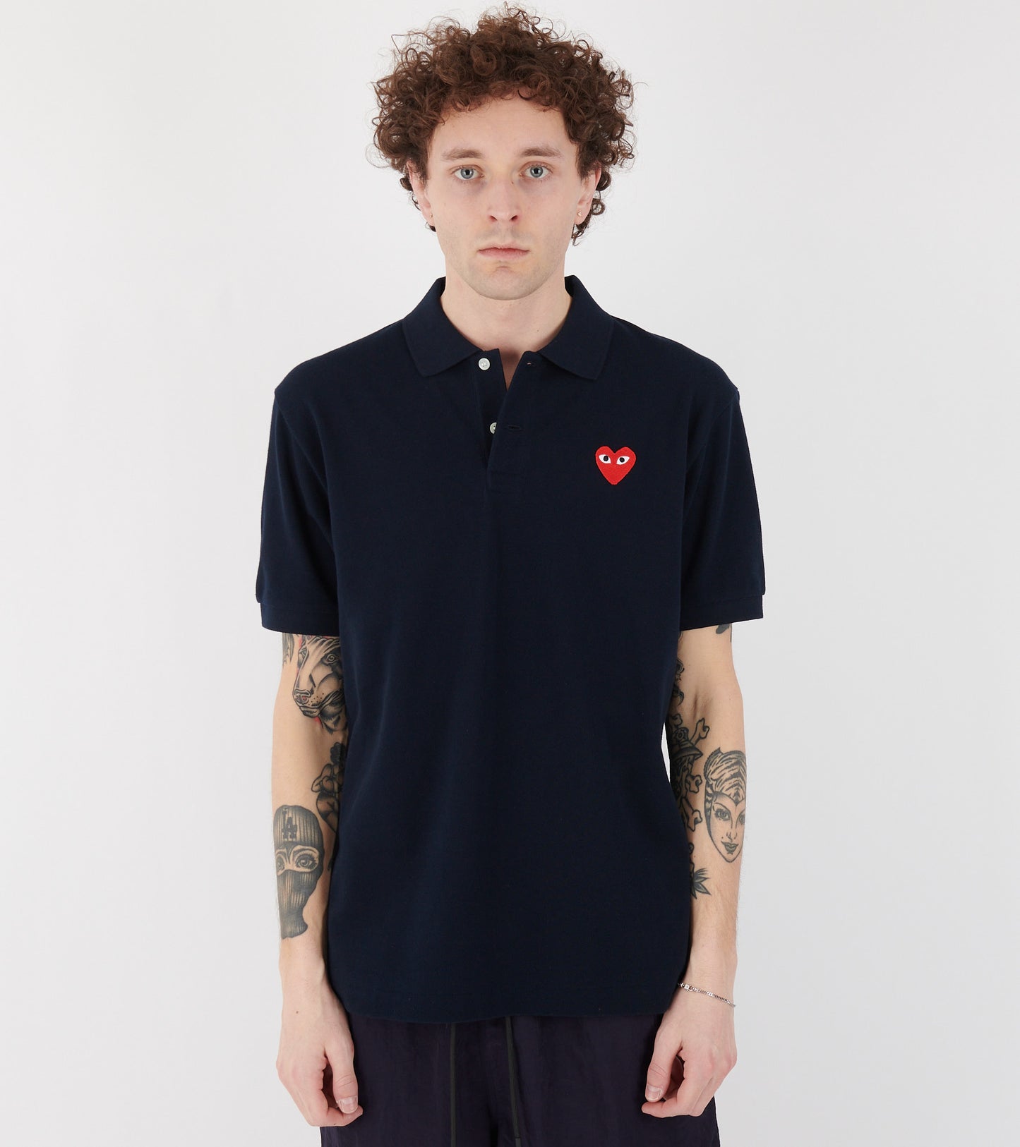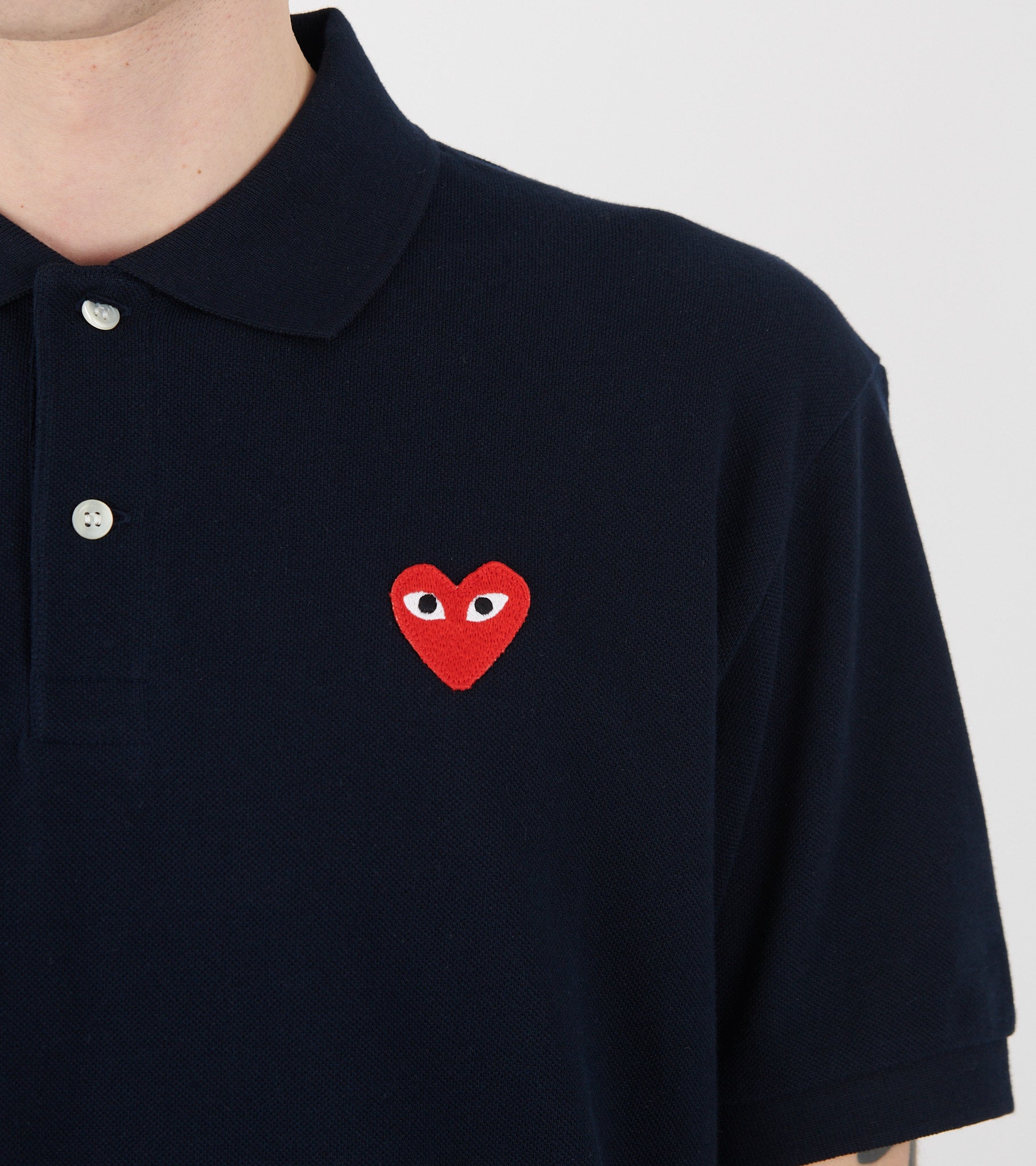 Navy unisex kortærmet polo fra Comme des Garcons PLAY med mærkets karakteristiske hjerte med øjne. Det ikoniske hjerte med øjnene fra PLAY er designet af Filip Pagowski og er gennemgående på alle PLAY produkter. Denne polo har et broderet hjerte i rød ved venstre bryst.
