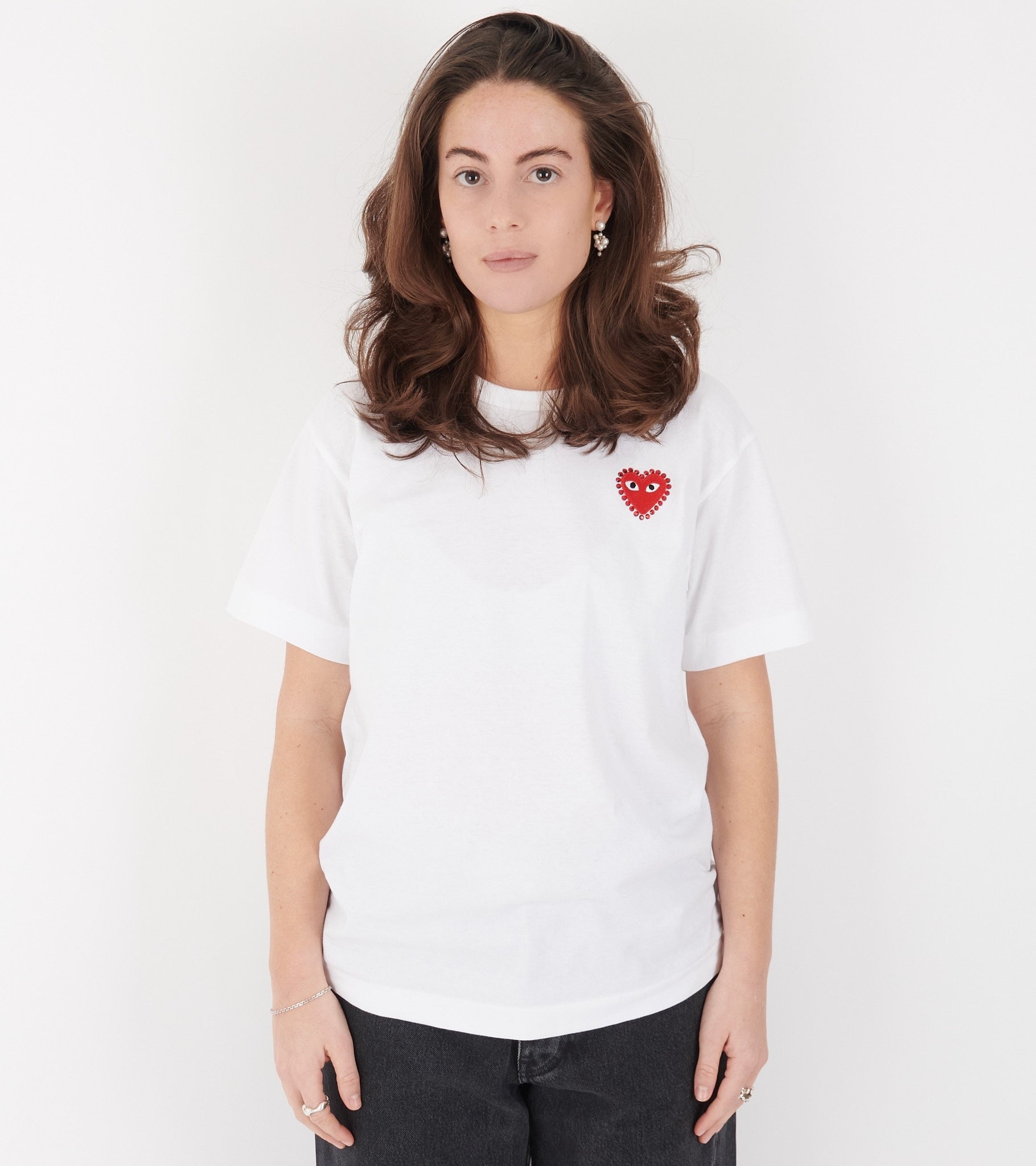 Hvid unisex t-shirt fra Comme des Garcons PLAY med mærkets karakteristiske hjerte med øjne. Det ikoniske hjerte med øjnene fra PLAY er designet af Filip Pagowski og er gennemgående på alle PLAY produkter. Denne t-shirt har et lille broderet hjerte i rød ved venstre bryst - rundt om hjertet er små røde rhinsten.