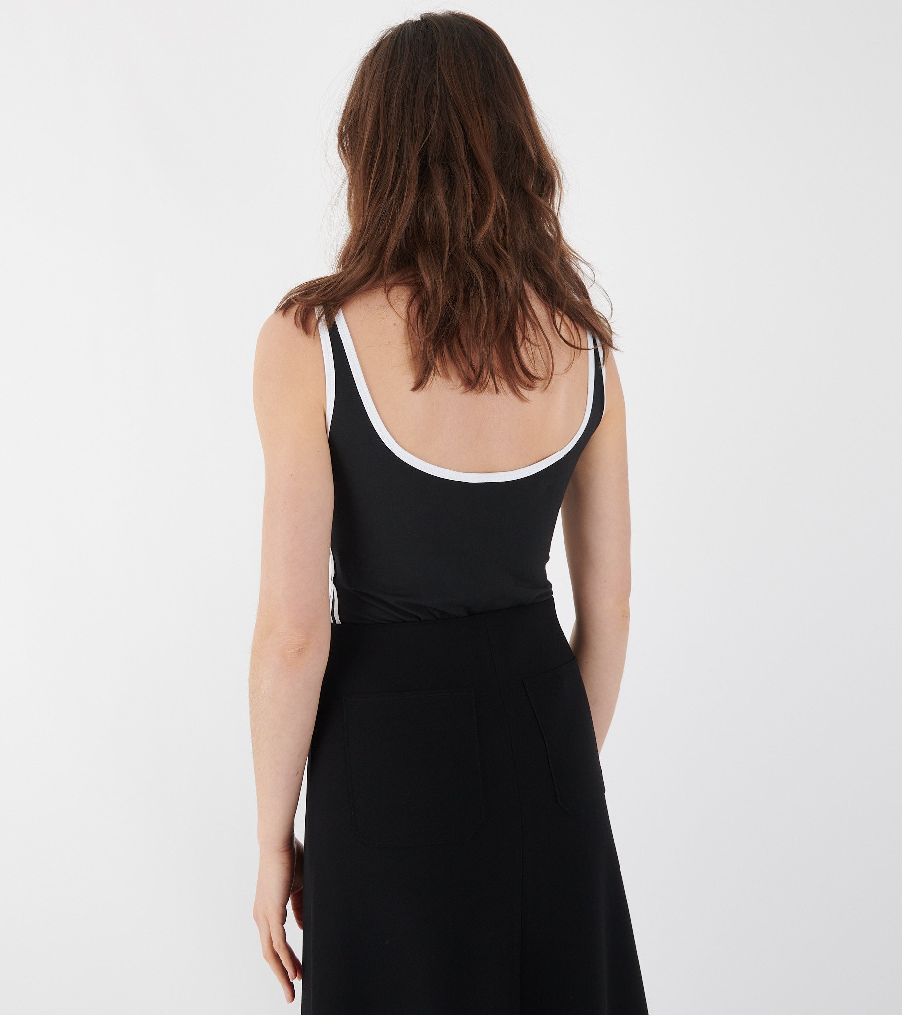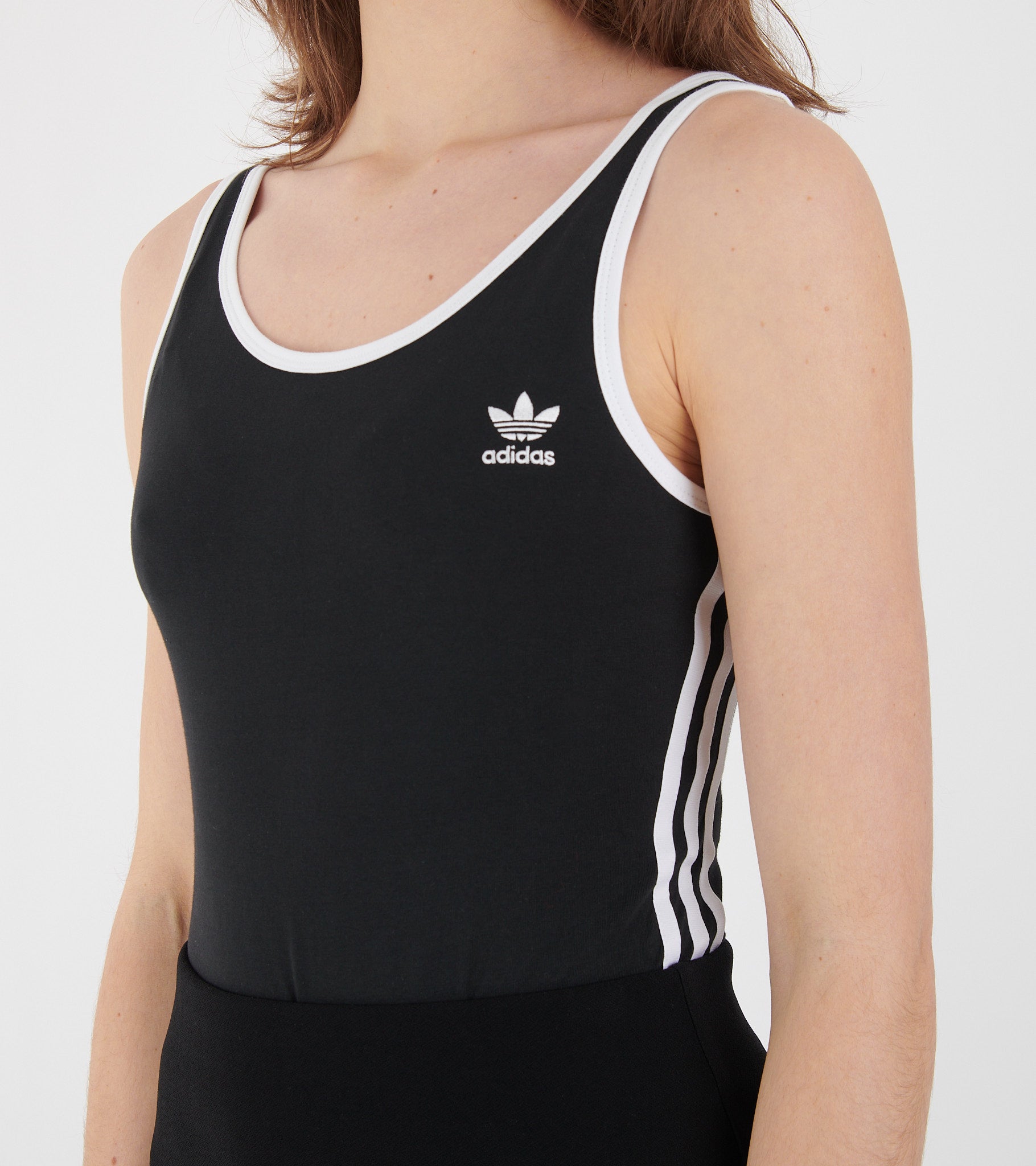 Sort bodystocking fra Adidas. Denne body har hvide kontrastkanter, hvide striber i siderne og det ikoniske logo ved venstre bryst.