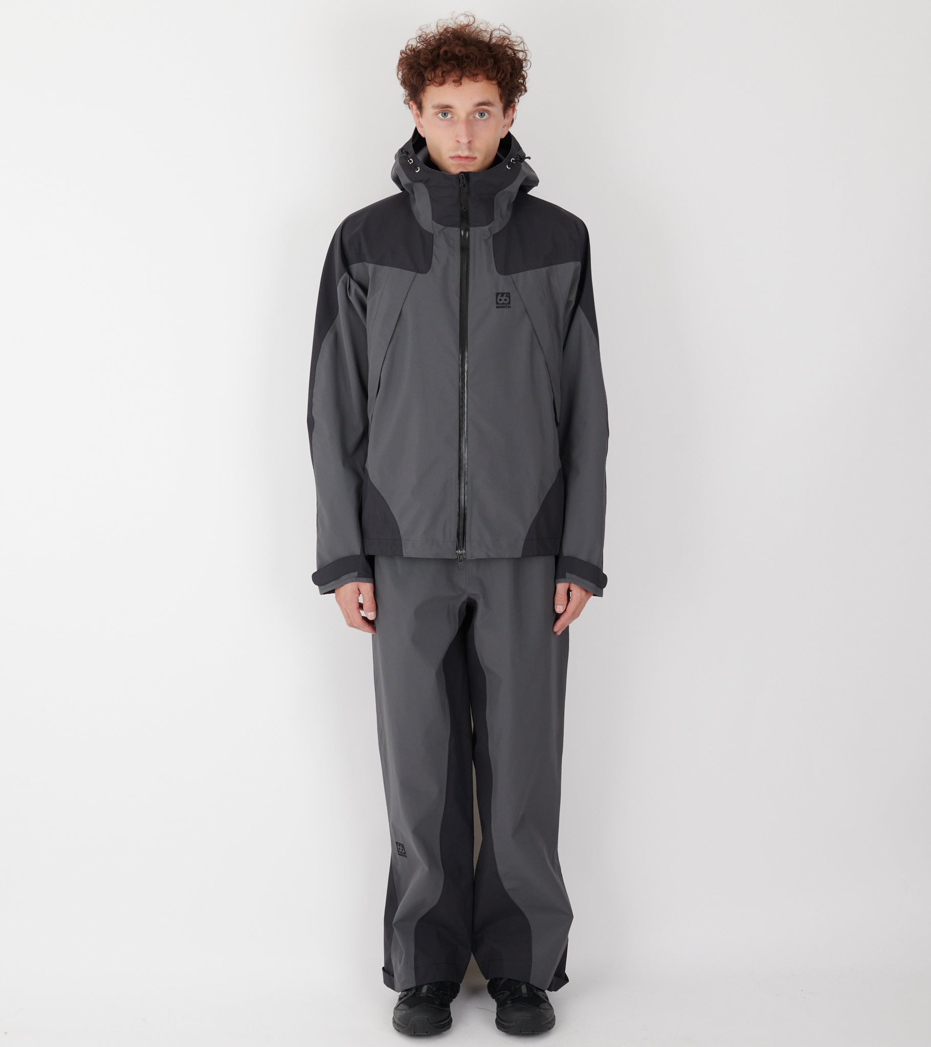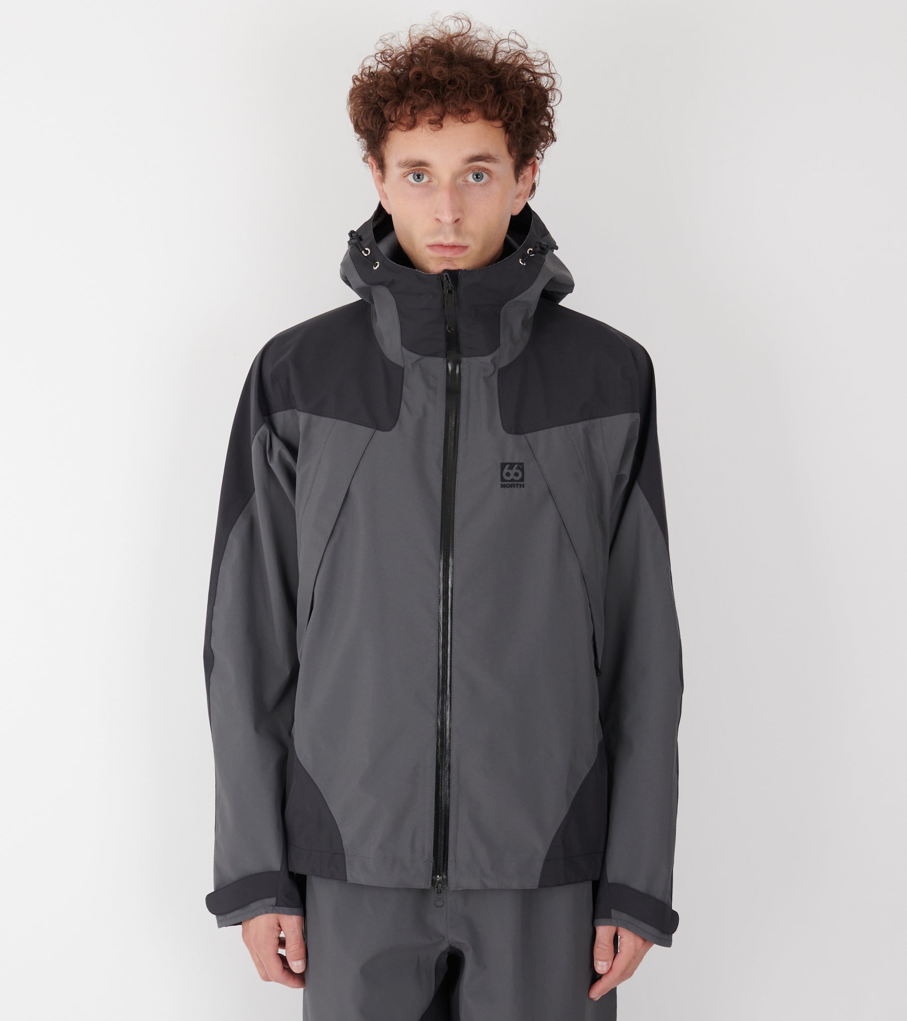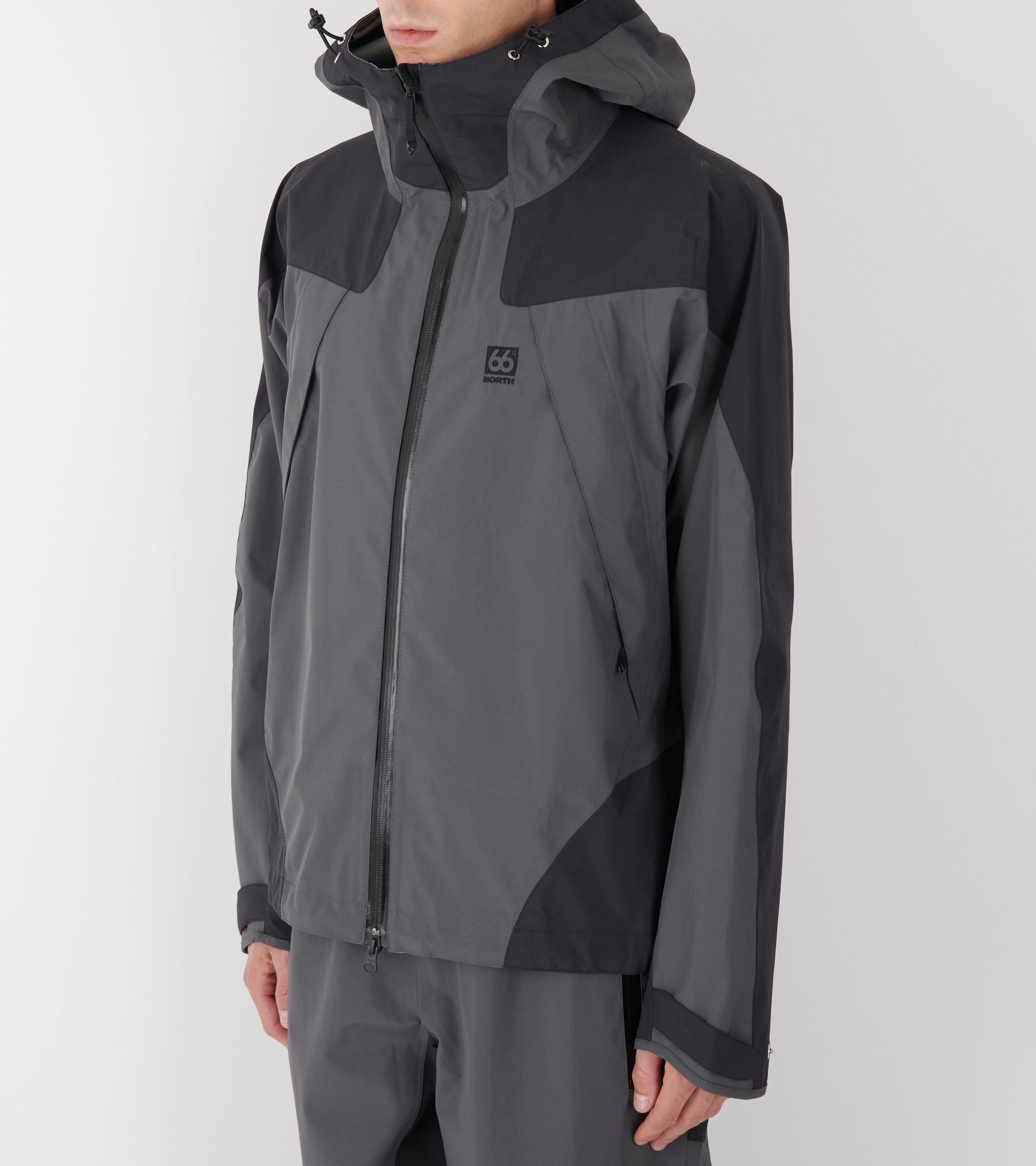 Skaljakke i grå og sort fra 66 North. Dyngja Shell Jacket er en vandtæt jakke som har en tapet lynlåslukning, to rumlige skrålommer og elastisk i livet.