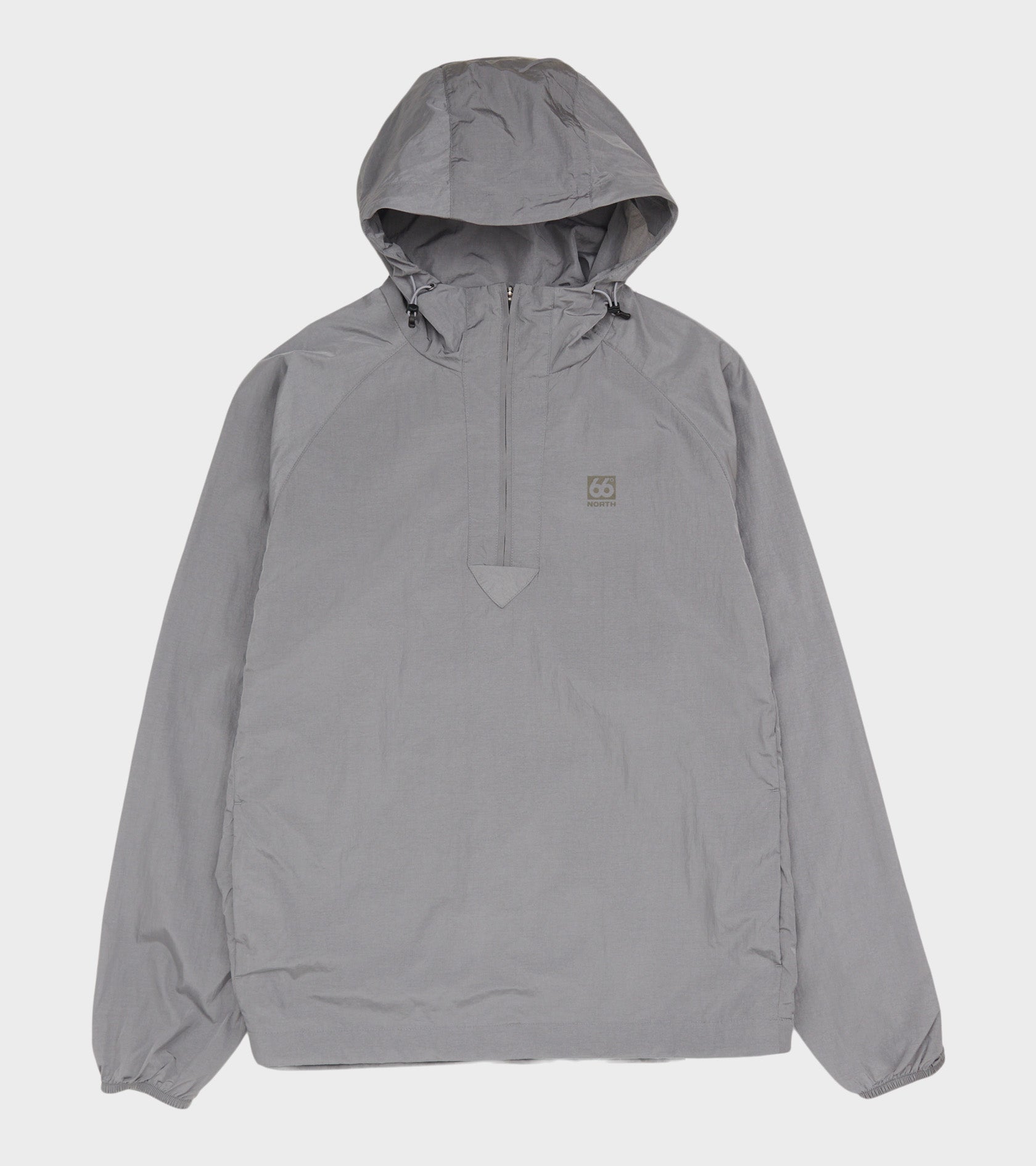 Grå anorak fra 66 North. Hofdi Anorak er fremstillet i vindafvisende nylon og har en justerbar hætte, en halfzip lynlåslukning samt en skrålomme i hver side. Ved venstre bryst er et broderet logo.