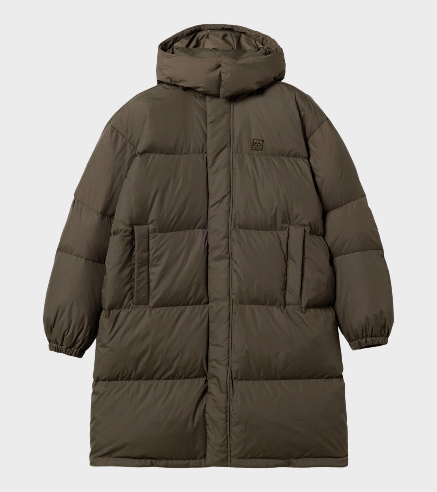 Lang dunjakke i en olivengrøn nuance fra 66 North. Denne jakke har en aftagelig hætte, en lynlås- og trykknaplukning, en lynlåslomme i hver side og et logo ved venstre bryst. Jakken er vandafvisende og fyldt med bløde andedun og fjer.