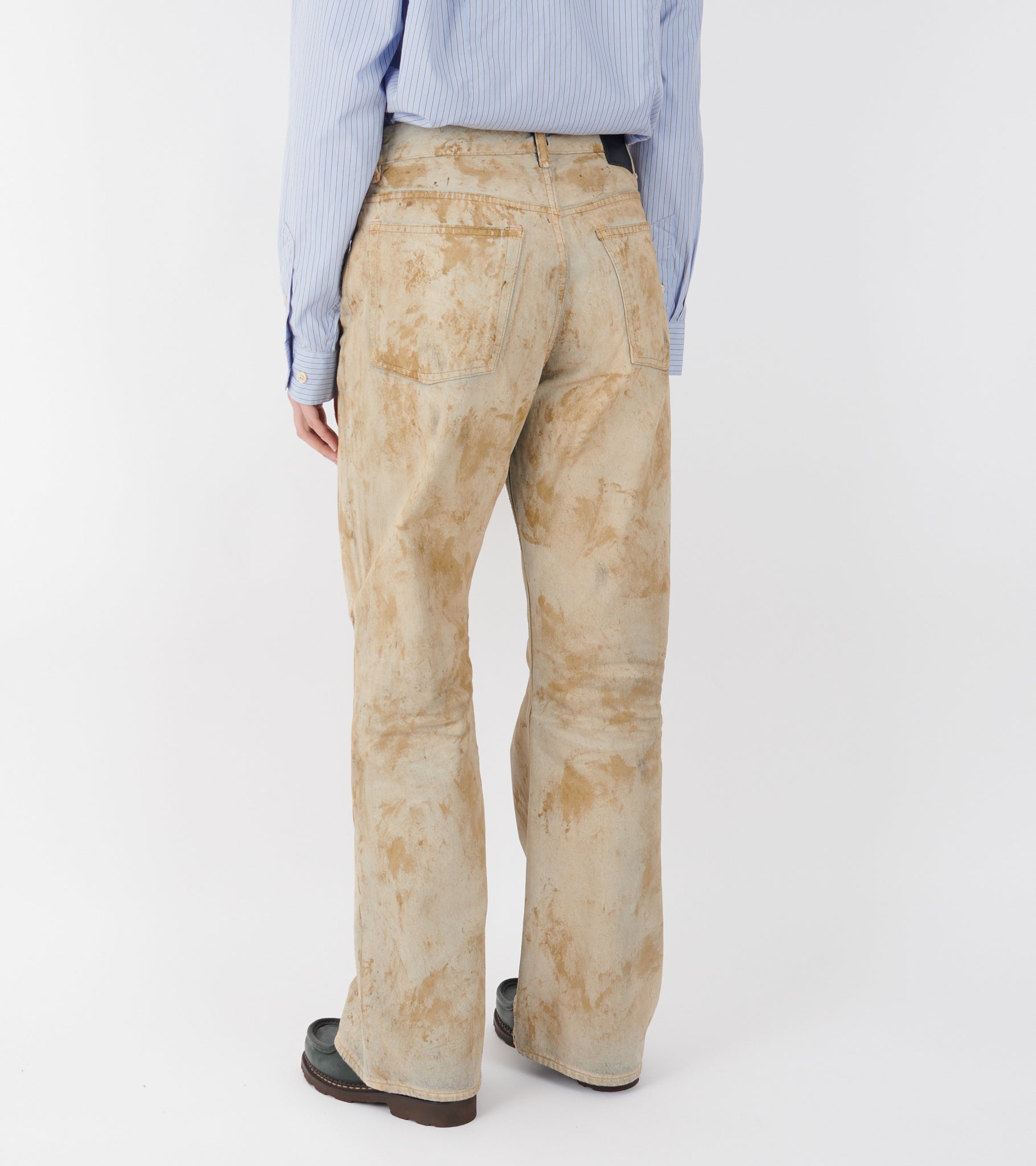 Bleached jeans med distressed detaljer fra Acne Studios. Øverst bagpå er et sort logotag i læder. Disse jeans er mørkeblå, hvilket ses indvendigt samt i lommerne - den brugte afblegning har efterladt ydersiden i en beige nuance.