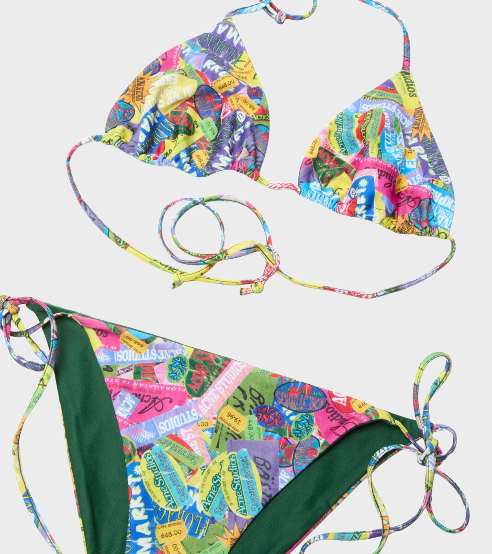 Multifarvet bikini med logoprint fra Acne Studios. Bikinien har justerbare stropper og 'Acne Studios Supermarket' logoer samt pricetags.