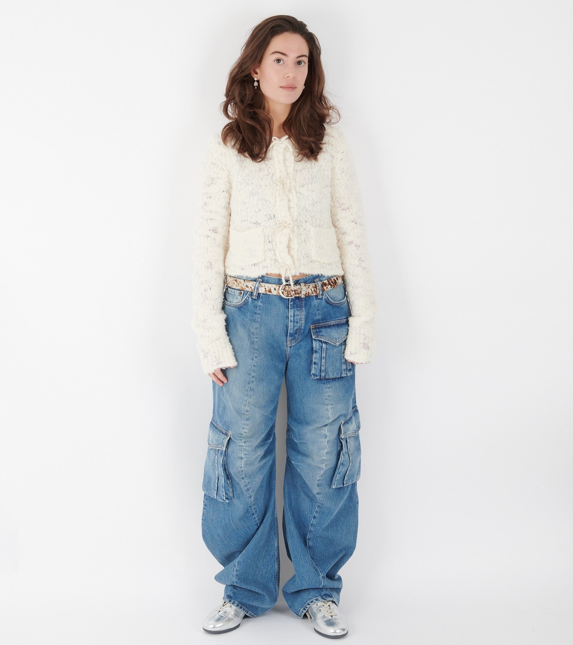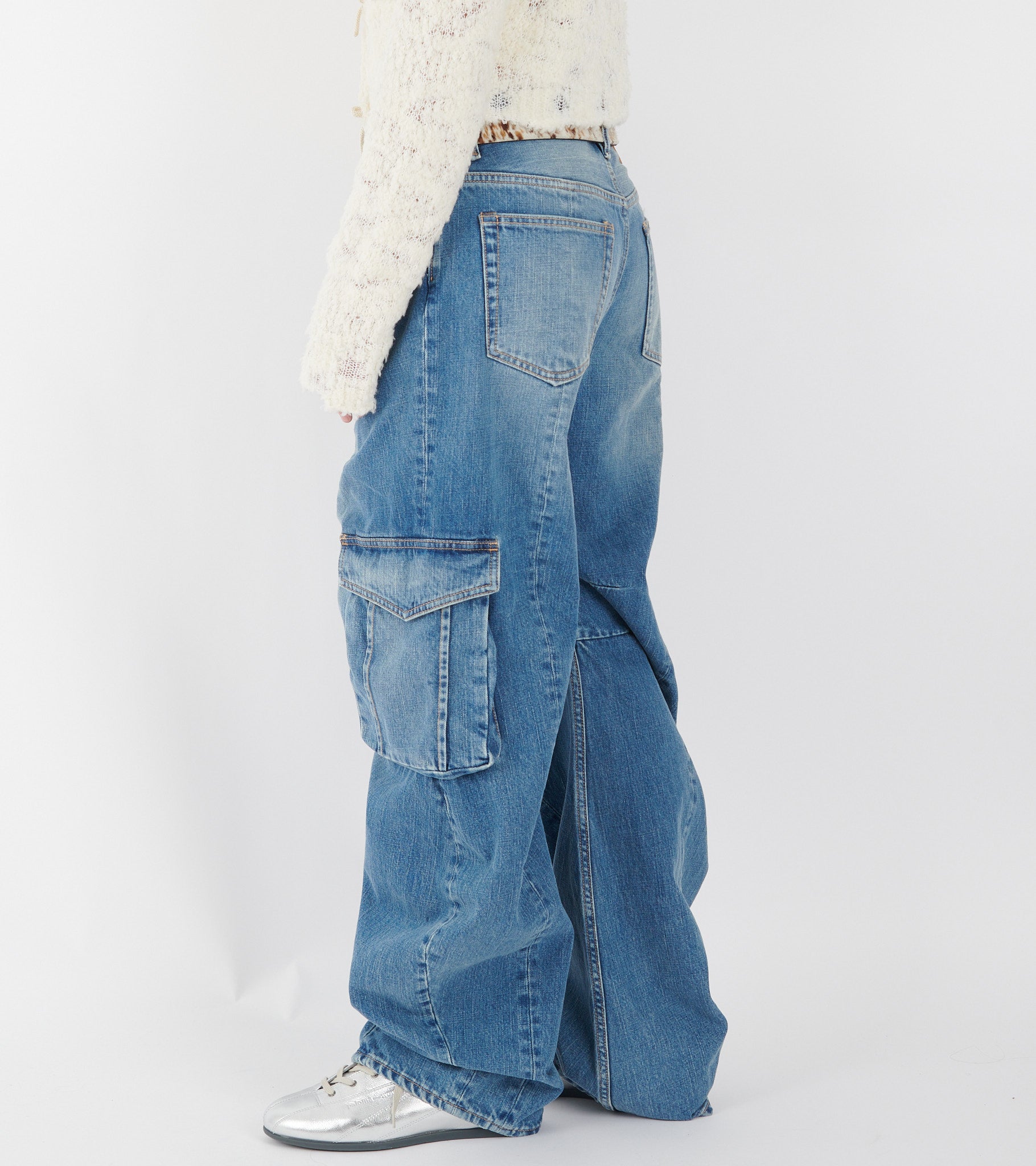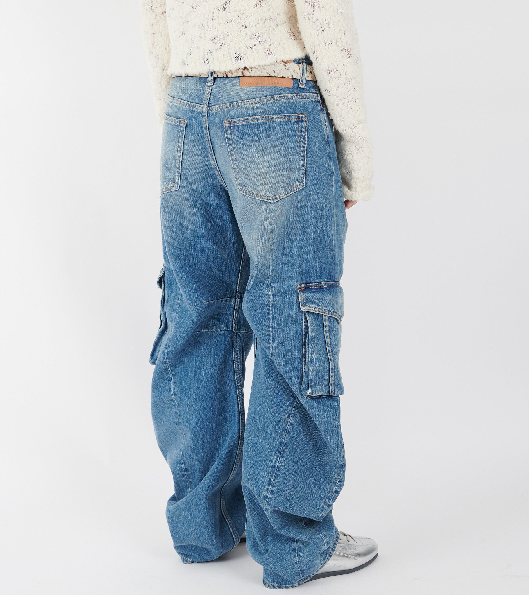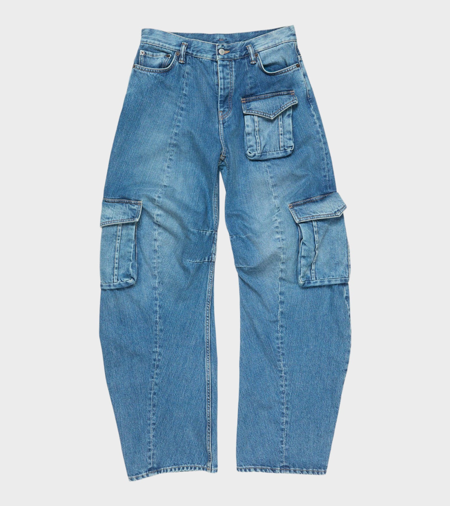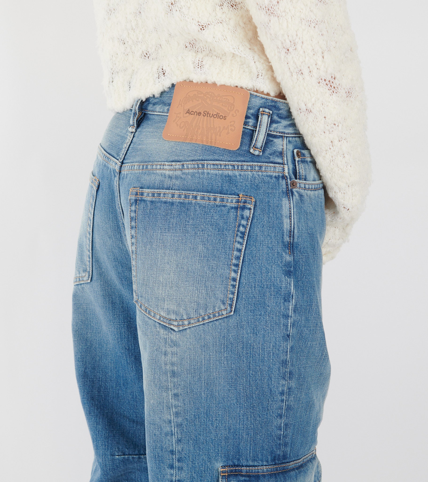 Blå cargo-jeans med lommer og brede buede ben fra Acne Studios.