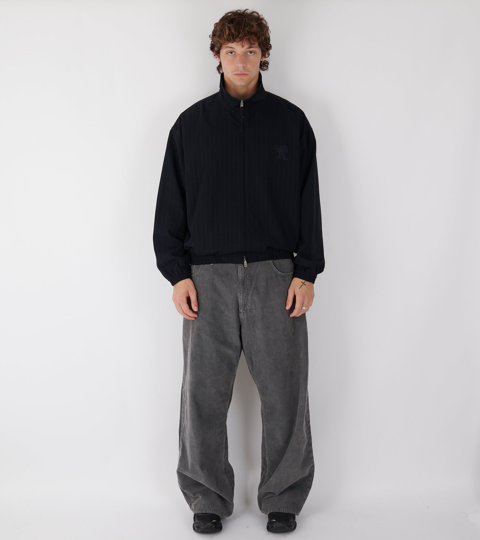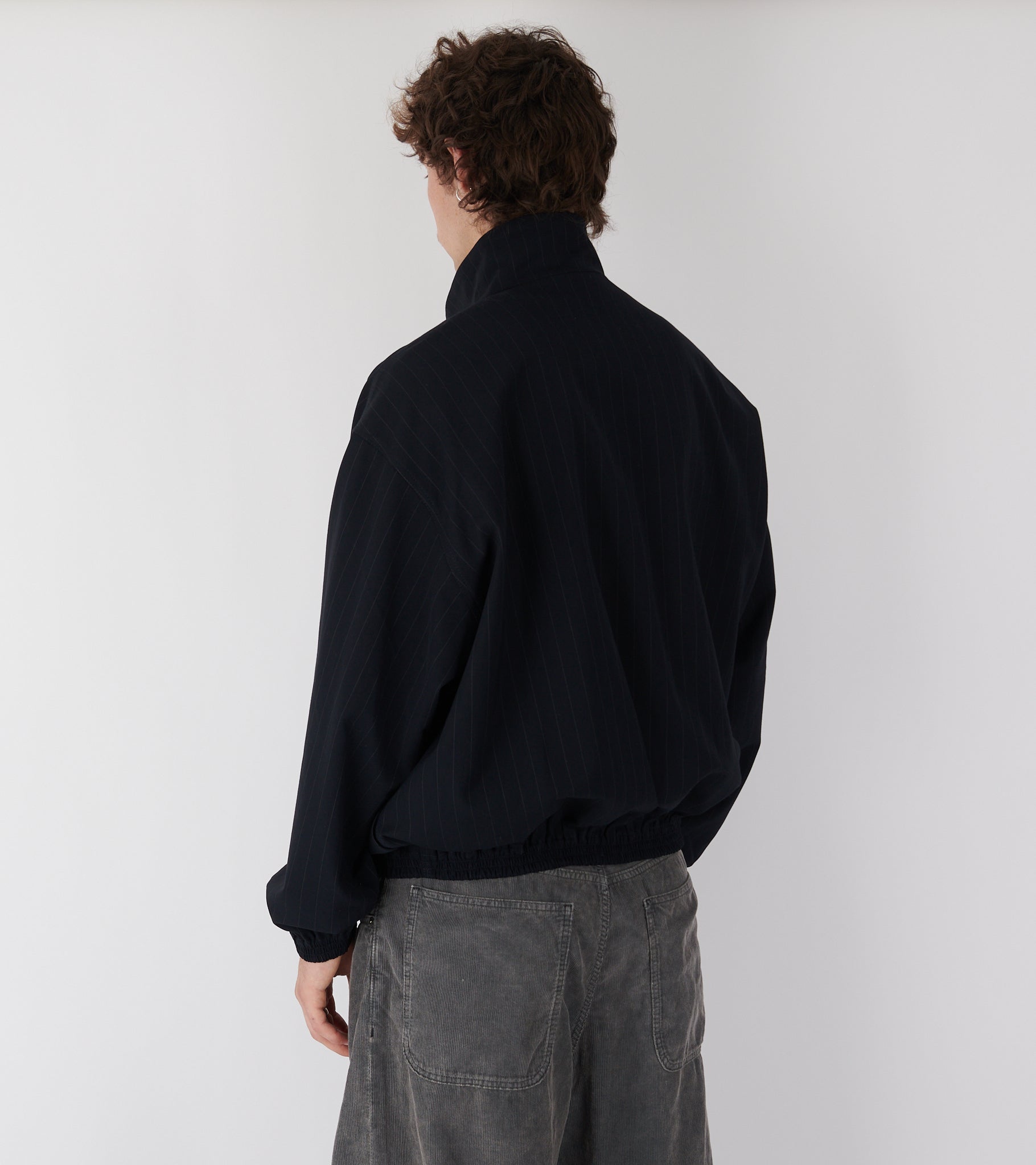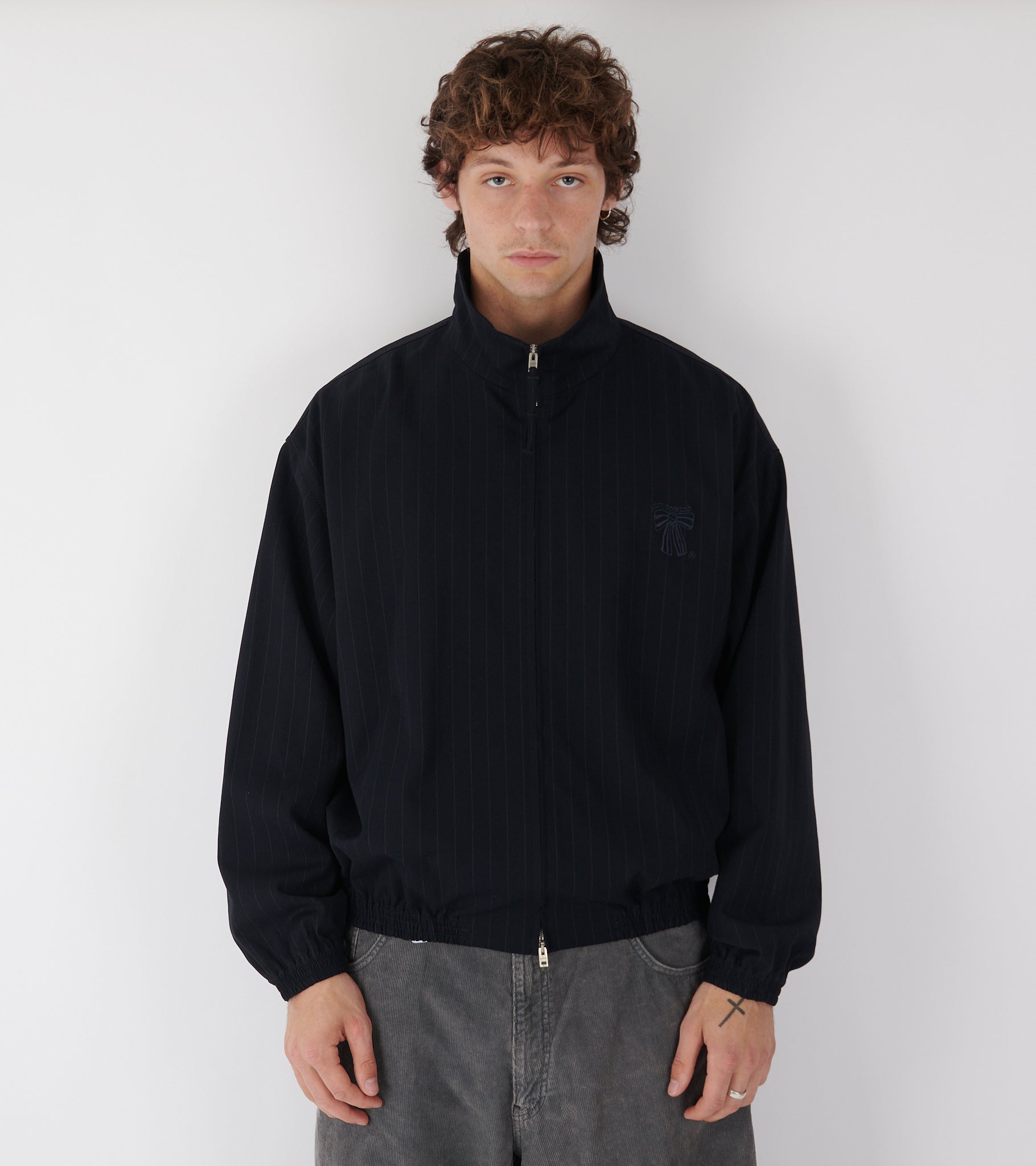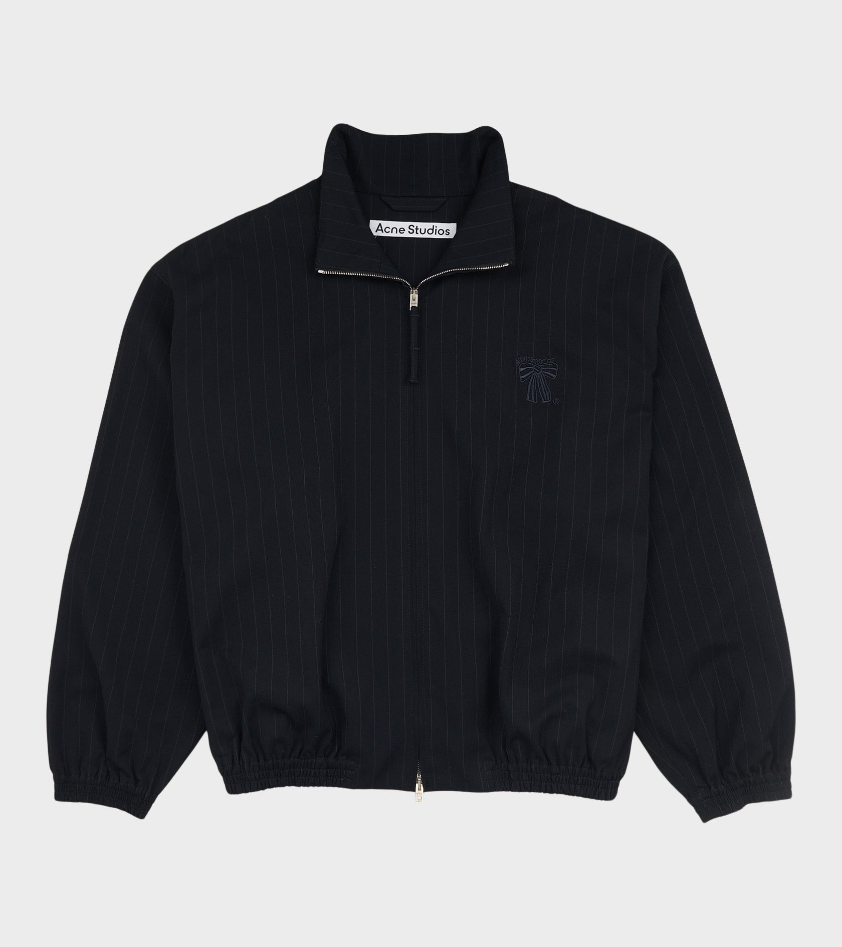 Mørk navy jakke med tynde striber fra Acne Studios. Jakken har en høj hals, en dobbeltgående lynlåslukning, elastikkanter i enderne og en lomme i hver side. Ved venstre bryst er et broderet sløjfe-logo.