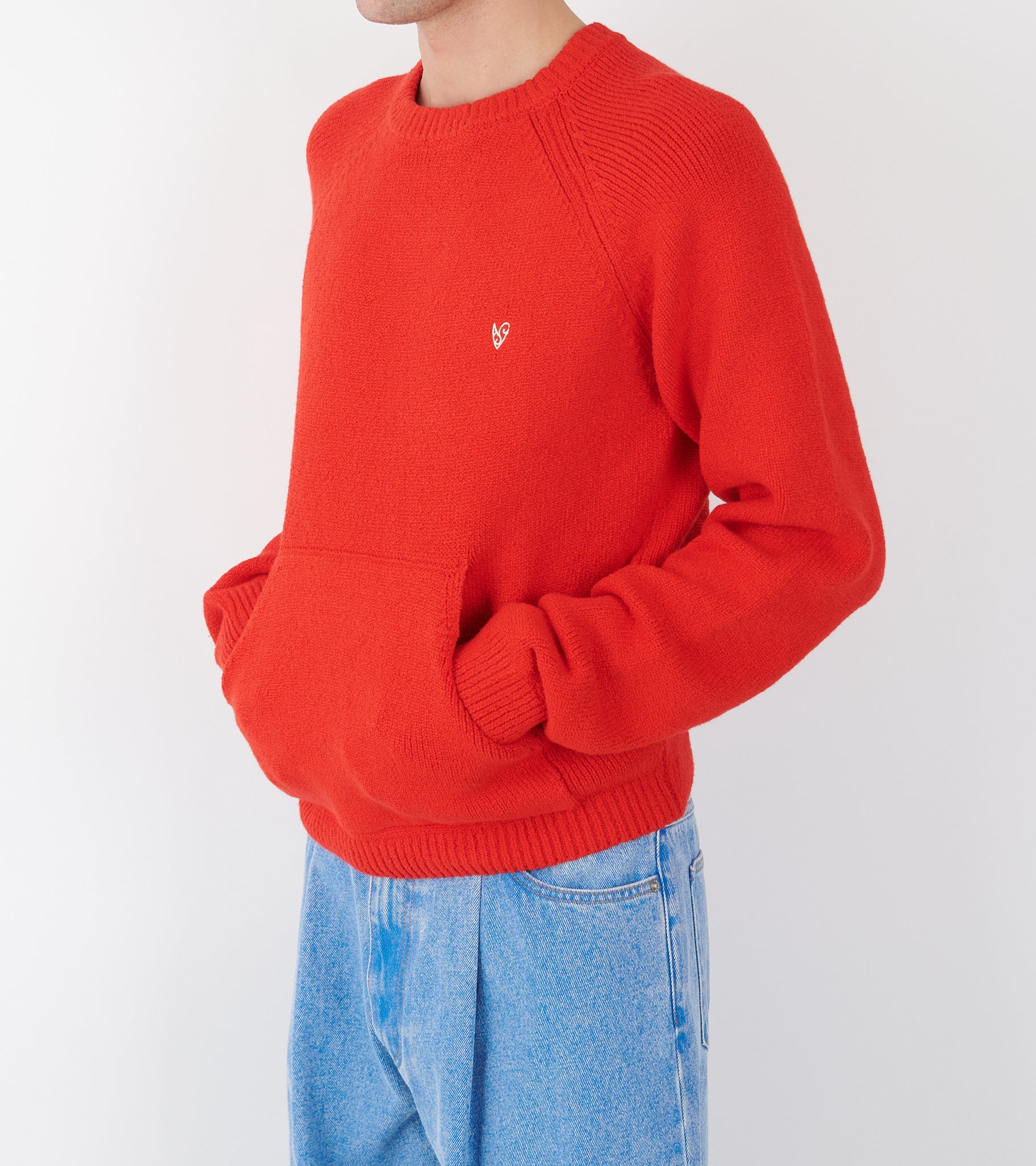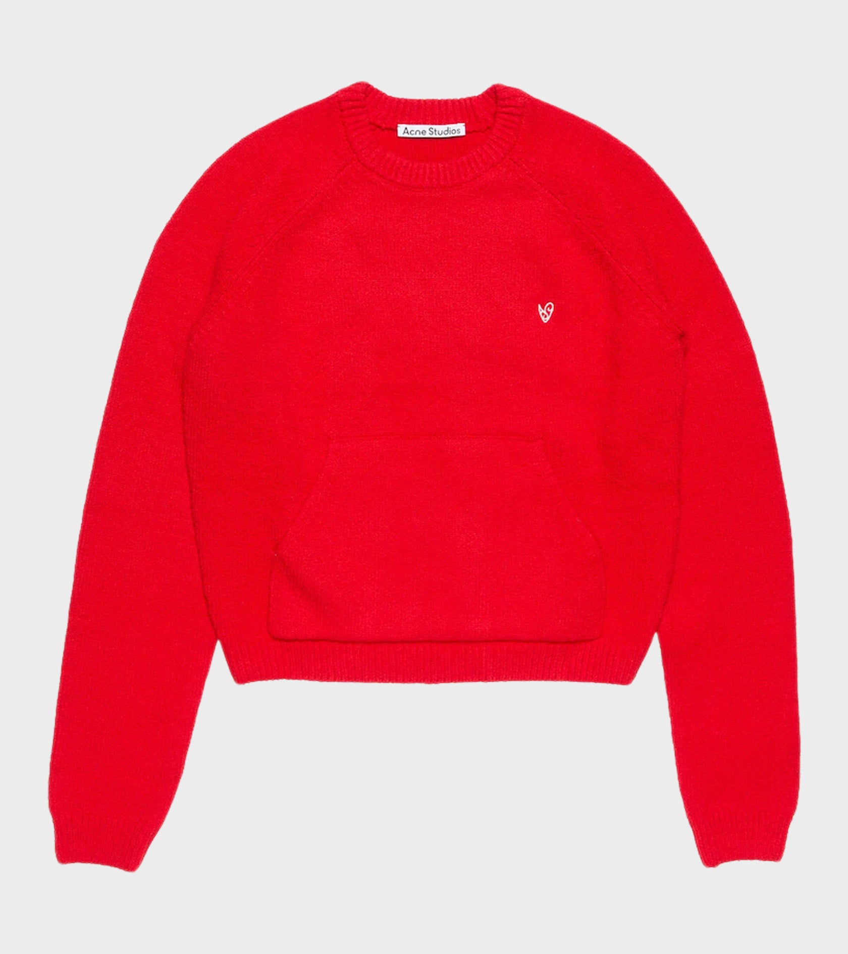 Rød strik i en økologisk bomuldskvalitet med struktur fra Acne Studios. Strikken har en rund hals, ribstrikkede kanter og en kængurulomme på fronten. Ved venstre bryst er et broderet logo.