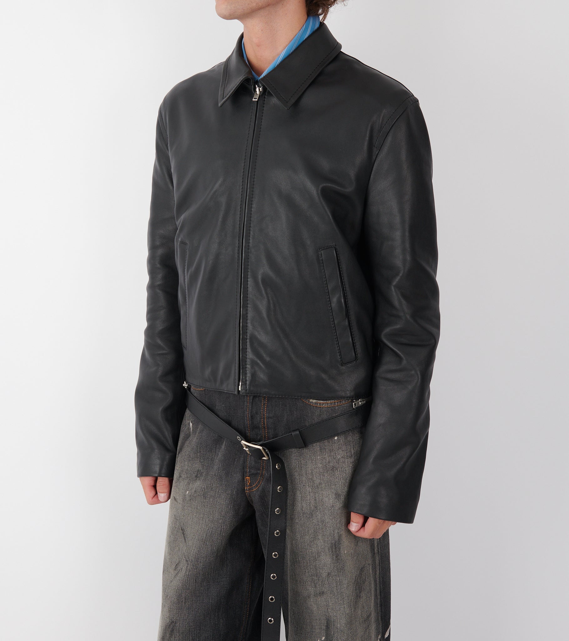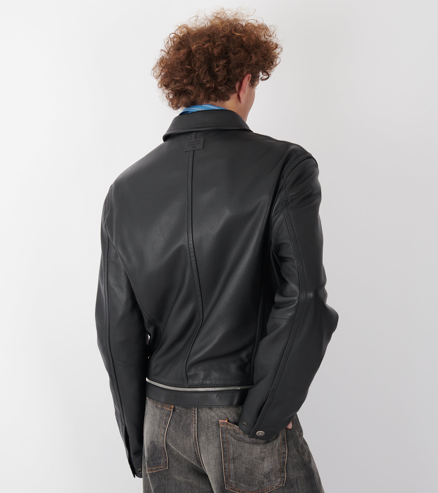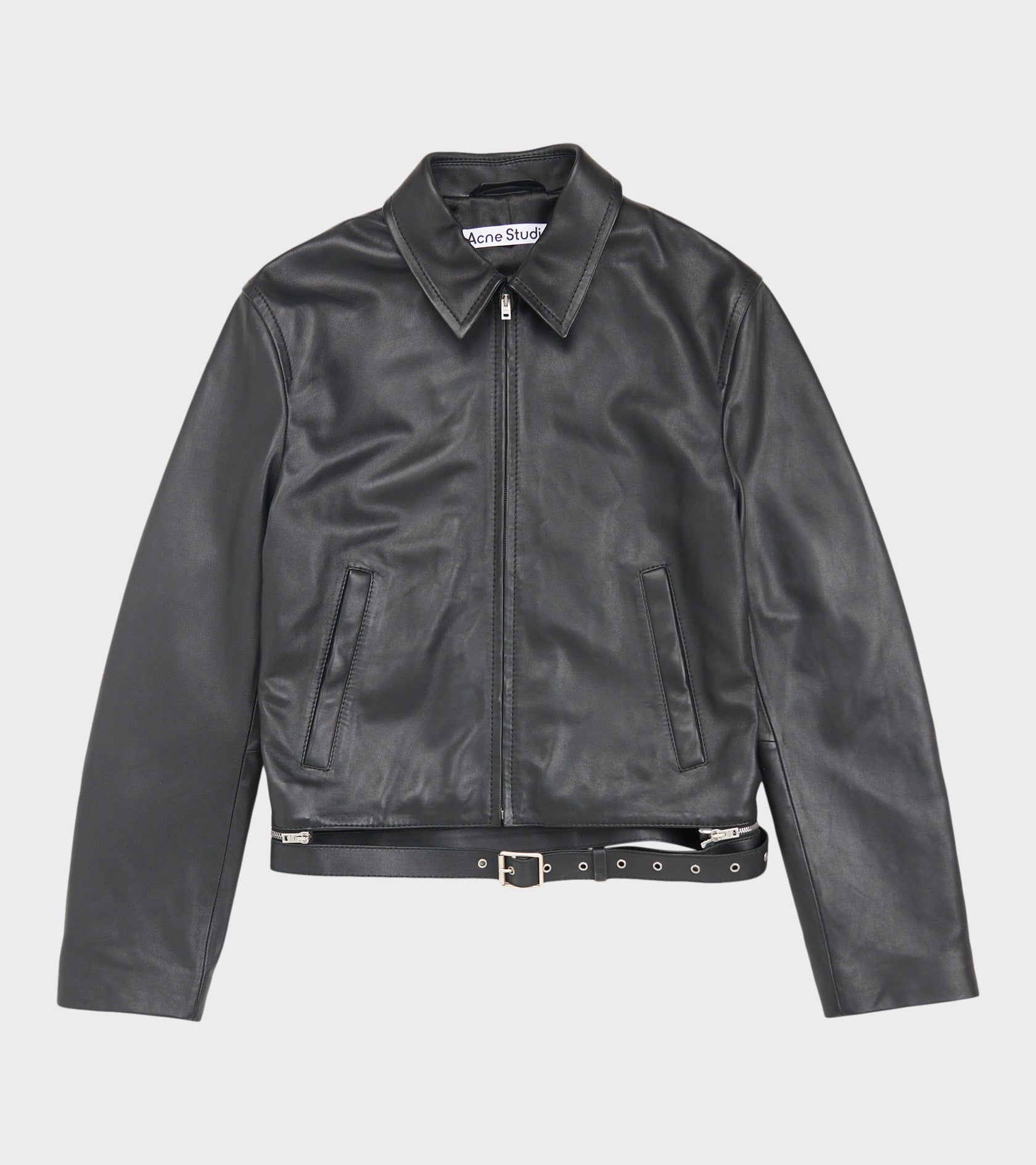 Sort læderjakke i blødt lammelæder fra Acne Studios. Denne læderjakke har en klassisk krave, en lynlåslukning og en lomme med trykknaplukning i hver side. Jakken har sølv hardware og en justerbar bæltedetalje i bunden af jakken. Bæltet kan lynes helt af hvis ønsket. Øverst bagpå er et sort logotag i metal.