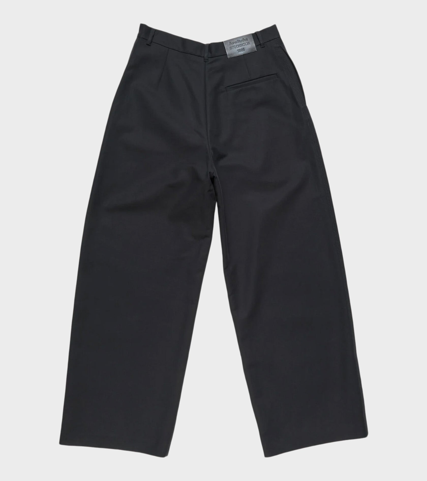 Sorte bukser i økologisk bomuldssatin fra Acne Studios. Bukserne har bæltestropper, en knaplukning øverst på fronten, en skrålomme i hver side samt en stiklomme bagpå. Øverst bagpå er et sort logotag. Bukserne har lange brede ben.