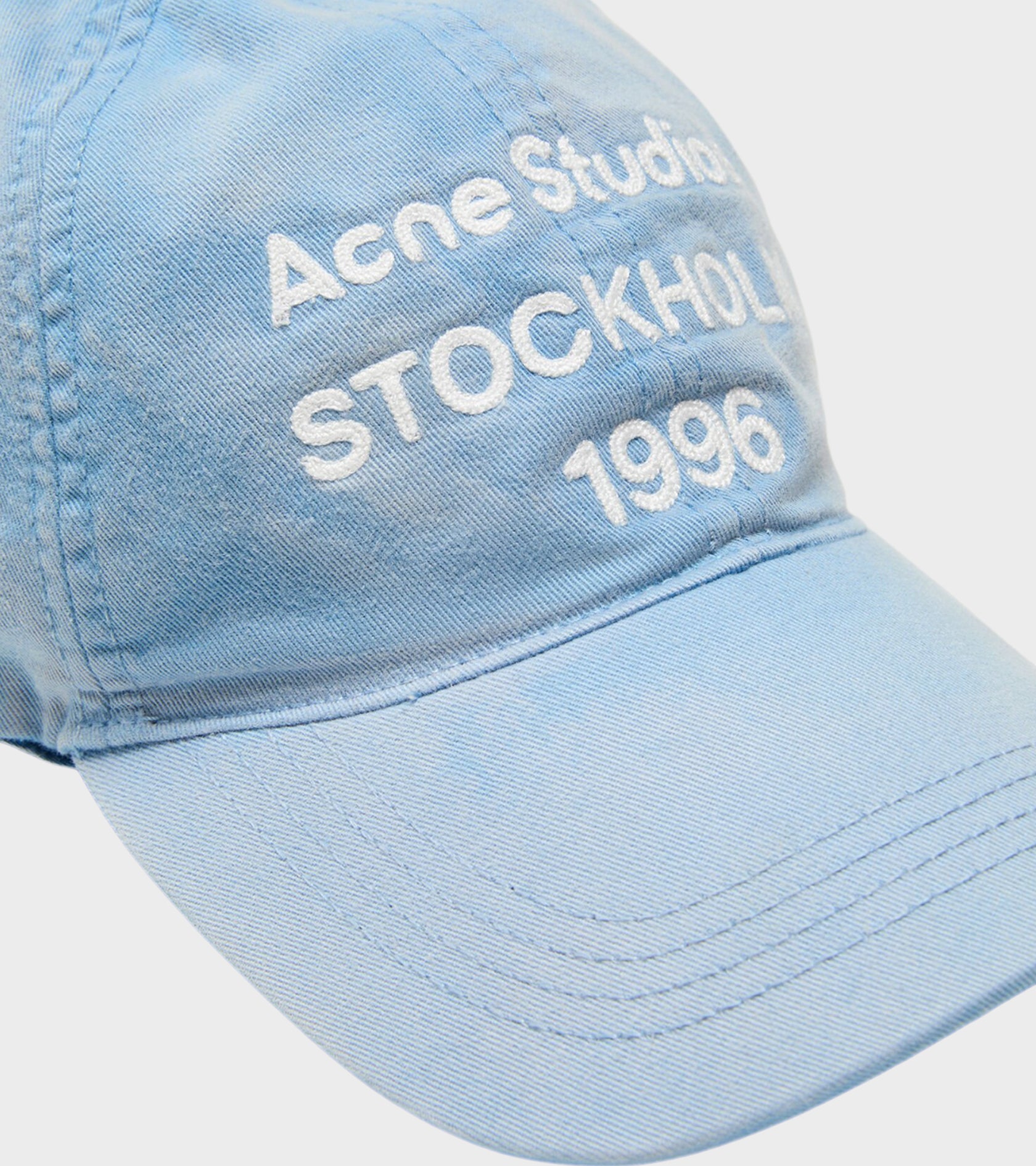 Lyseblå kasket i økologisk bomuld fra Acne Studios. Kasketten er justerbar i størrelsen og har et hvidt broderet logo på fronten.