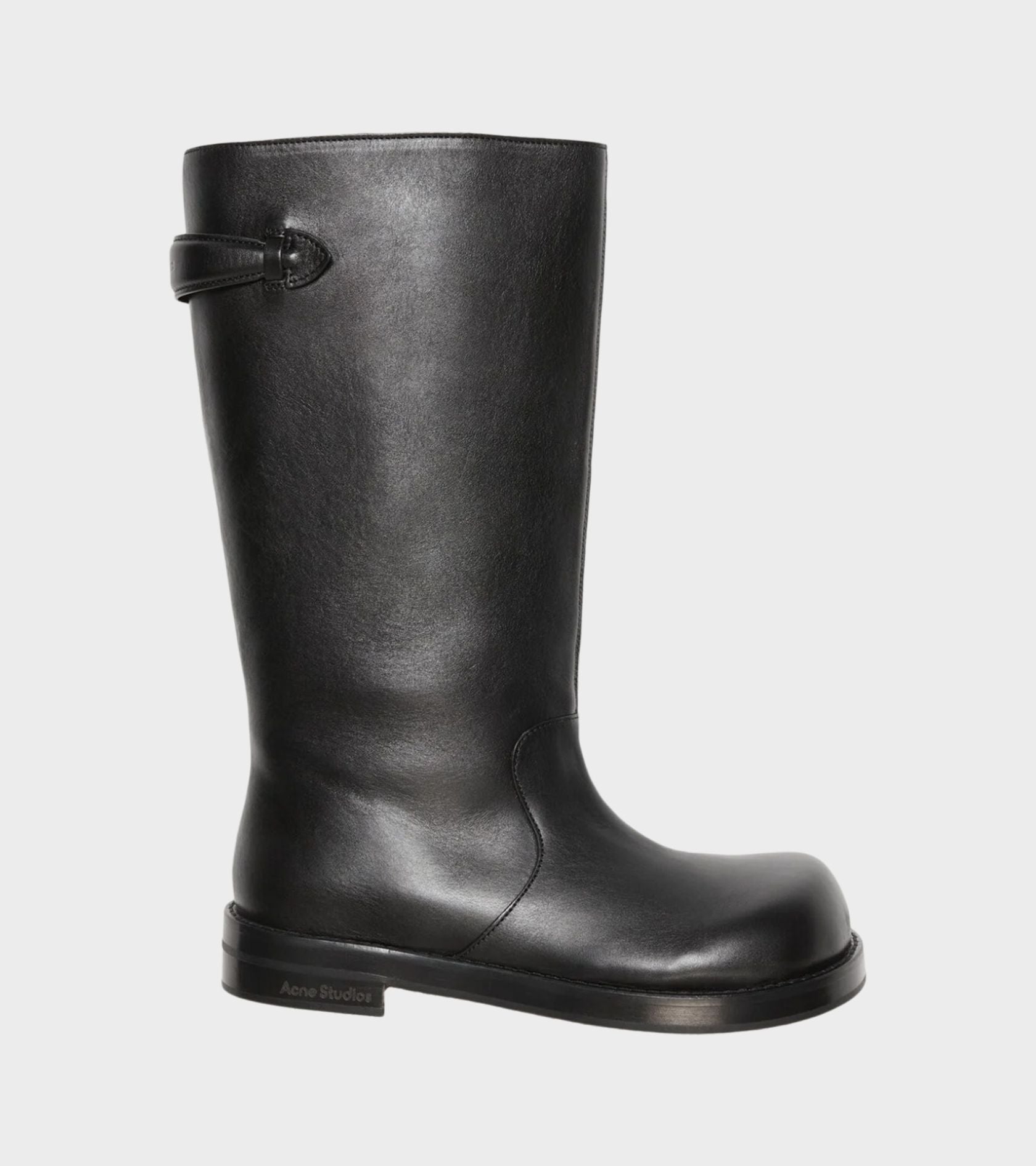 Sorte støvler i kalvelæder fra Acne Studios. Disse støvler har et højt skaft samt en bred rund snude. Øverst bagpå er en stropdetalje. Støvlen har et diskret præget logo på stroppen samt på sålen.