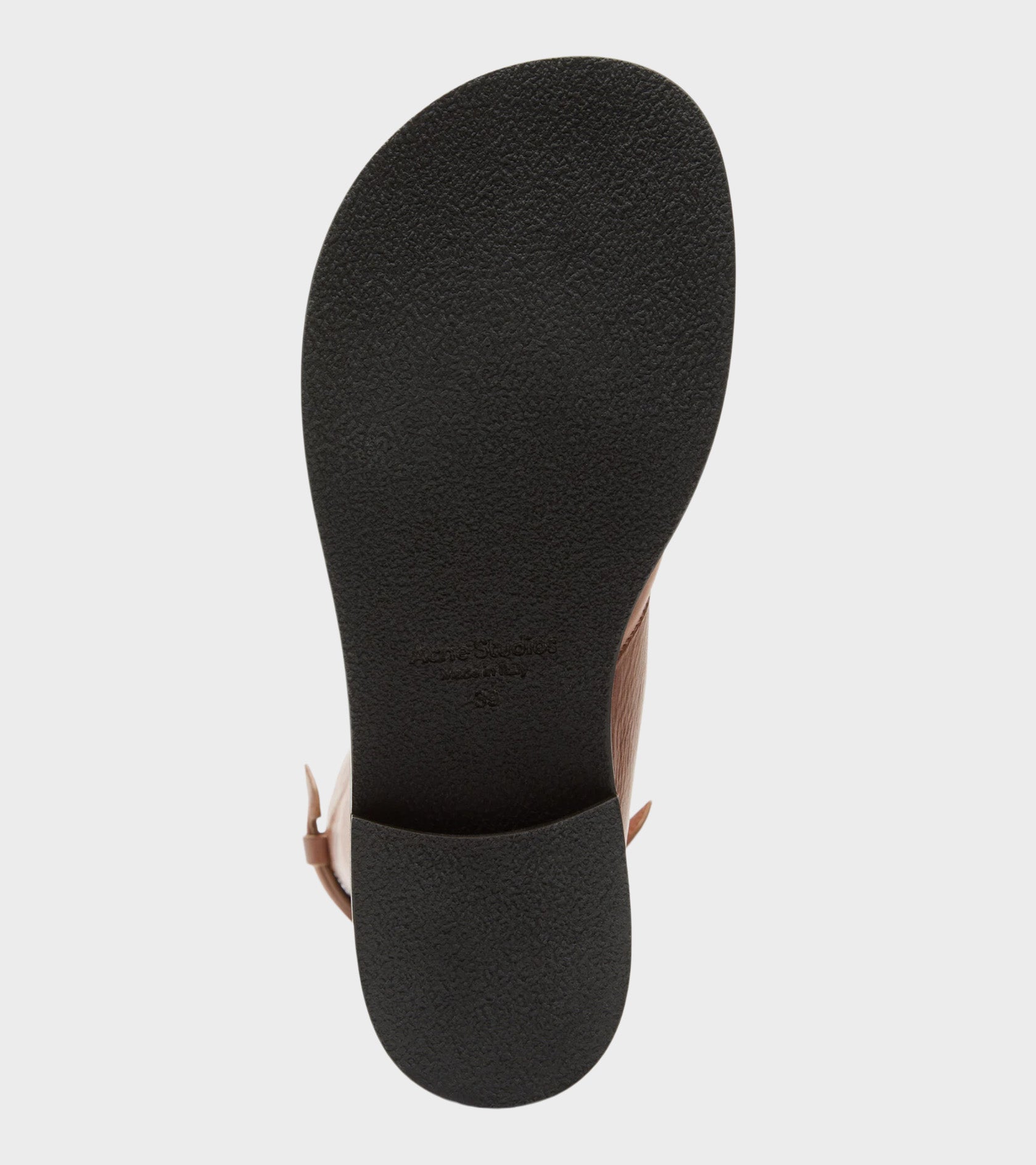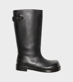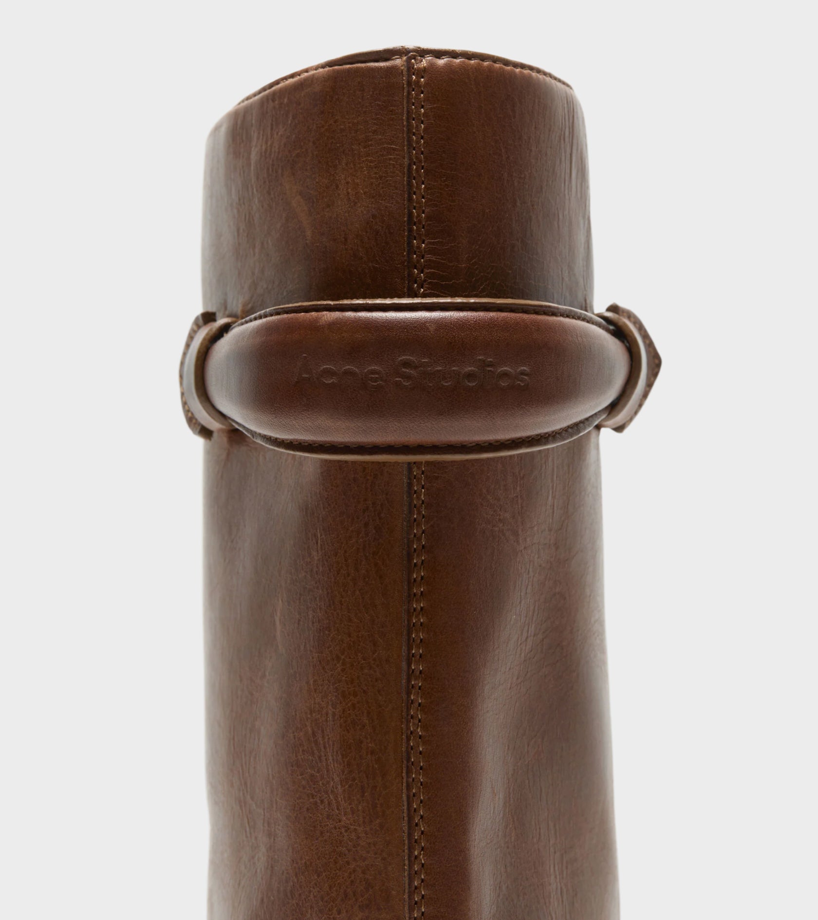 Brune støvler i kalvelæder fra Acne Studios. Disse støvler har et højt skaft samt en bred rund snude. Øverst bagpå er en stropdetalje. Støvlen har et diskret præget logo på stroppen samt på sålen.