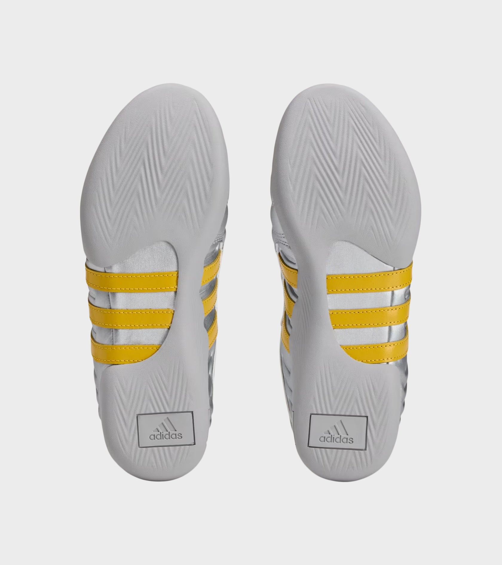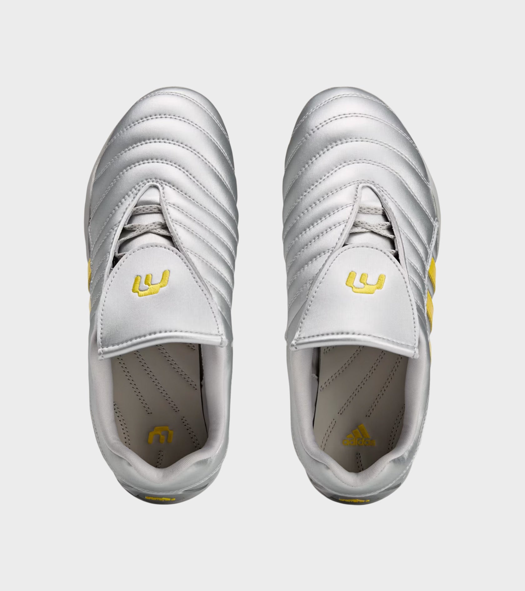 Sølv sneakers fra Adidas i samarbejde med Miaou. Disse sneakers har gule detaljer, de ikoniske tre striber på siden, et Adidas-logo på hælen samt et broderet Miaou-logo på tungen.
