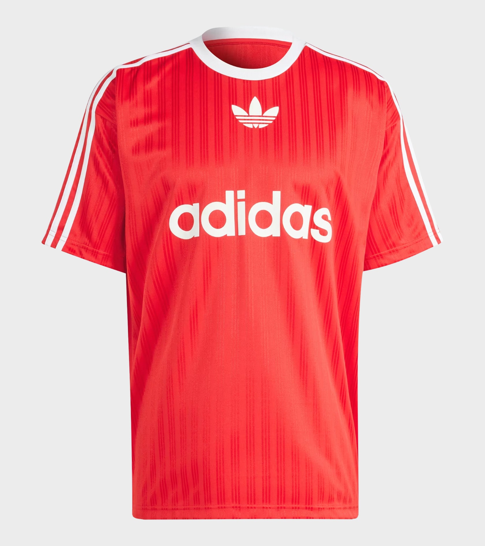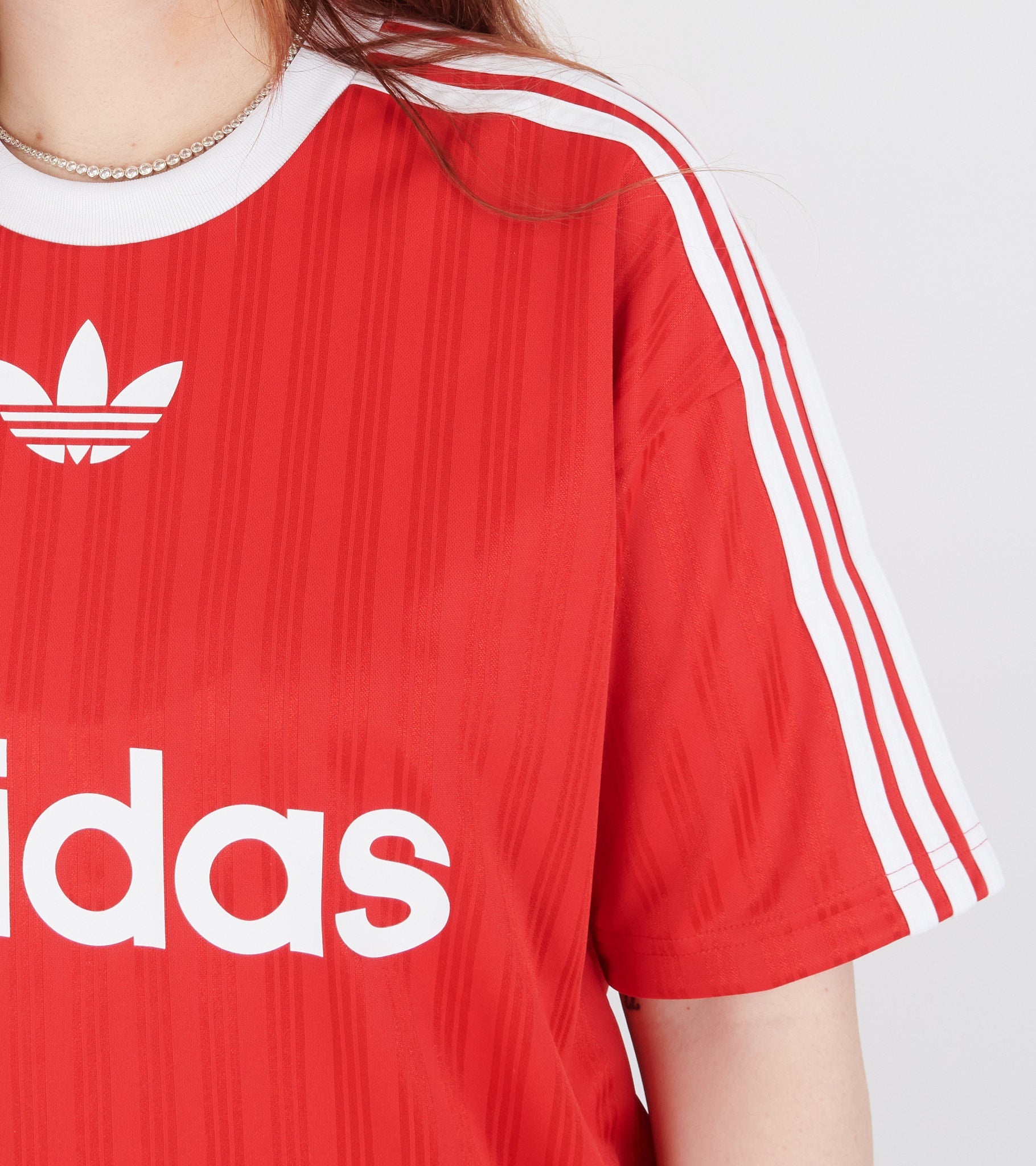 Rød unisex t-shirt i genanvendt polyester fra Adidas. Denne t-shirt har tone-i-tone striber, en rund hals, og printede logoer i hvid på fronten. Langs ærmerne er de ikoniske striber i hvid. Pasformen er afslappet.