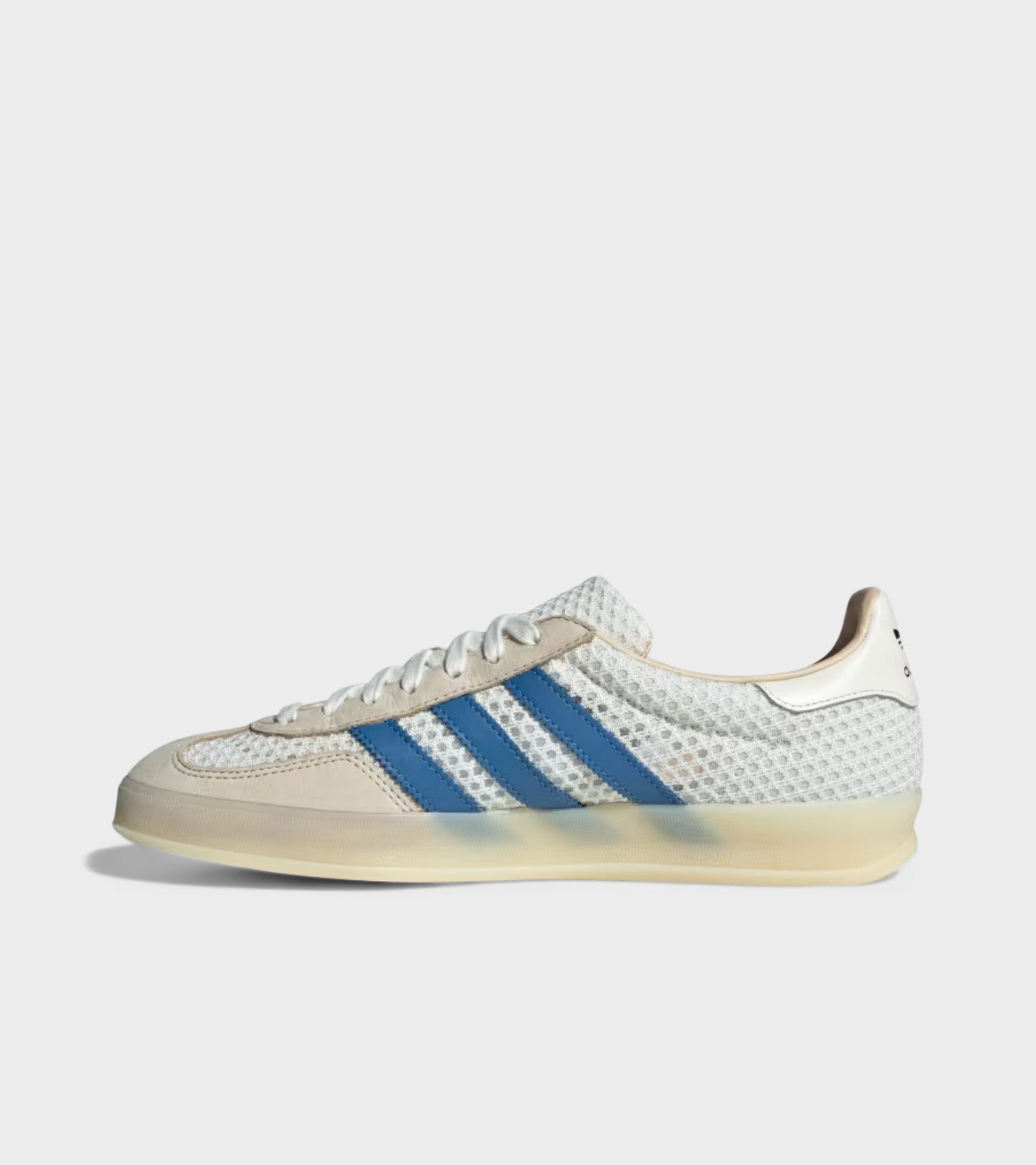 Gazelle Indoor fra Adidas i en råhvid og hvid farvekombination med blå detaljer.