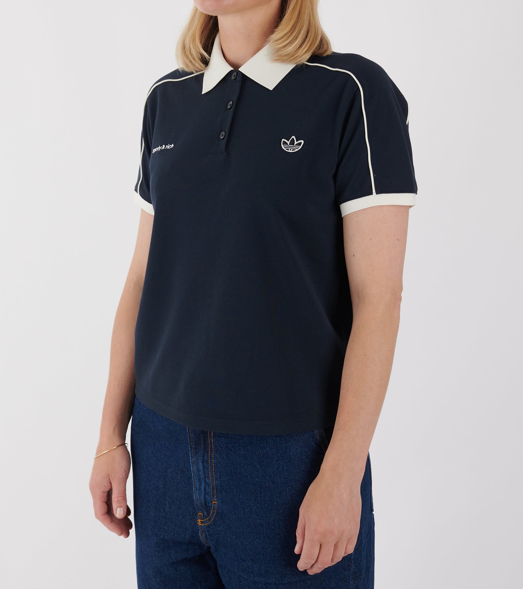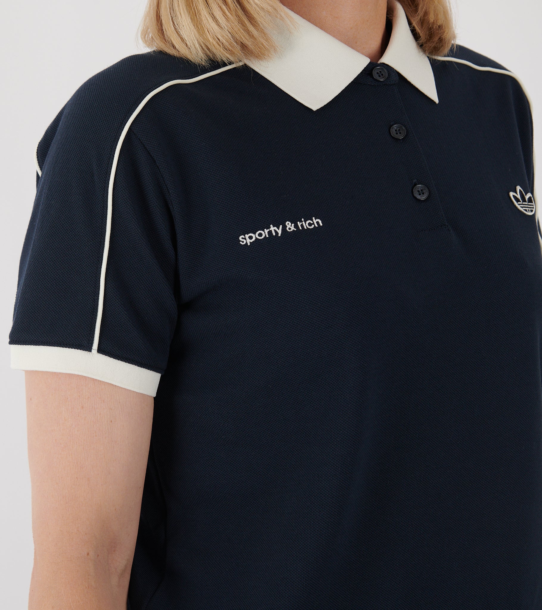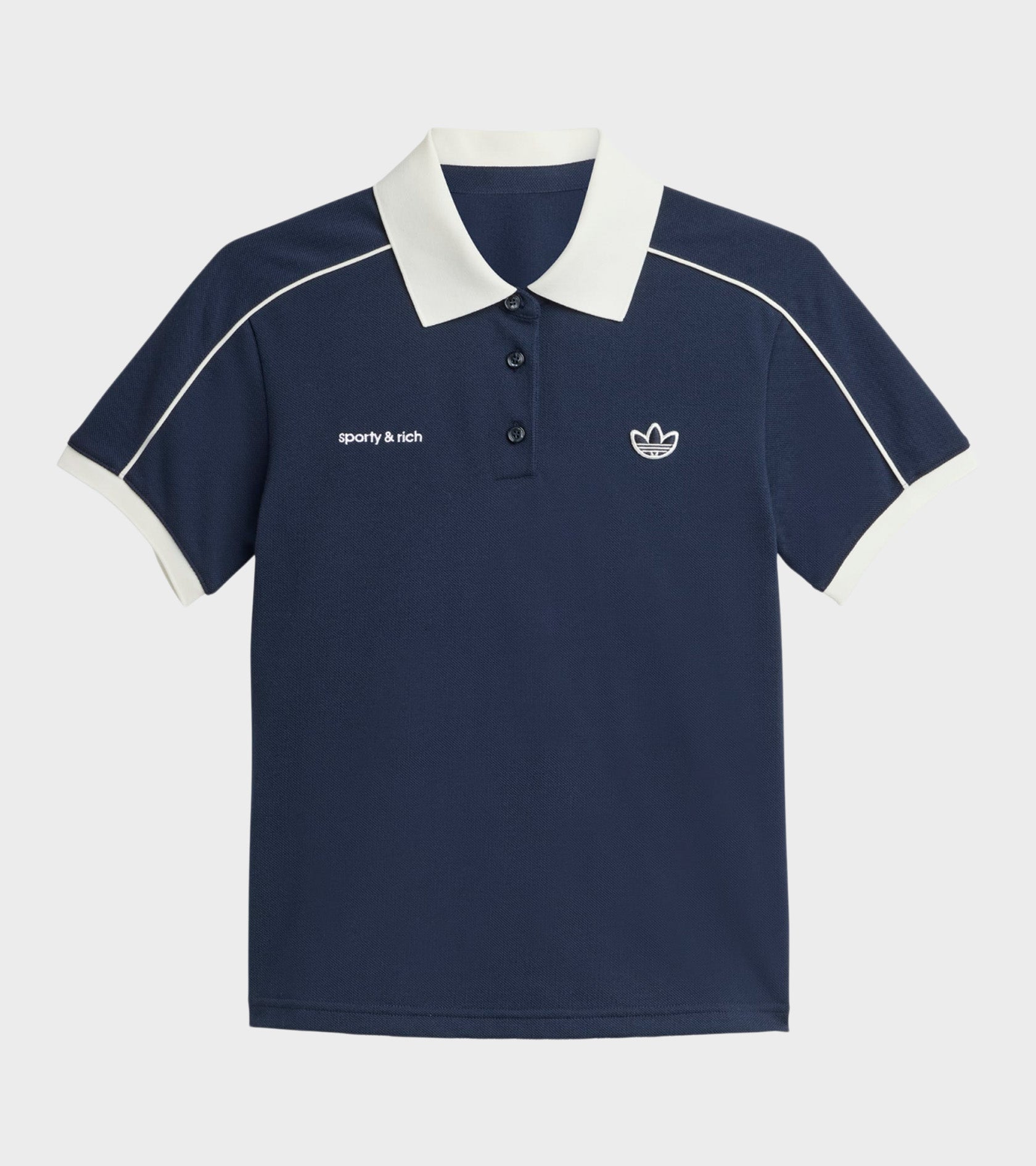 Navy kortærmet polo fra Adidas i samarbejde med Sporty & Rich. Poloen er fremstillet i en bomuldspiqué-kvalitet og har en hvid polokrave, en knaplukning, hvide kontrast striber og to broderede logoer på fronten.