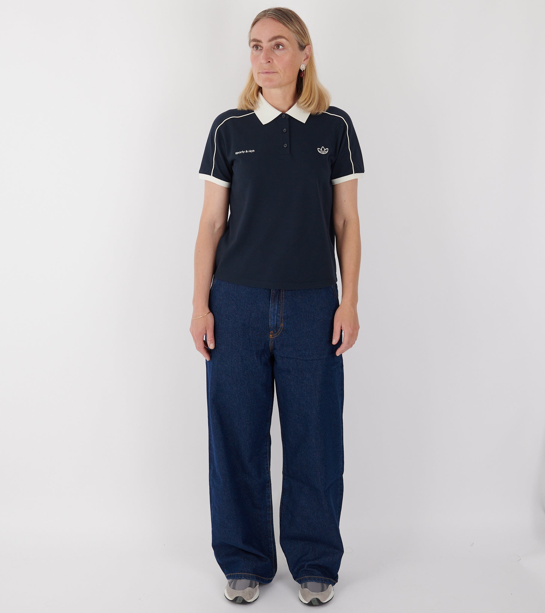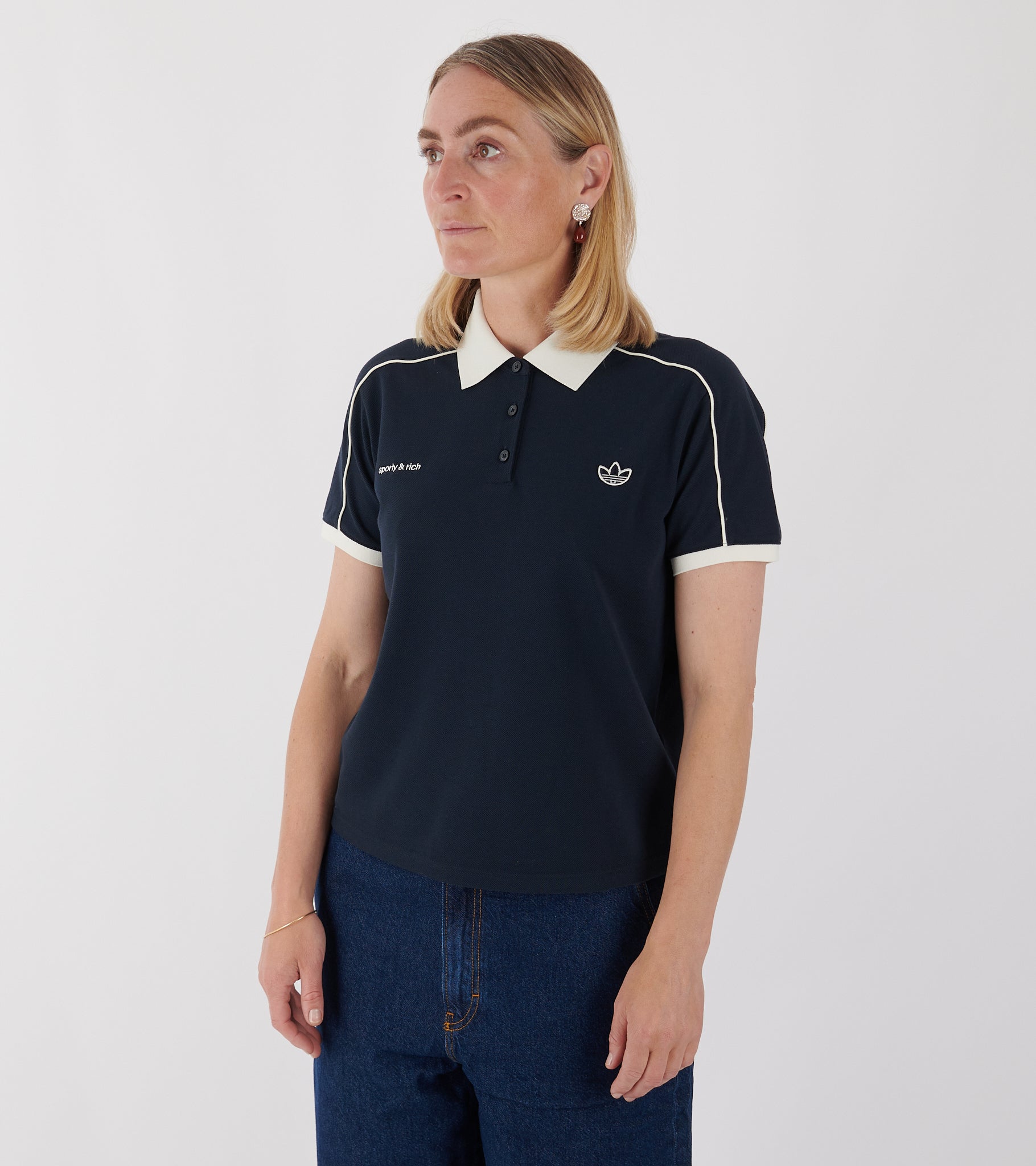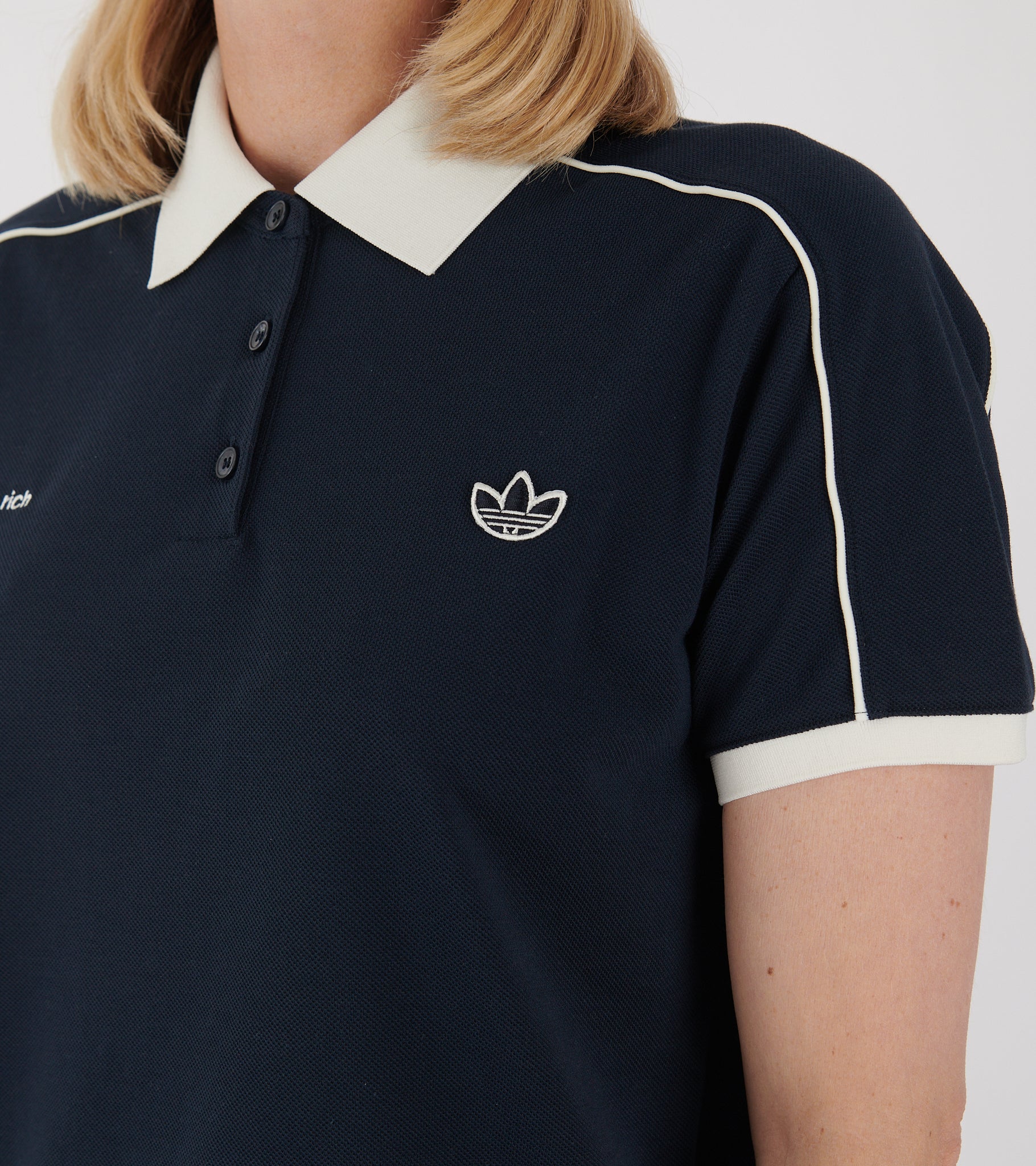 Navy kortærmet polo fra Adidas i samarbejde med Sporty & Rich. Poloen er fremstillet i en bomuldspiqué-kvalitet og har en hvid polokrave, en knaplukning, hvide kontrast striber og to broderede logoer på fronten.