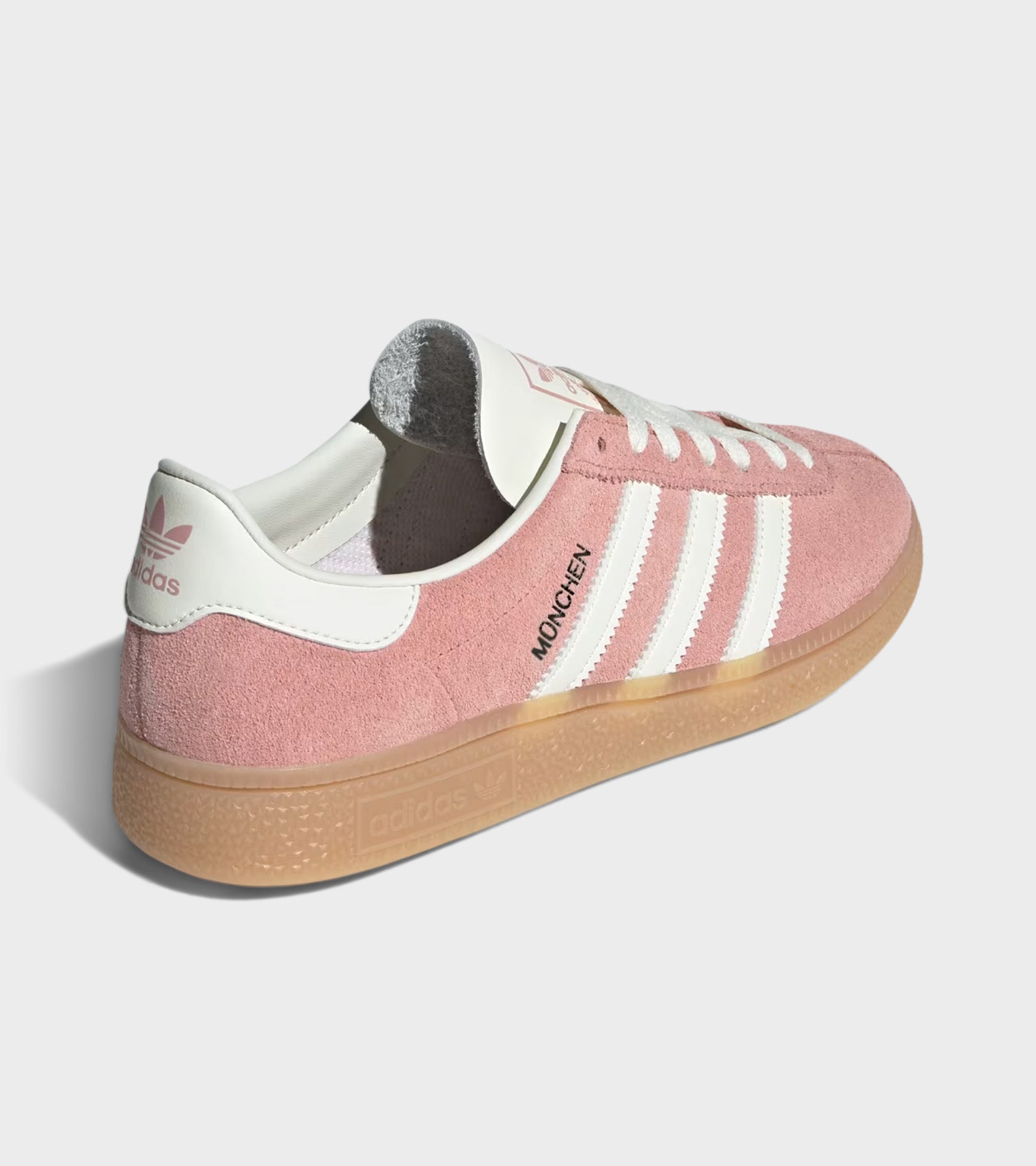 Modellen 'München' fra Adidas i en rosa nuance med hvide detaljer. Skoen har en overdel i ruskind samt hvide detaljer i læder. På siden er de ikoniske striber samt 'München' printet i sølv. På tungen og hælen er et rosa logo.
