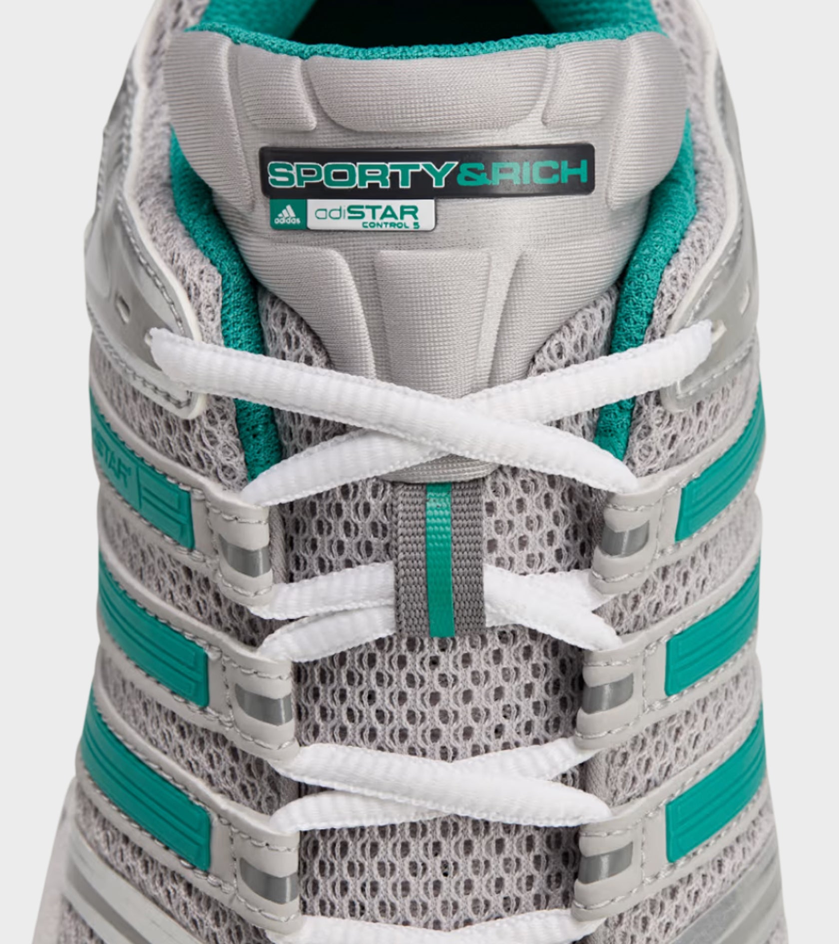 Adistar Control 5 fra Adidas i samarbejde med Sporty & Rich. Disse sneakers har en overdel i gråt mesh samt detaljer i sølv og en teal blågrøn nuance. På siden er de ikoniske striber.