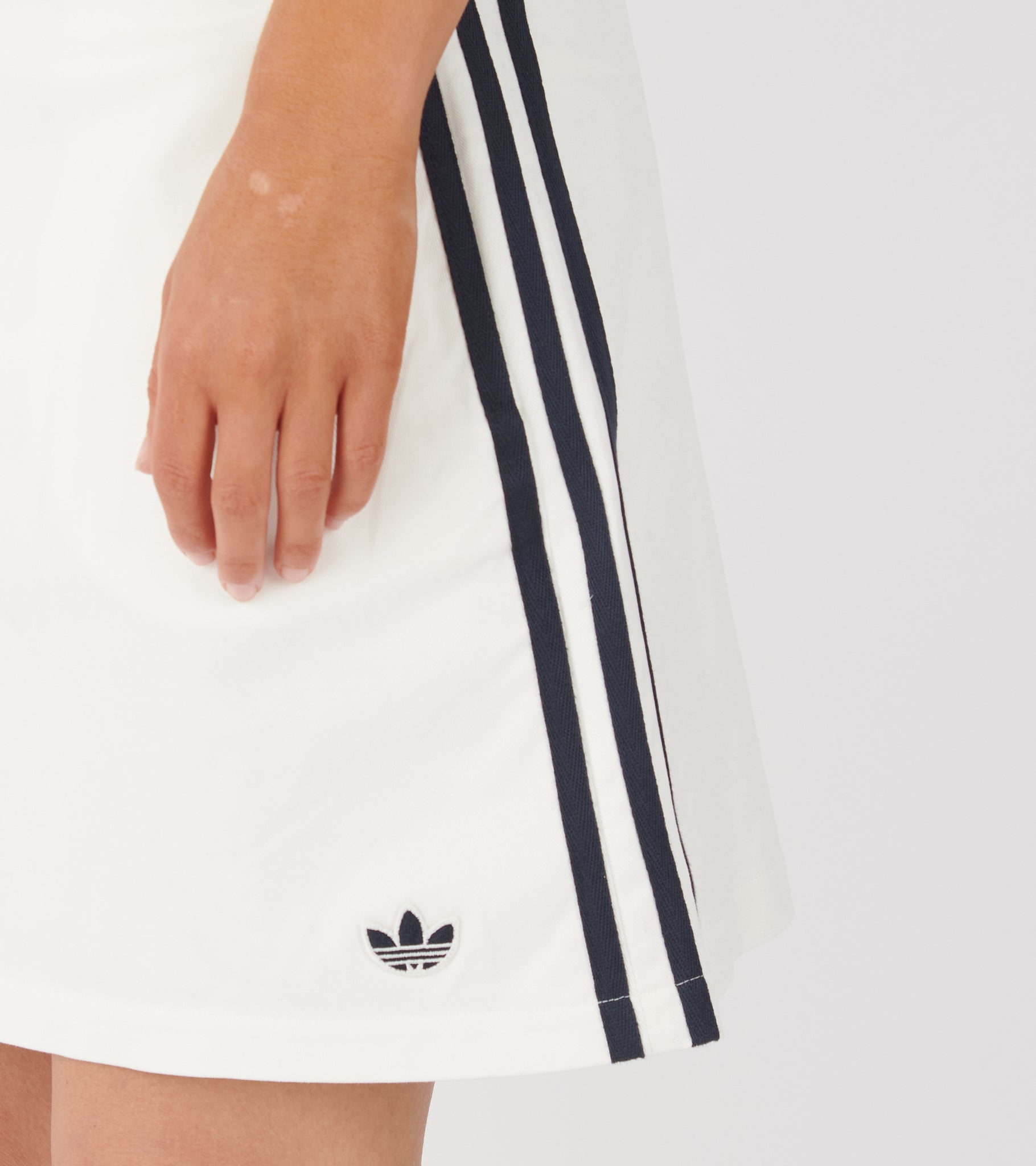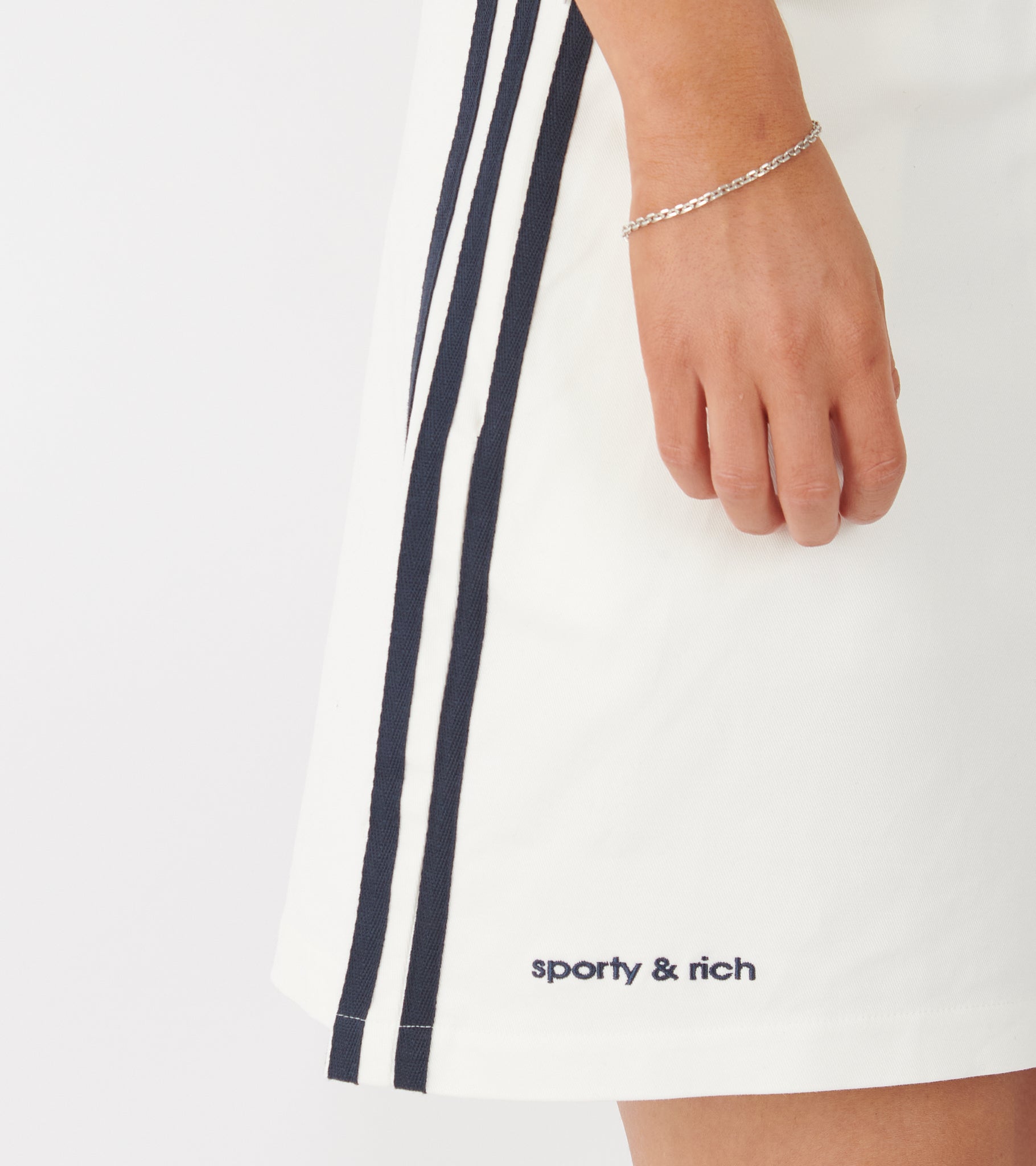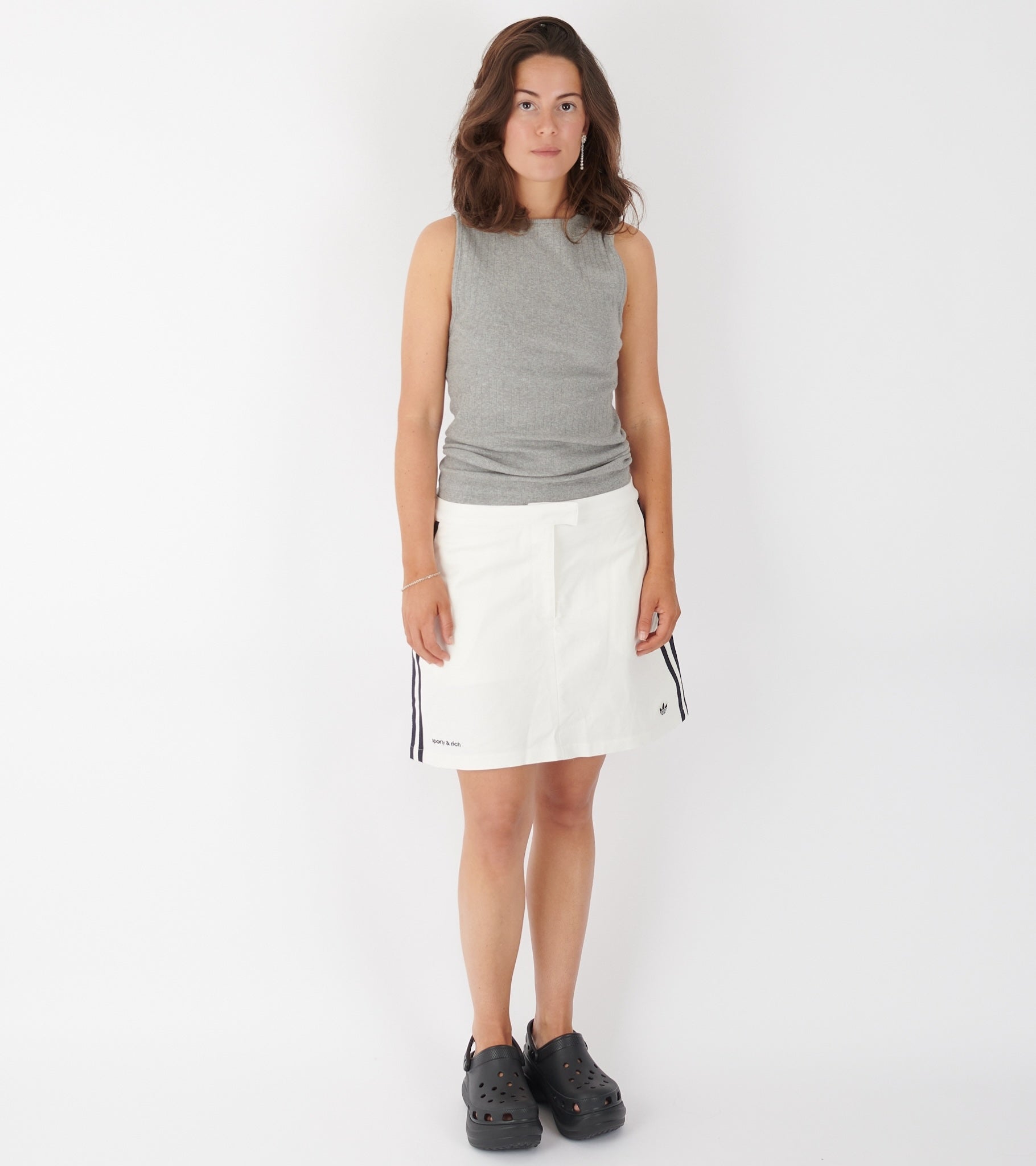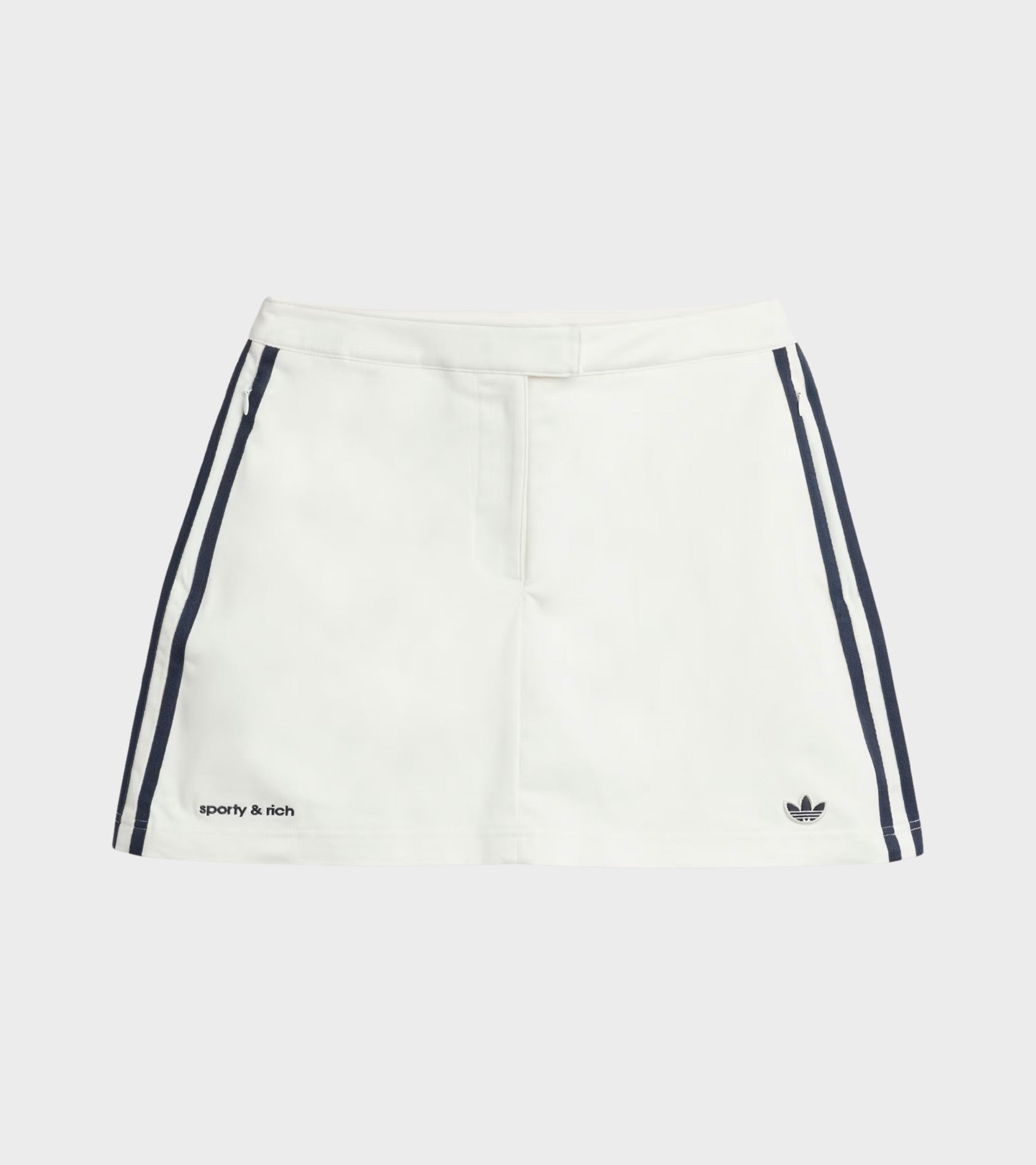 Hvid nederdel med indershorts under fra Adidas i samarbejde med Sporty & Rich. Nederdelen har de ikoniske Adidas striber ned langs siderne og 'Sporty & Rich' logo broderet foran.