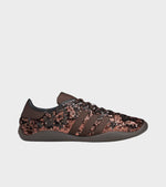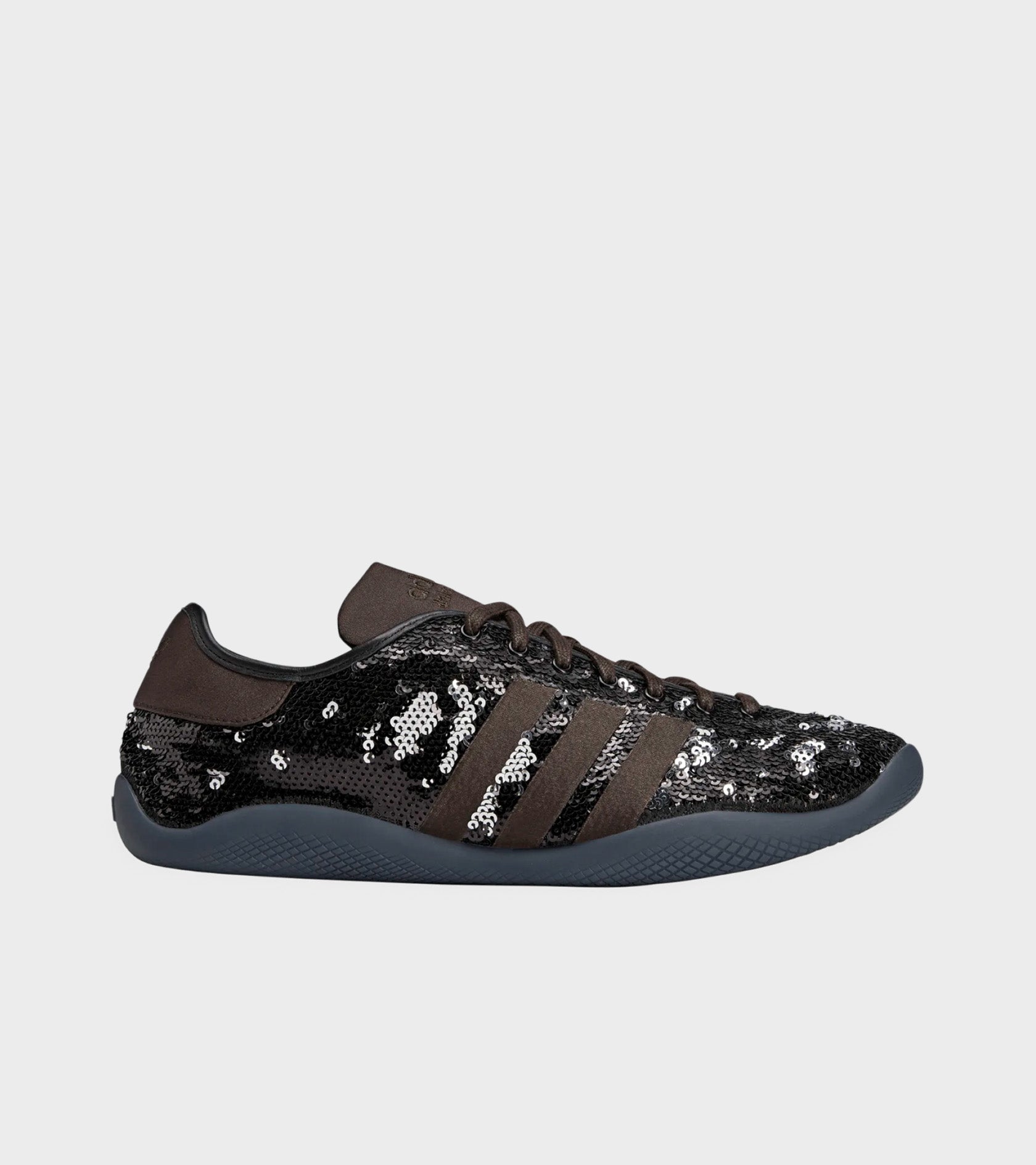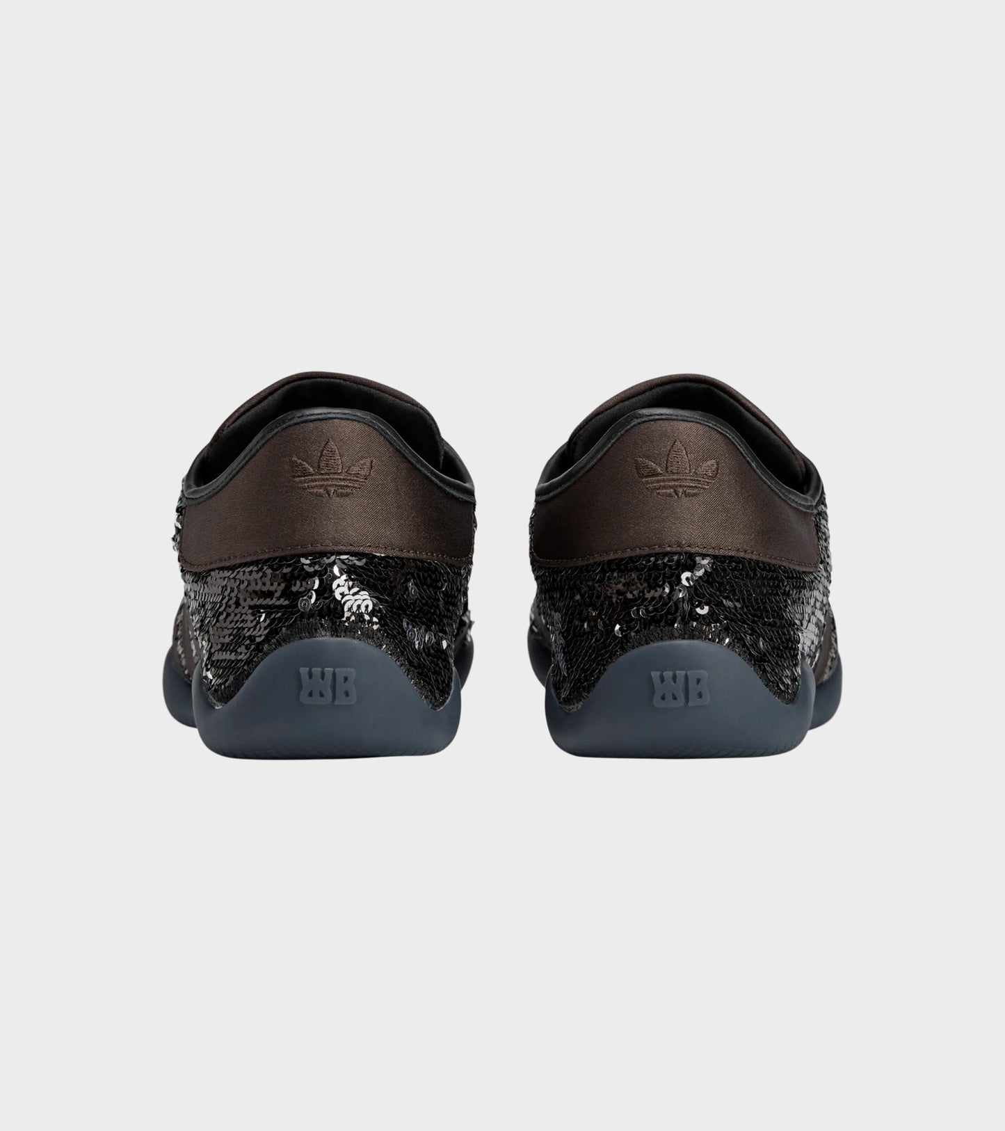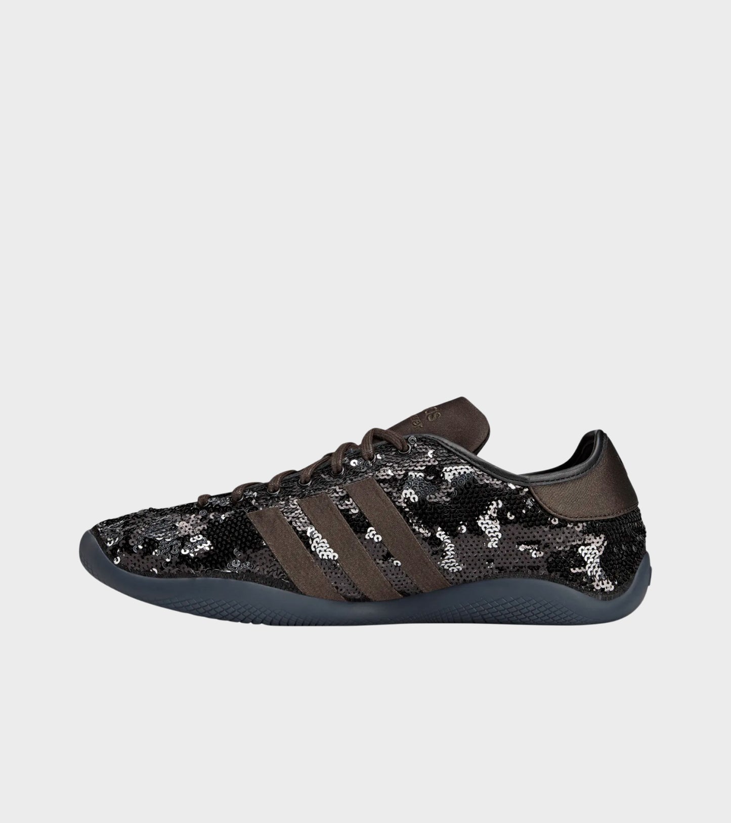 Sneakers med pailletter fra Adidas i samarbejde med Wales Bonner. Disse sneakers har mørkebrune detaljer, de ikoniske striber på siderne og et broderet logo på tungen samt hælen. Bagpå sålen er et Wales Bonner logo.