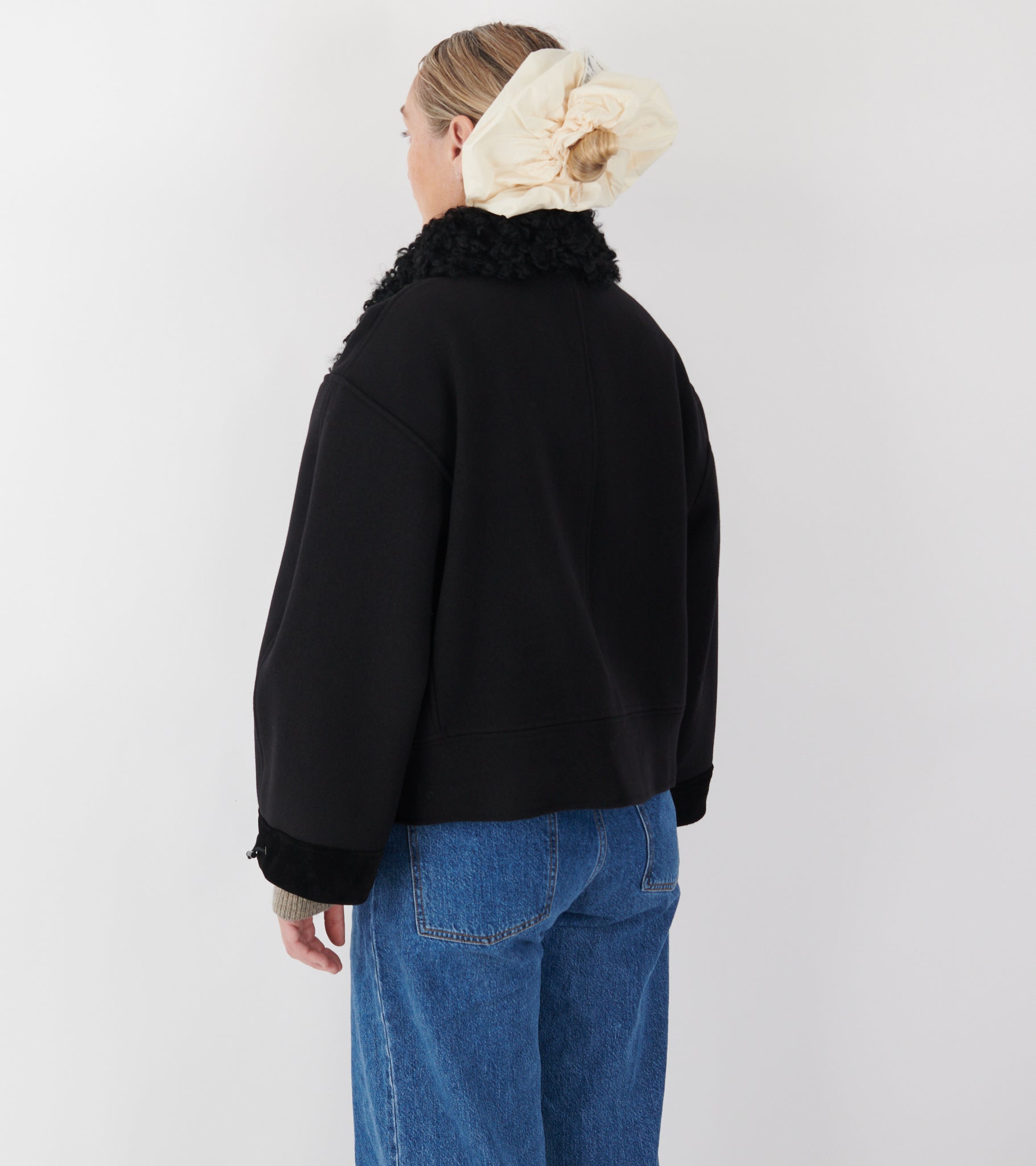 Sort jakke i engelsk 'Hainsworth' merinould fra AF Agger. Jakken har en krave med sort lamme-shearling, en knaplukning med aflange sorte knapper, en brystlomme samt ruskindsdetaljer i ærmernes ender.