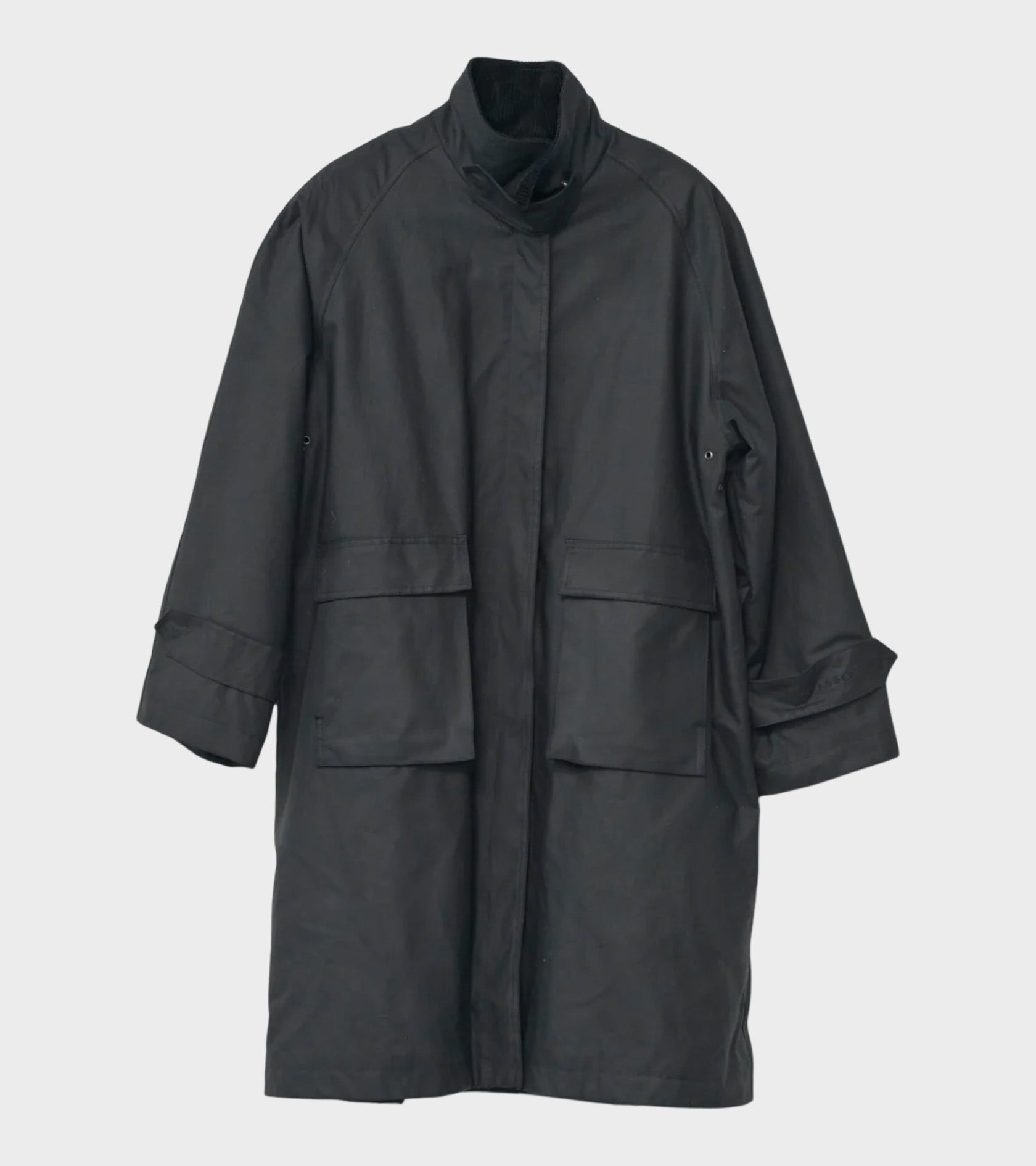 Sort frakke i oilskin fra AF Agger. Denne frakke er fremstillet i oliebehandlet bomuld fra England og er foret med uld på indersiden. Frakken har en krave i bomuldsfløjl, en stropdetalje øverst ved kraven, en skjult lynlås- og knaplukning, to lommer på fronten samt strop-detaljer på ærmerne. På det ene ærme er et diskret sort broderet logo.