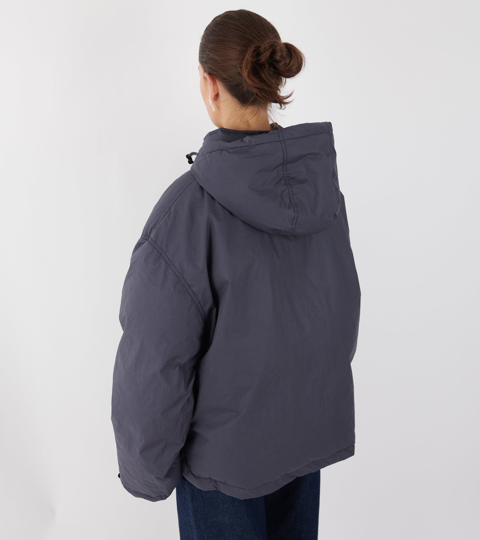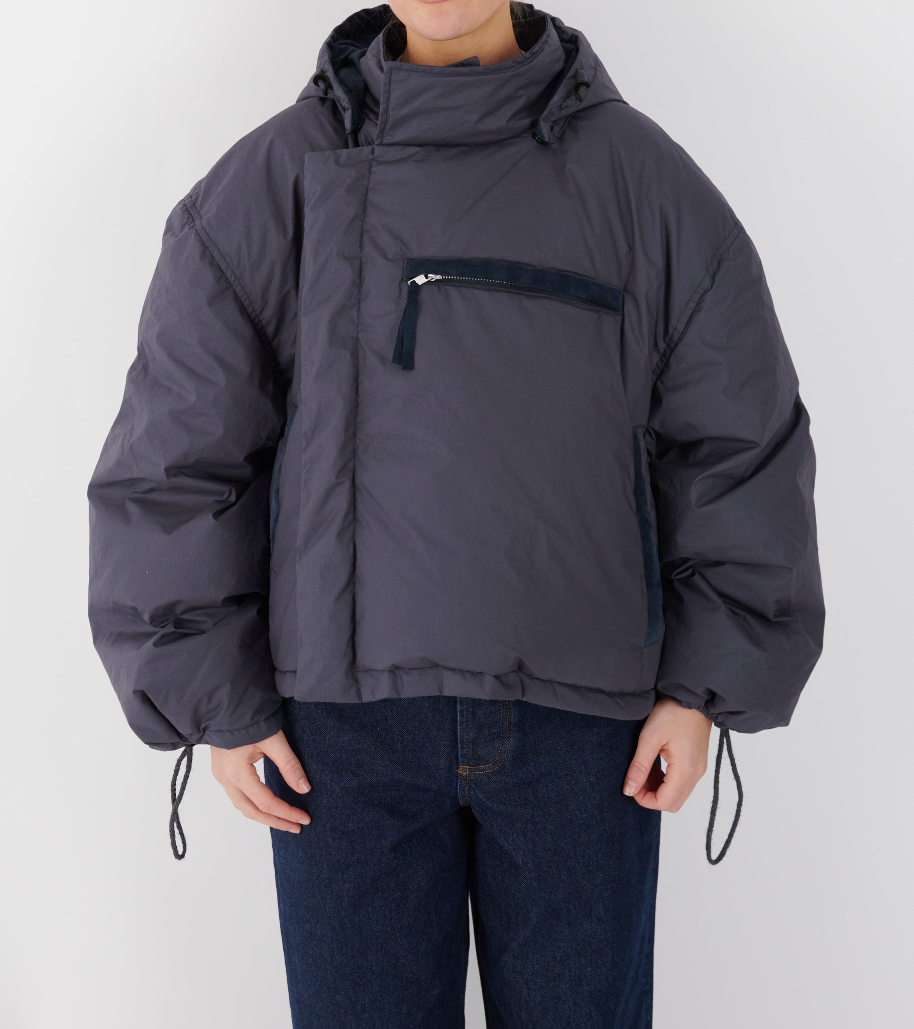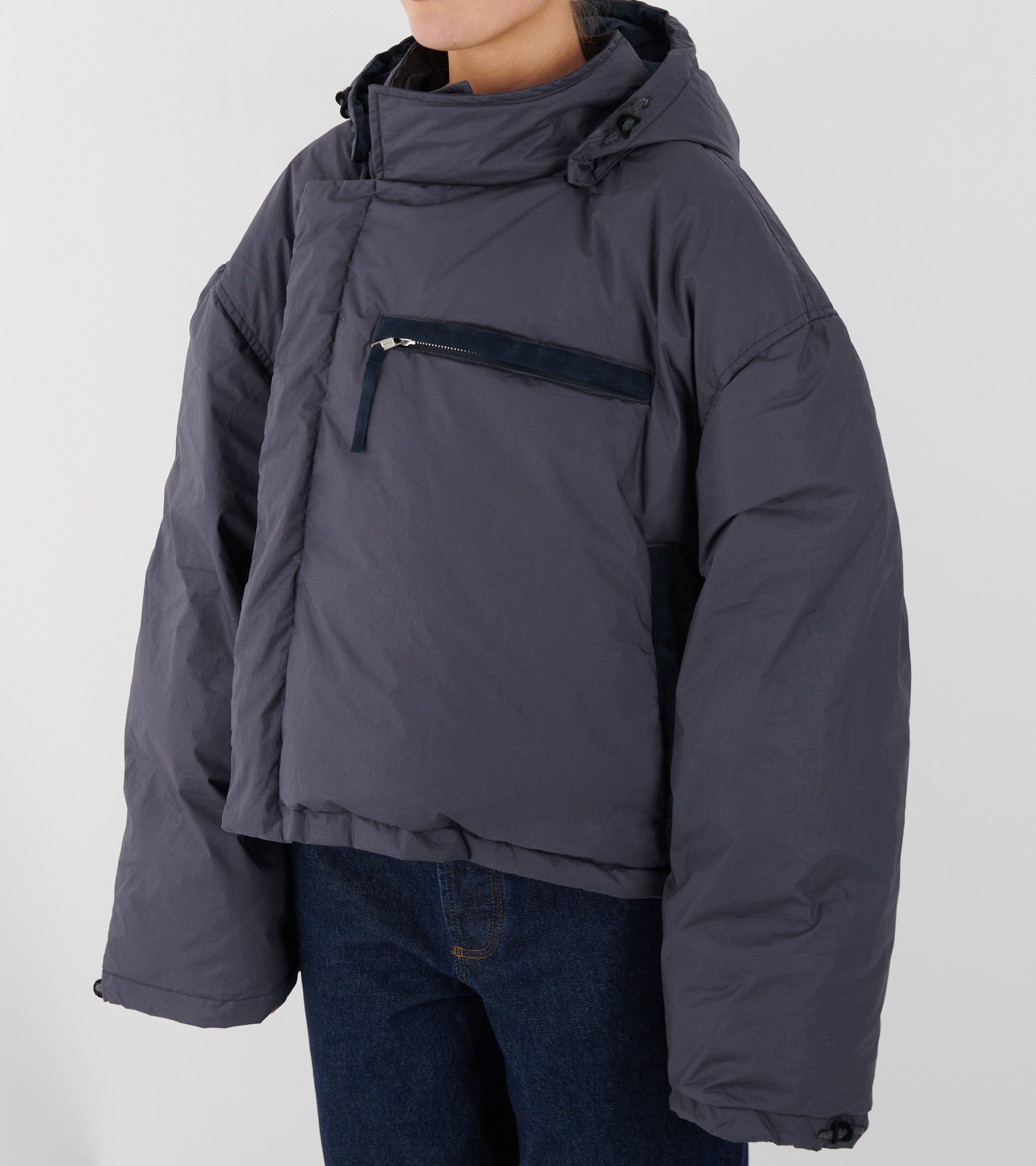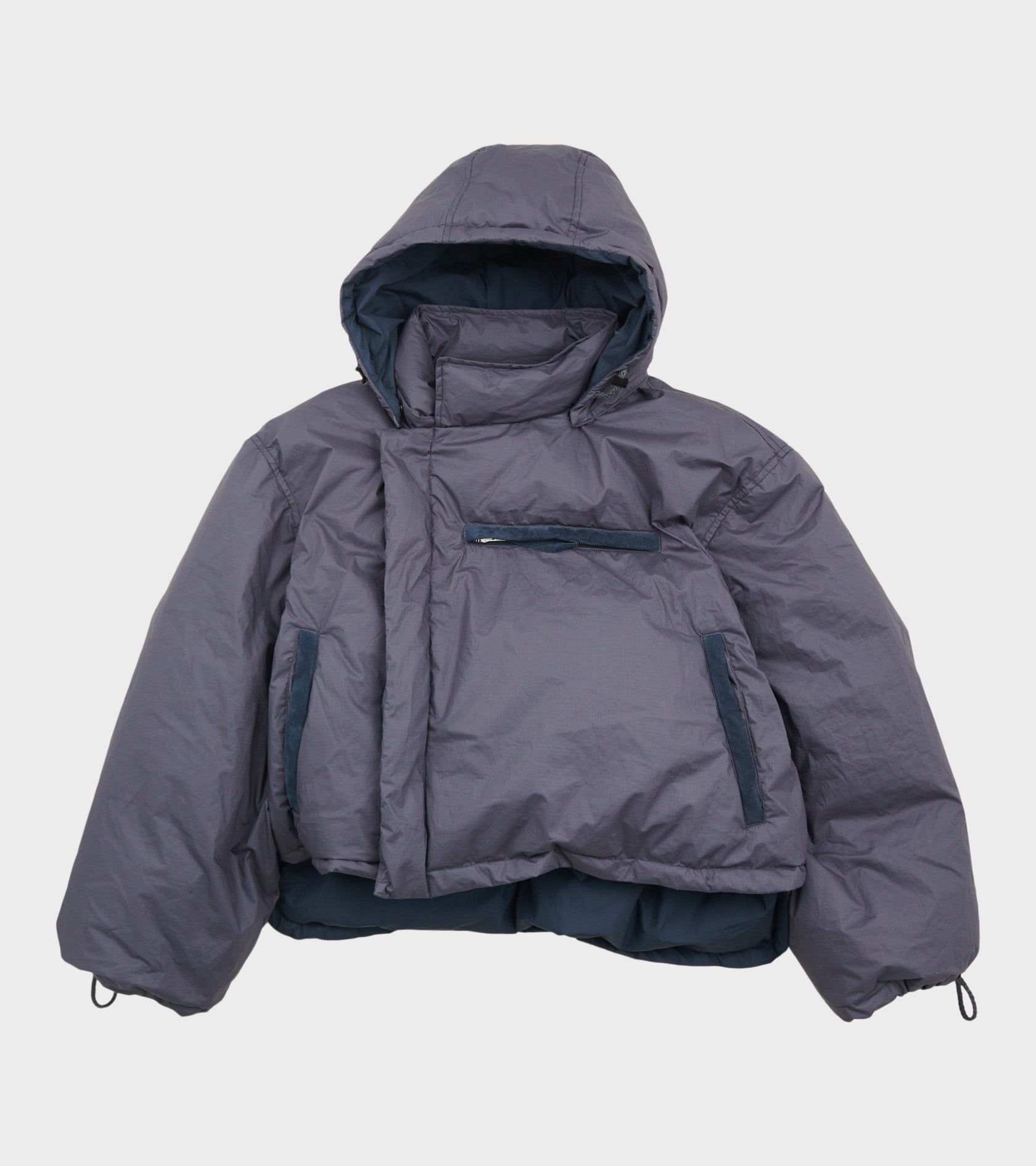 Navy dunjakke fra AF Agger. Denne dunjakke er fremstillet i økologisk bomuldsripstop og er foret med genanvendt dun. Jakken har navy ruskindsdetaljer, en aftagelig hætte, en skjult lynlås- og trykknaplukning, en lynlåslomme i hver side, en lynlåslomme på fronten samt justerbar elastik i ærmernes ender. Jakken har en indvendig wind-stopper detalje i bunden.