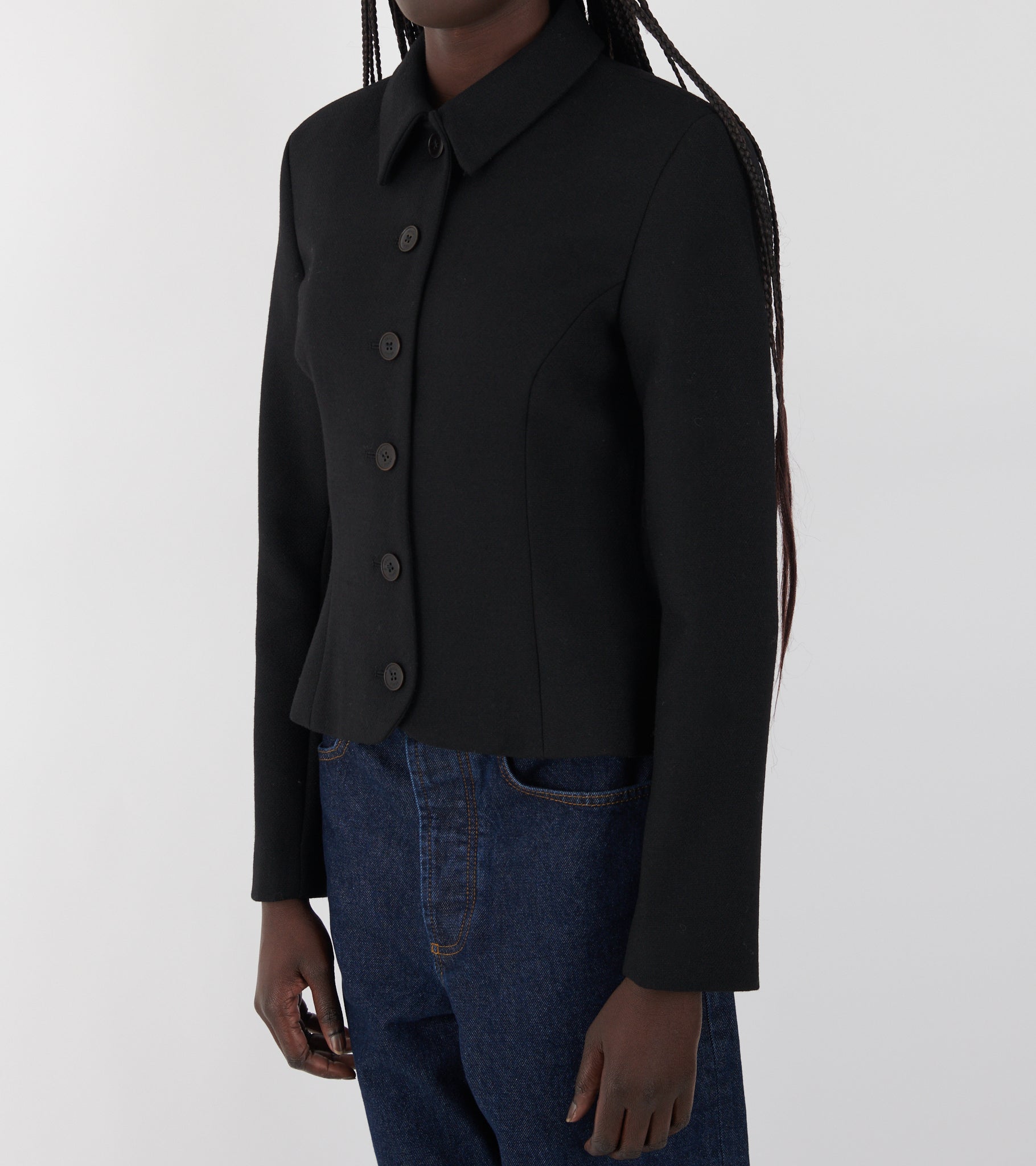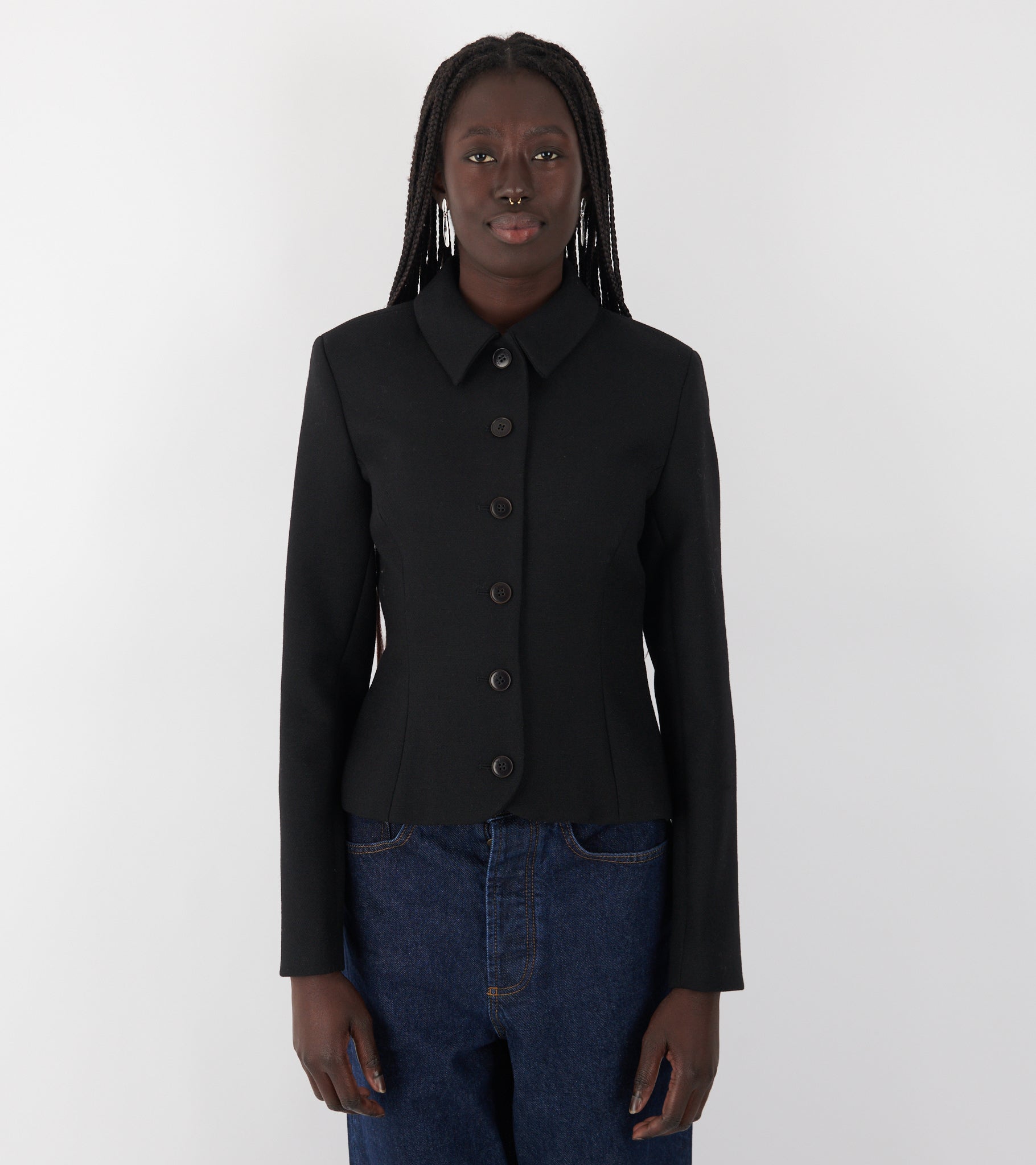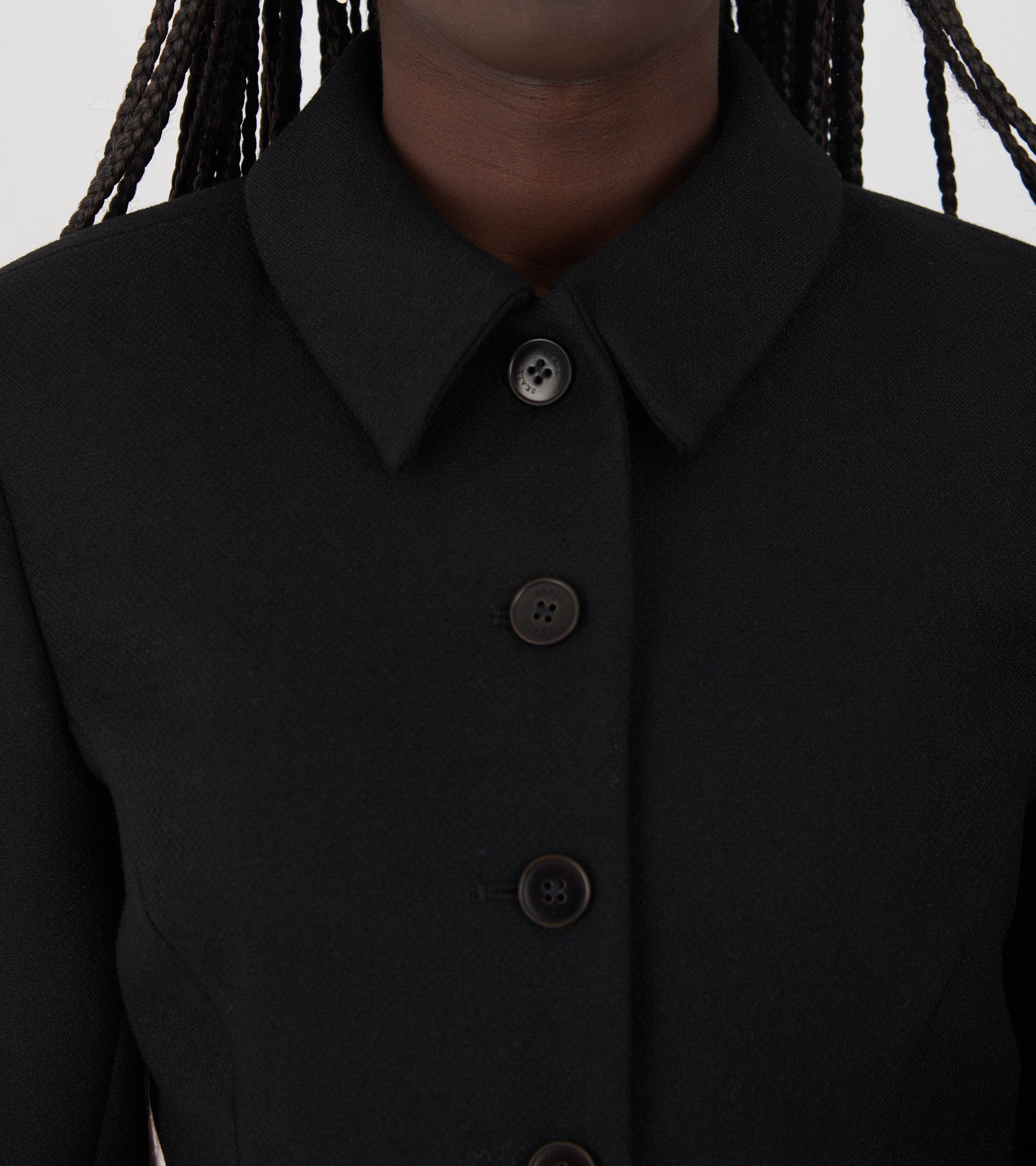 Sort figursyet jakke i uld fra Skall Studio. Ari Jacket har en klassisk krave samt en knaplukning på fronten. Jakken har lange ærmer samt formskårne paneler.