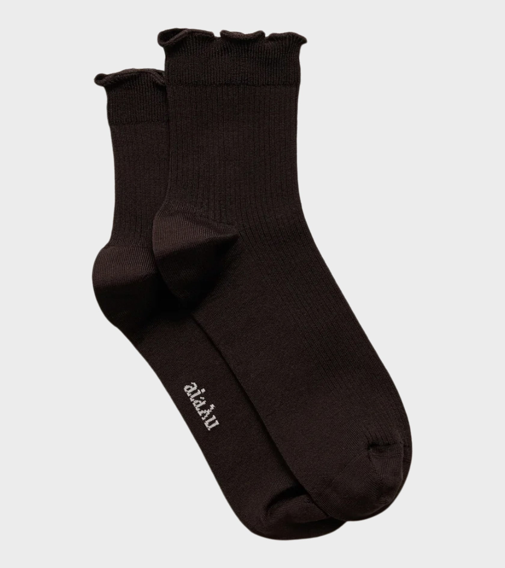 Brune korte rib strømper med flæsekant i en økologisk bomuldsblanding fra Aiayu.