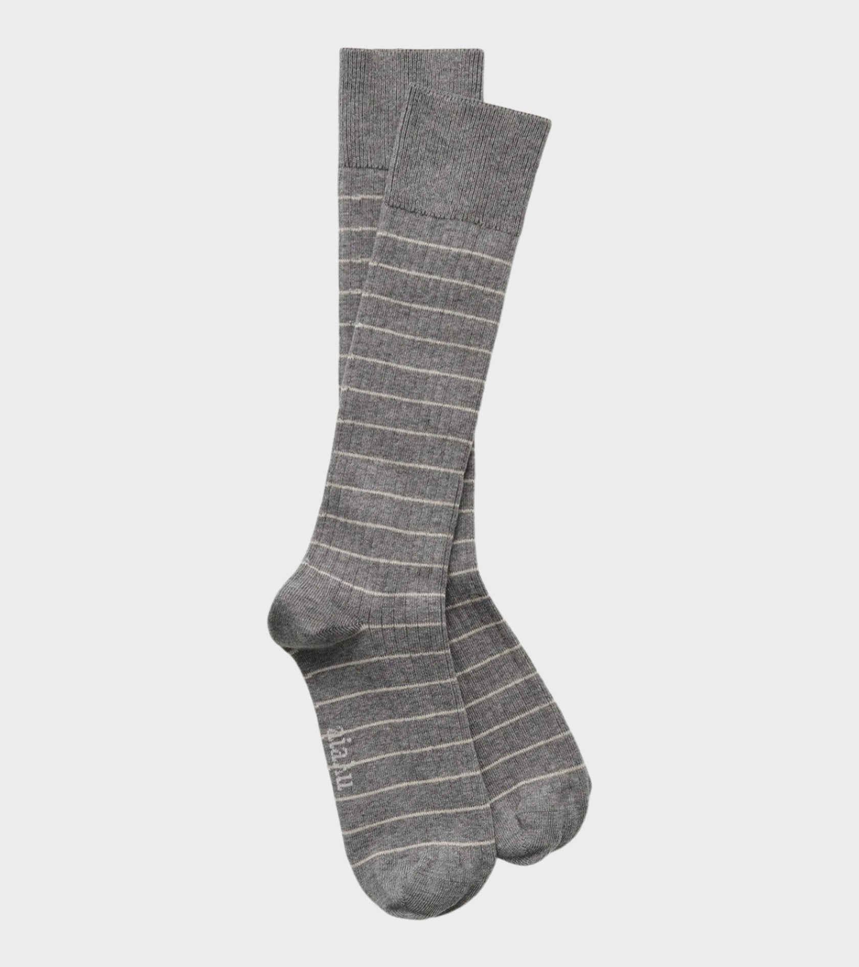 Lange grå rib strømper med tynde striber fra Aiayu. Strømperne er fremstillet i en økologisk bomuldsblanding.