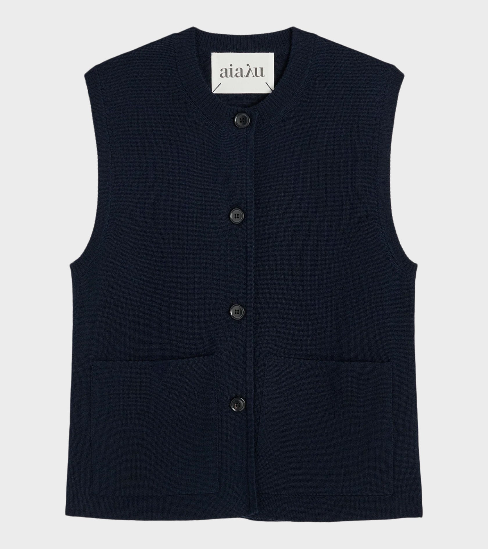Navy vest i merinould fra Aiayu. Elva vesten er strikket med 'Milano-teknikken' - en detaljeret proces, der skaber en ekstra tæt kvalitet. Den har en rund hals, påsatte lommer og en knaplukning på fronten.