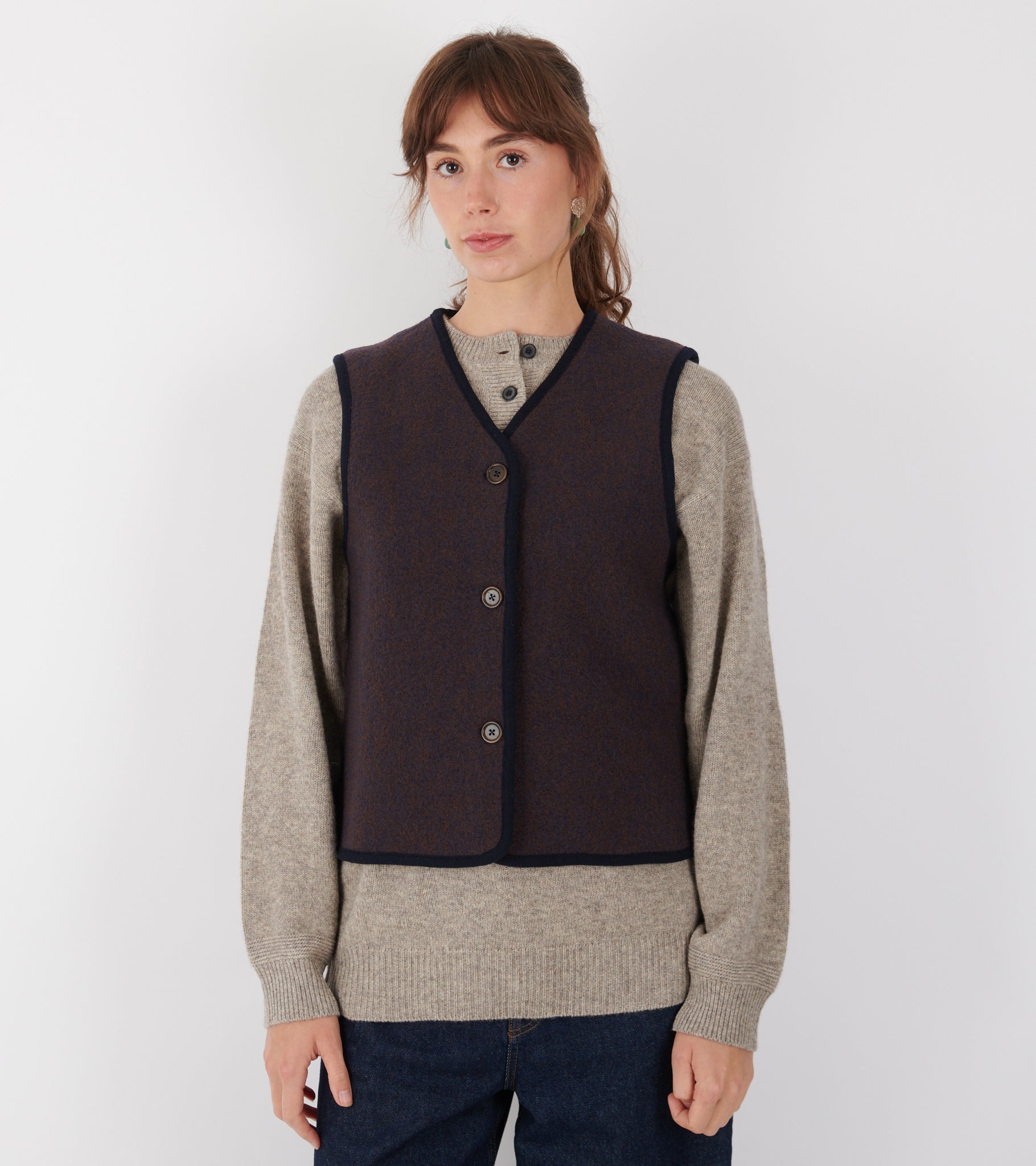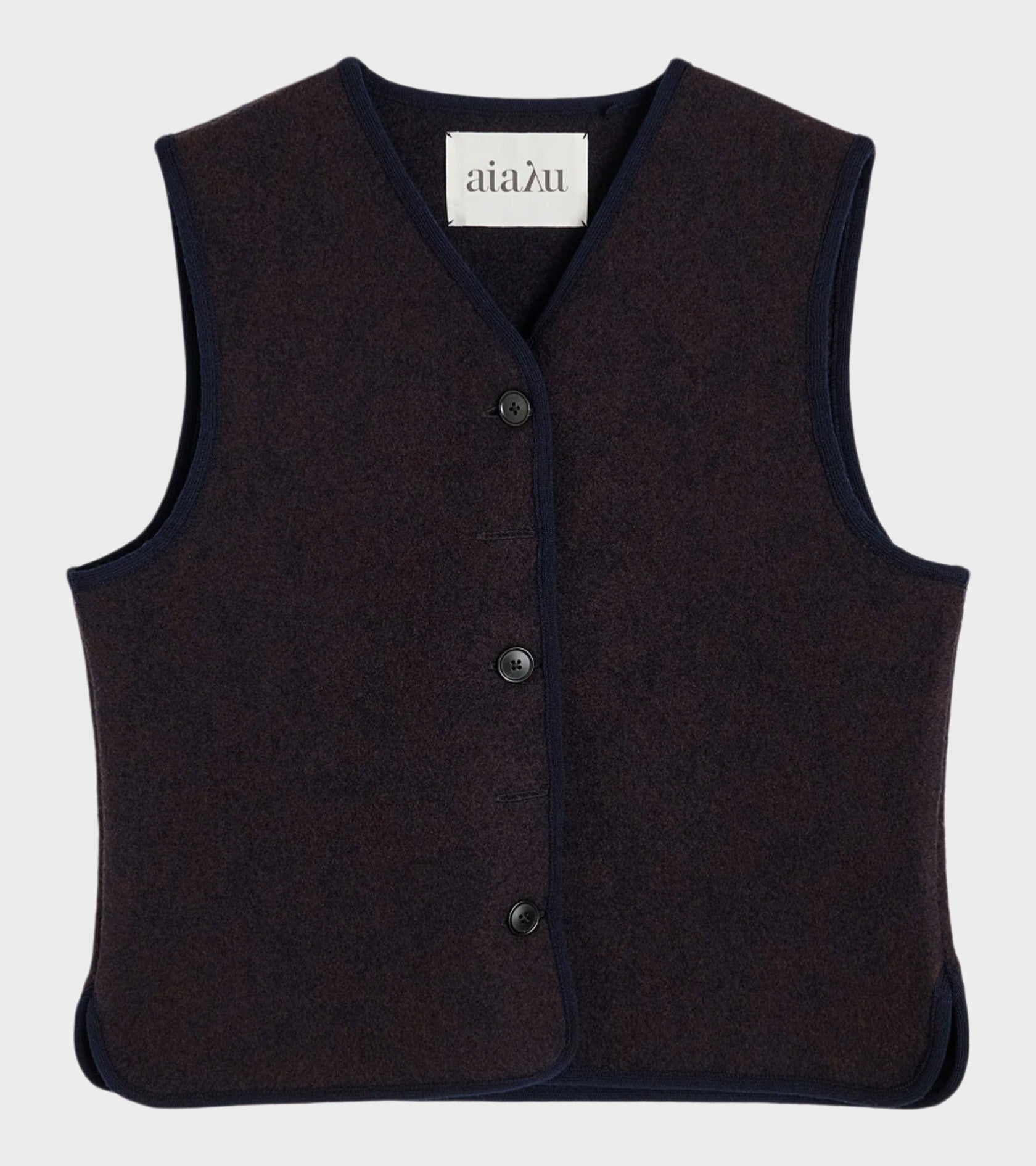 Mørkebrun vest i merinould fra Aiayu. Hilda Vest er fremstillet i strikket og kogt merinould. Varmebehandlingen trækker fibrene sammen, og giver en børstet overflade, der er exceptionelt holdbar og varm med naturligt vind- og vandskyende egenskaber.