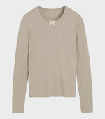 Beige langærmet bluse fra Aiayu. Messhu Long Sleeve er fremstillet i en økologisk bomuldsjersey kvalitet med let struktur. Den har ribkanter, en rund hals og en sløjfedetalje på fronten.