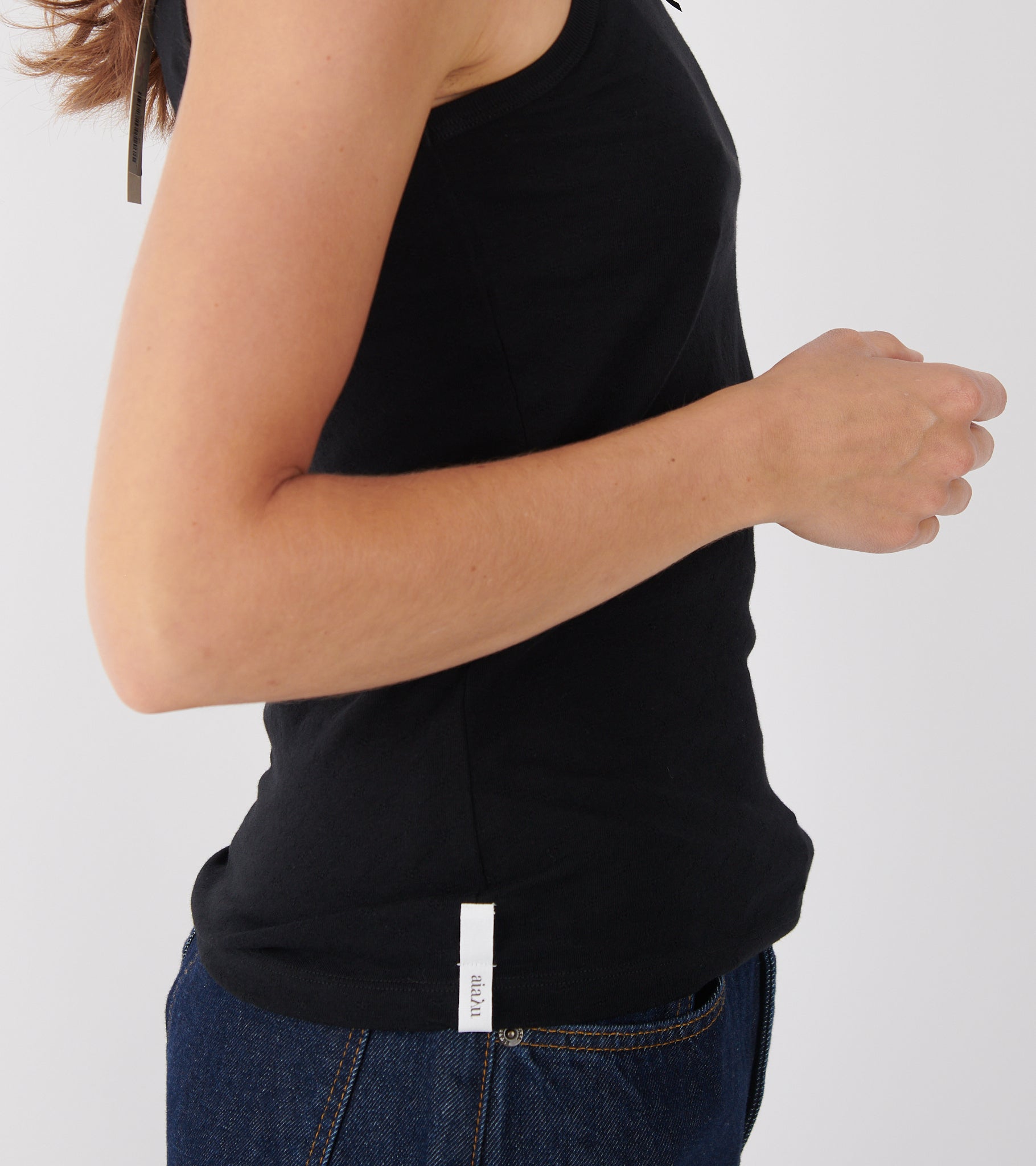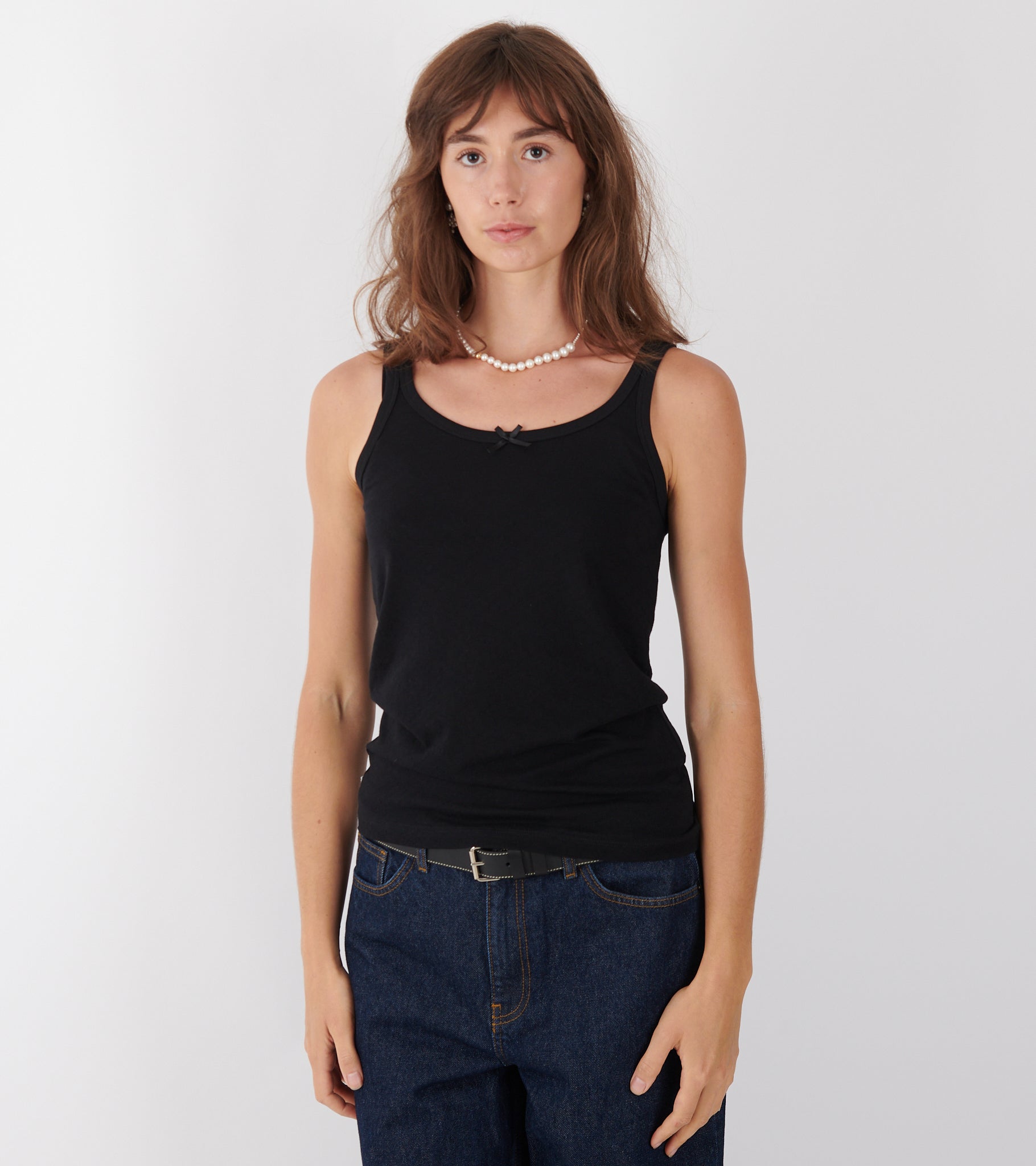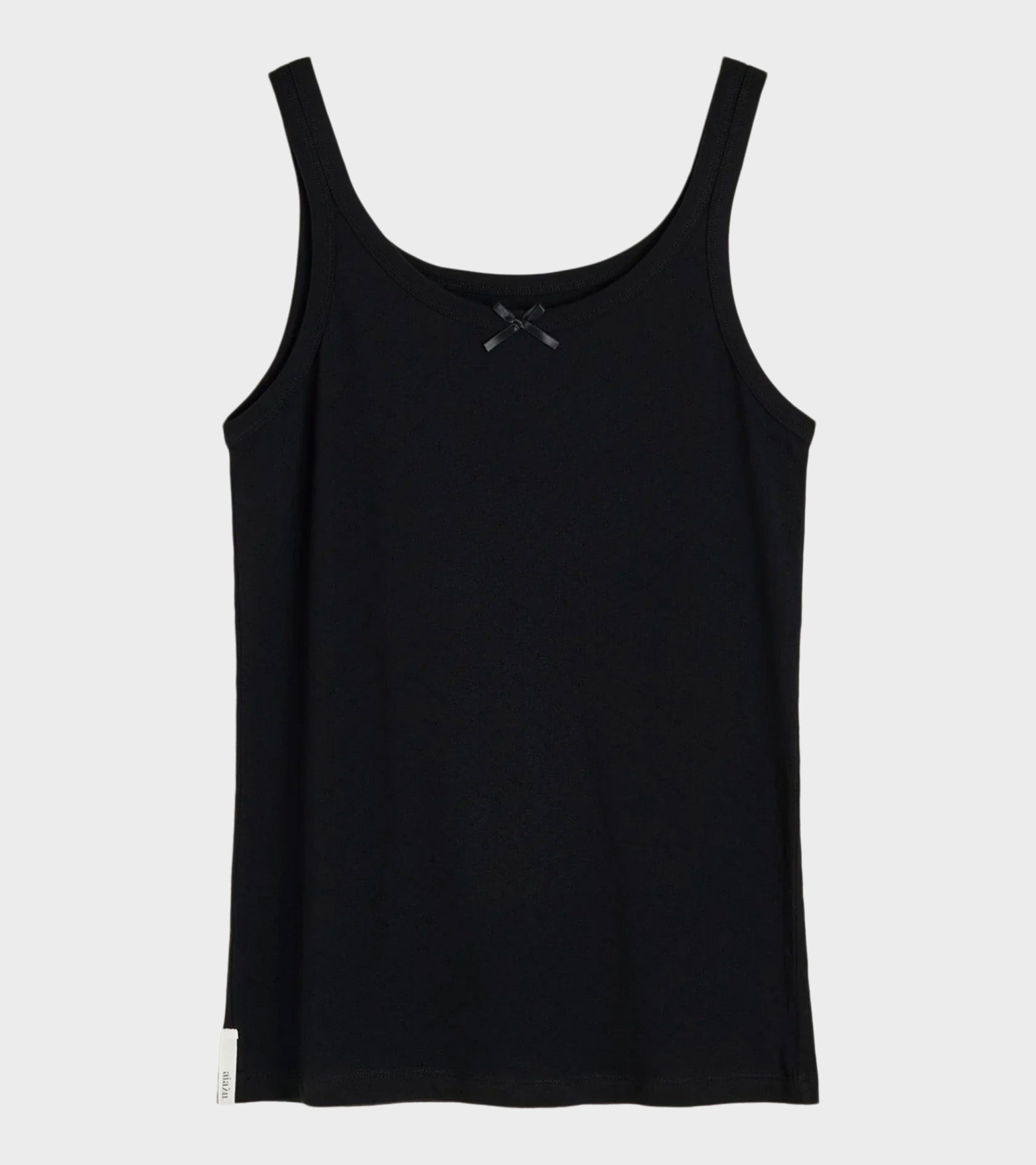 Sort top fra Aiayu. Messhu Tank er fremstillet i en økologisk bomuldsjersey kvalitet med let struktur. Den har ribkanter og en sløjfedetalje på fronten.