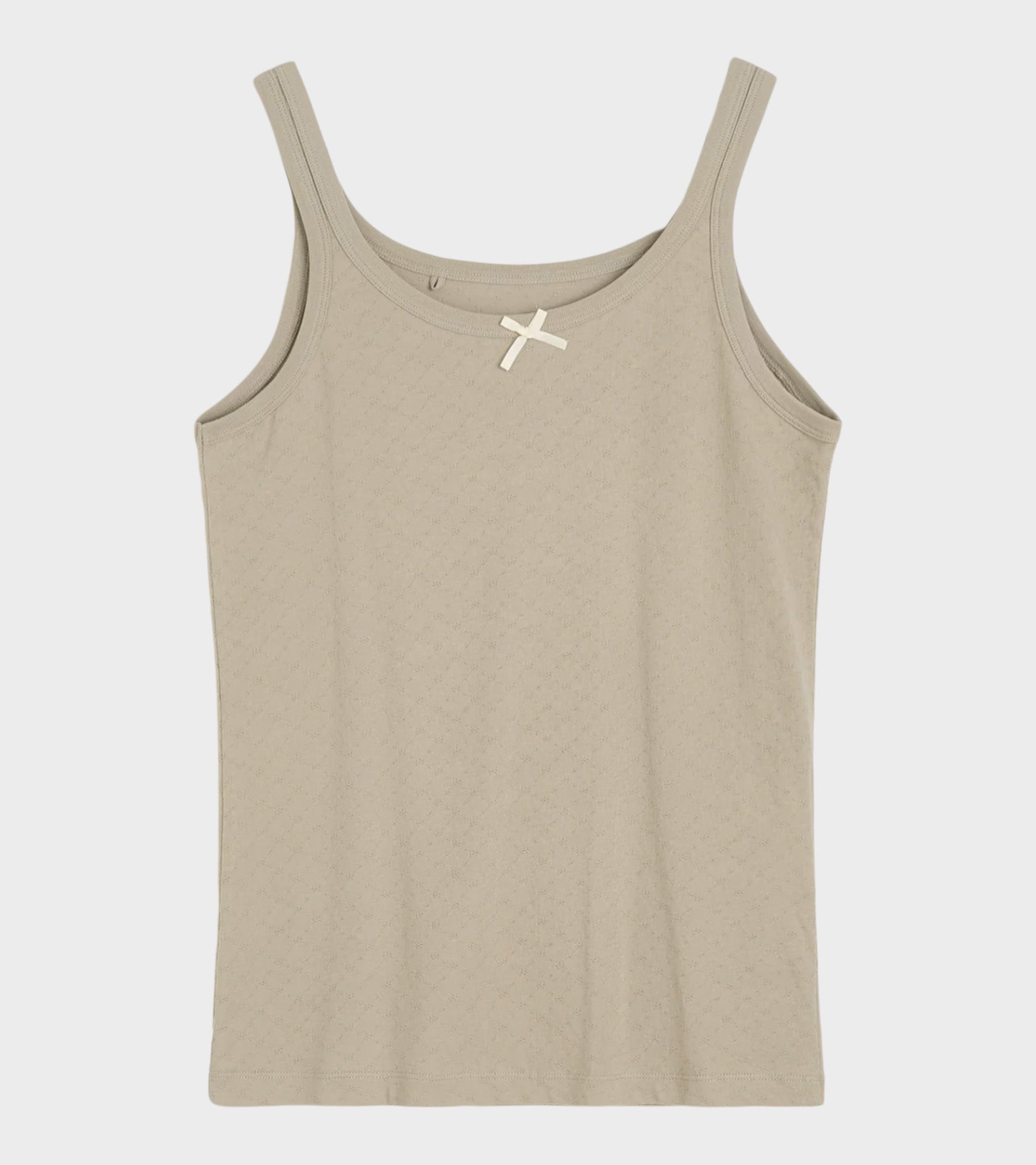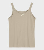 Beige top fra Aiayu. Messhu Tank er fremstillet i en økologisk bomuldsjersey kvalitet med let struktur. Den har ribkanter og en sløjfedetalje på fronten.
