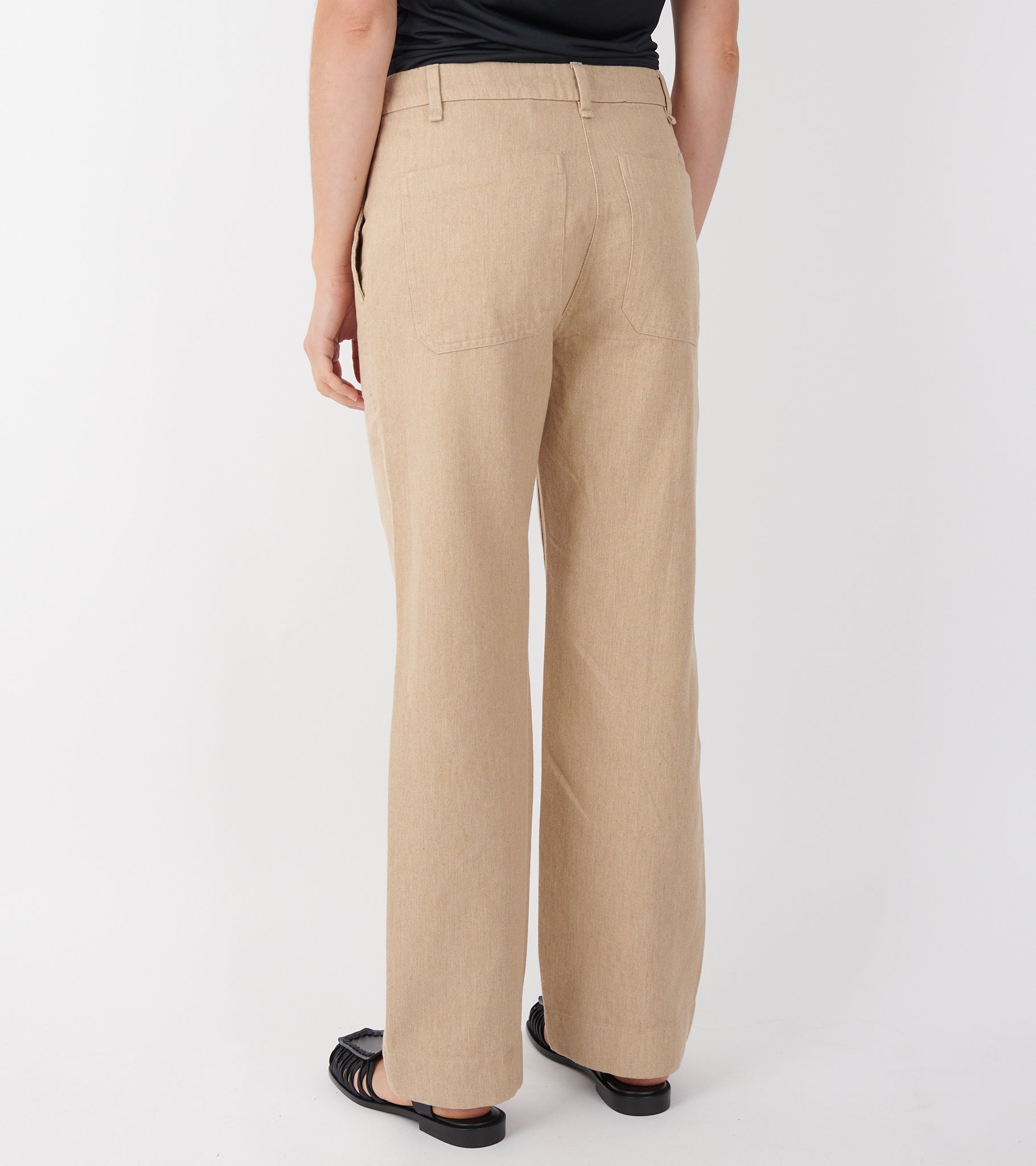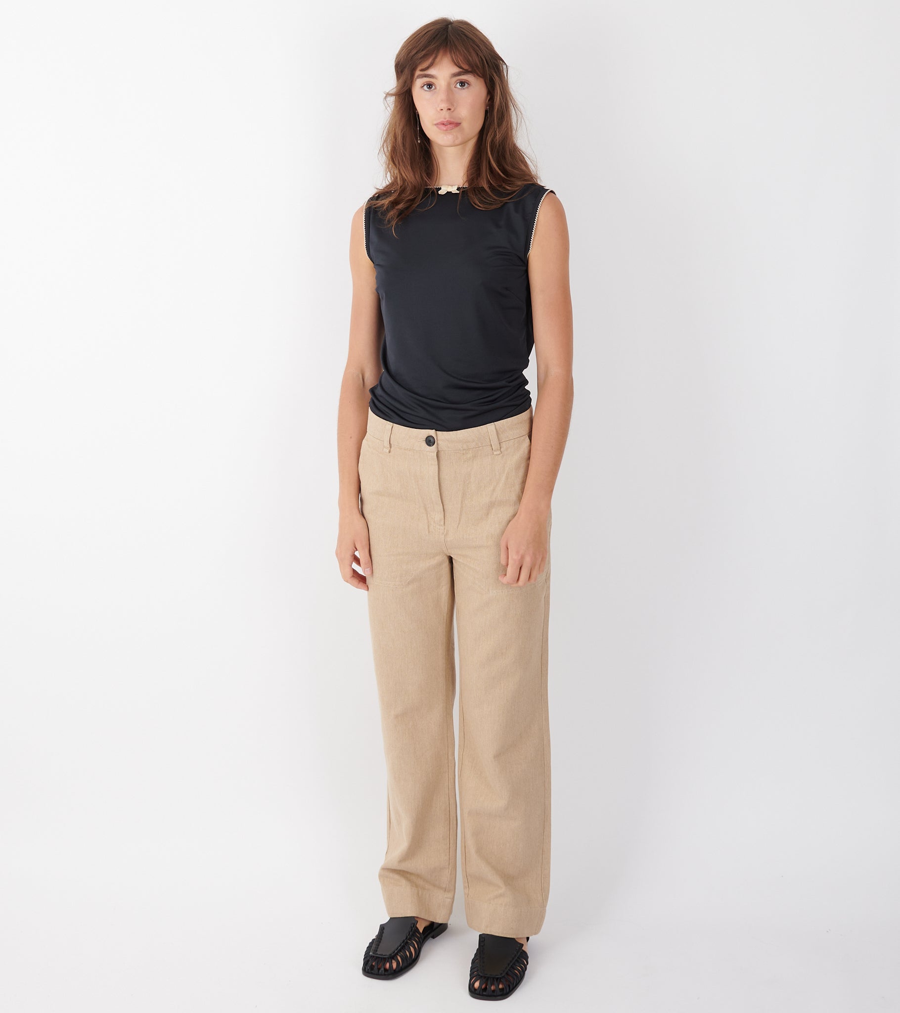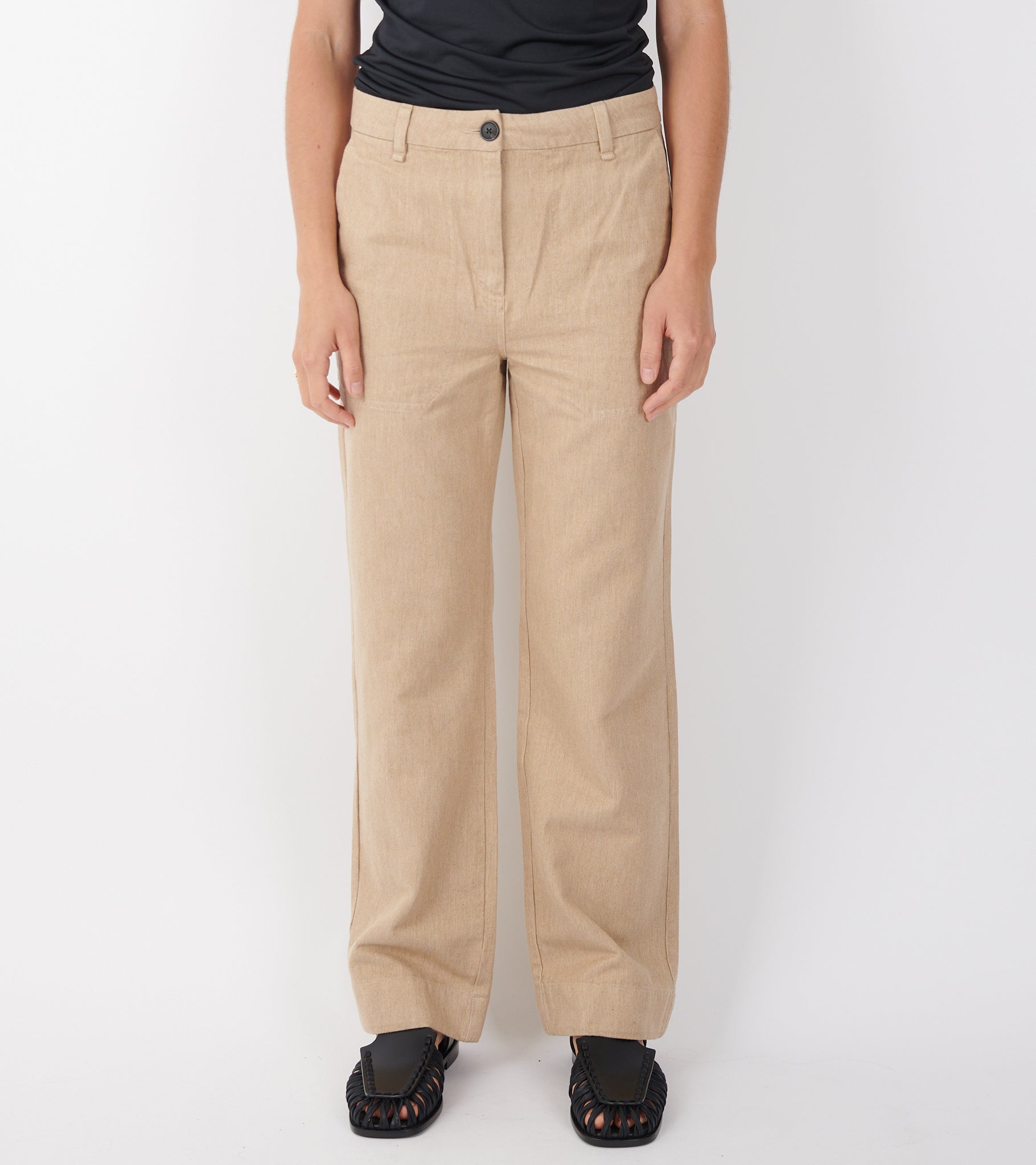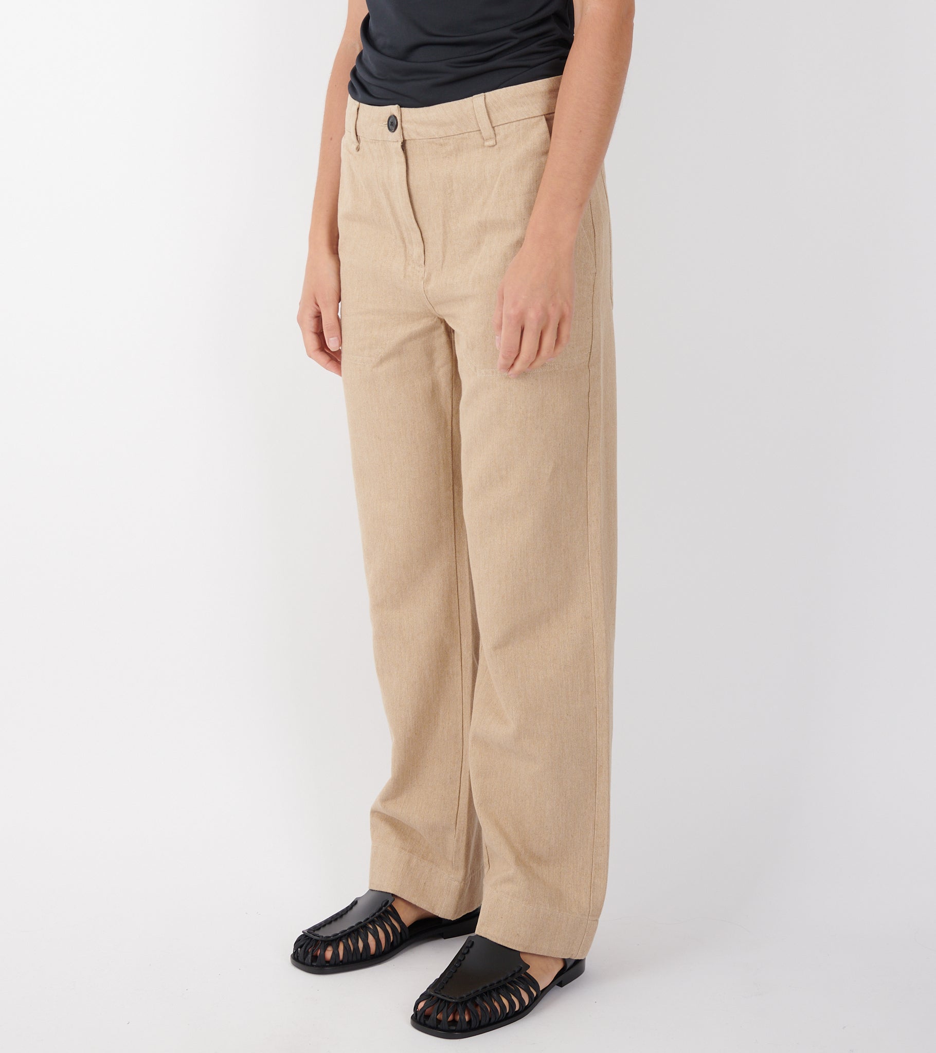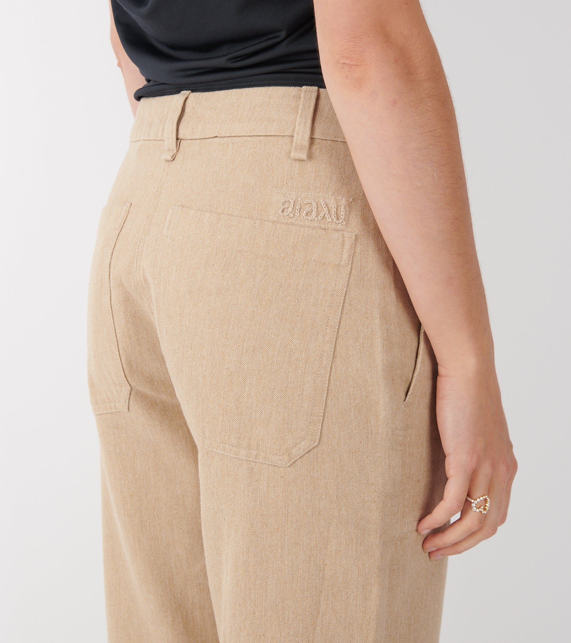 Beige workwear inspirerede bukser fra Aiayu. River Pant er fremstillet i økologisk bomuld og har bæltestropper, en skrålomme i hver side og to påsatte lommer bagpå. Over den ene baglomme er et broderet logo. Pasformen er let afslappet med en mellemhøj talje.