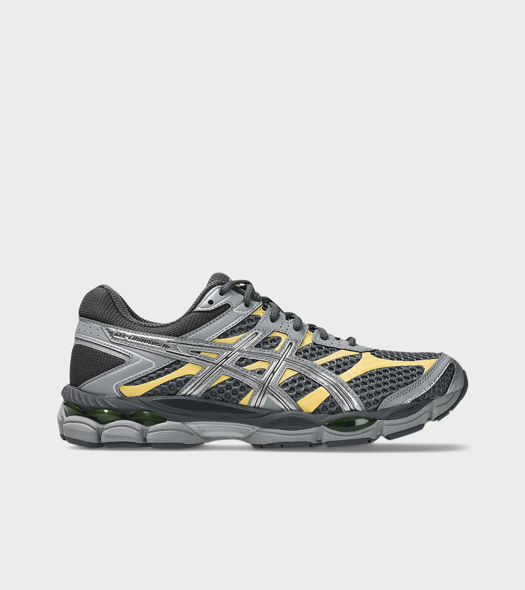 Gel-Cumulus 16 fra Asics i mørkegrå med detaljer i sølv, grå og gul. Disse sneakers har en overdel i mesh, overlays i syntetisk læder, en snørelukning samt en sål med støddæmpende egenskaber.