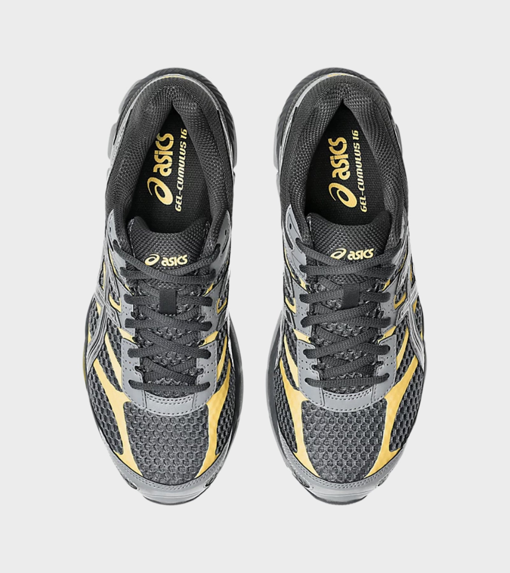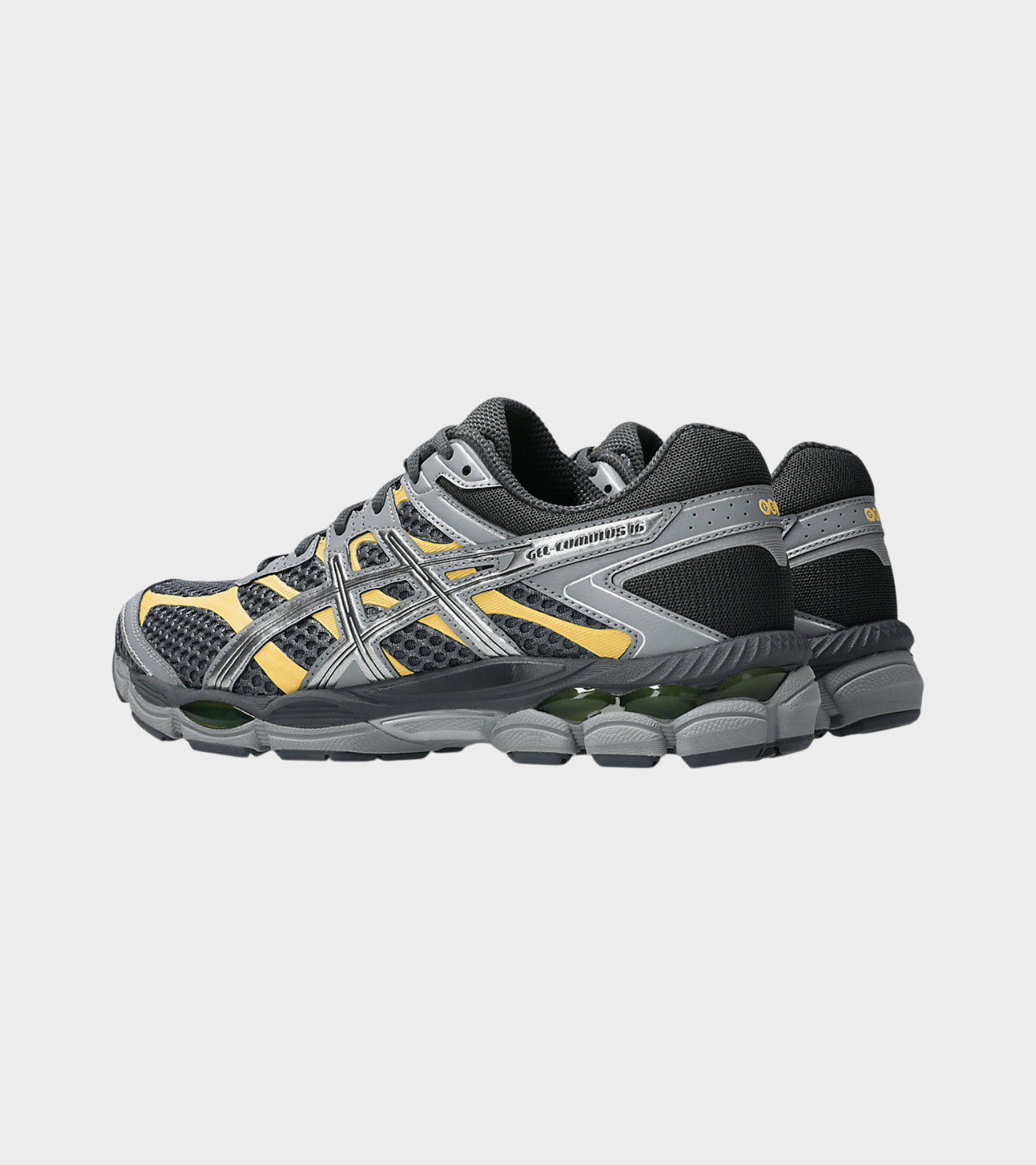 Gel-Cumulus 16 fra Asics i mørkegrå med detaljer i sølv, grå og gul.