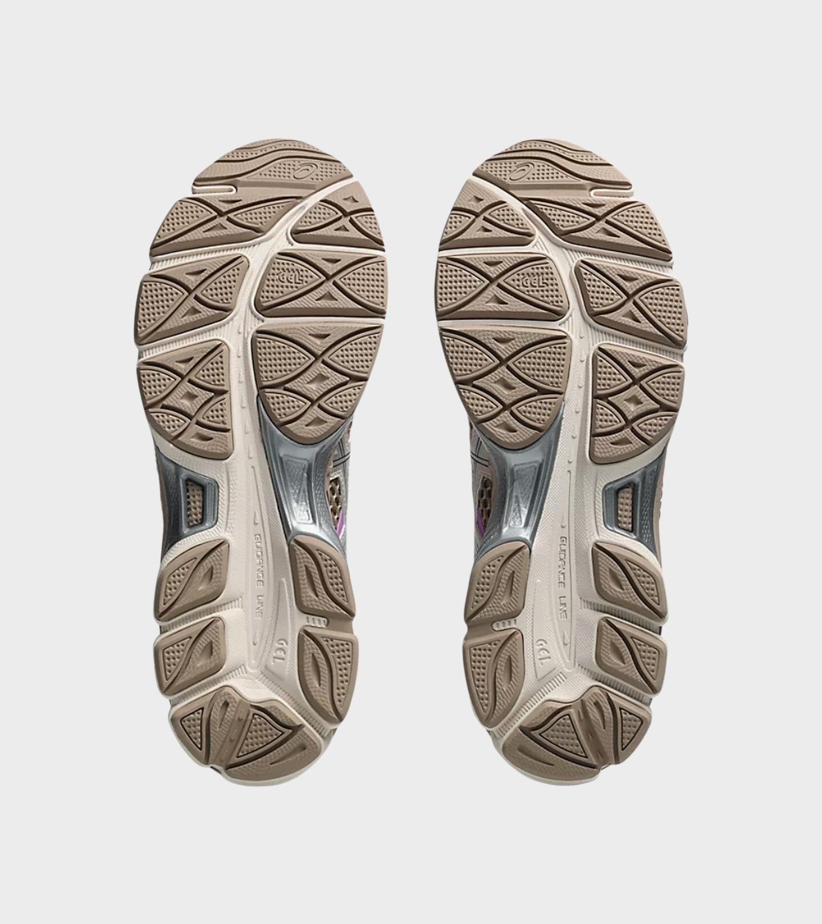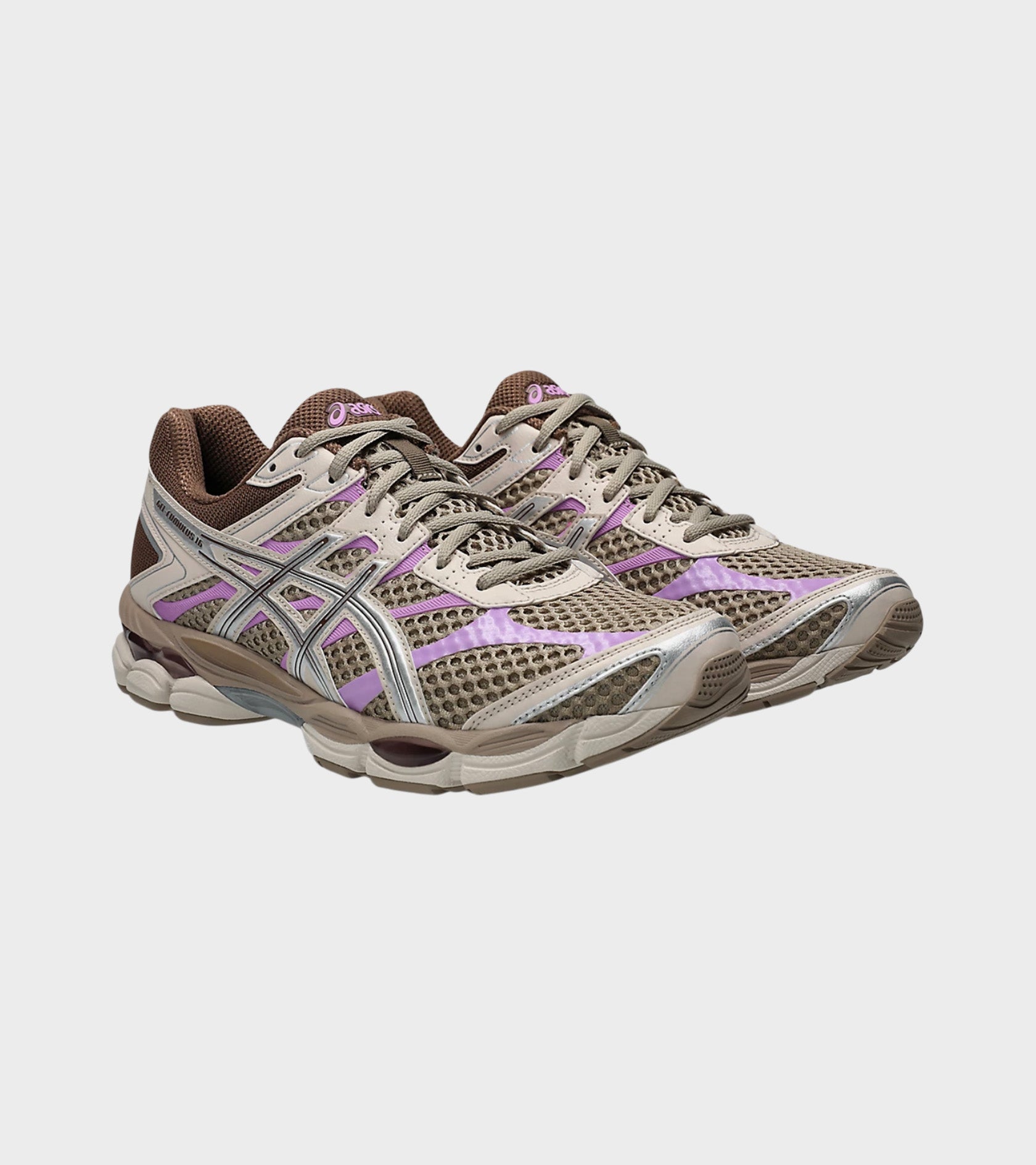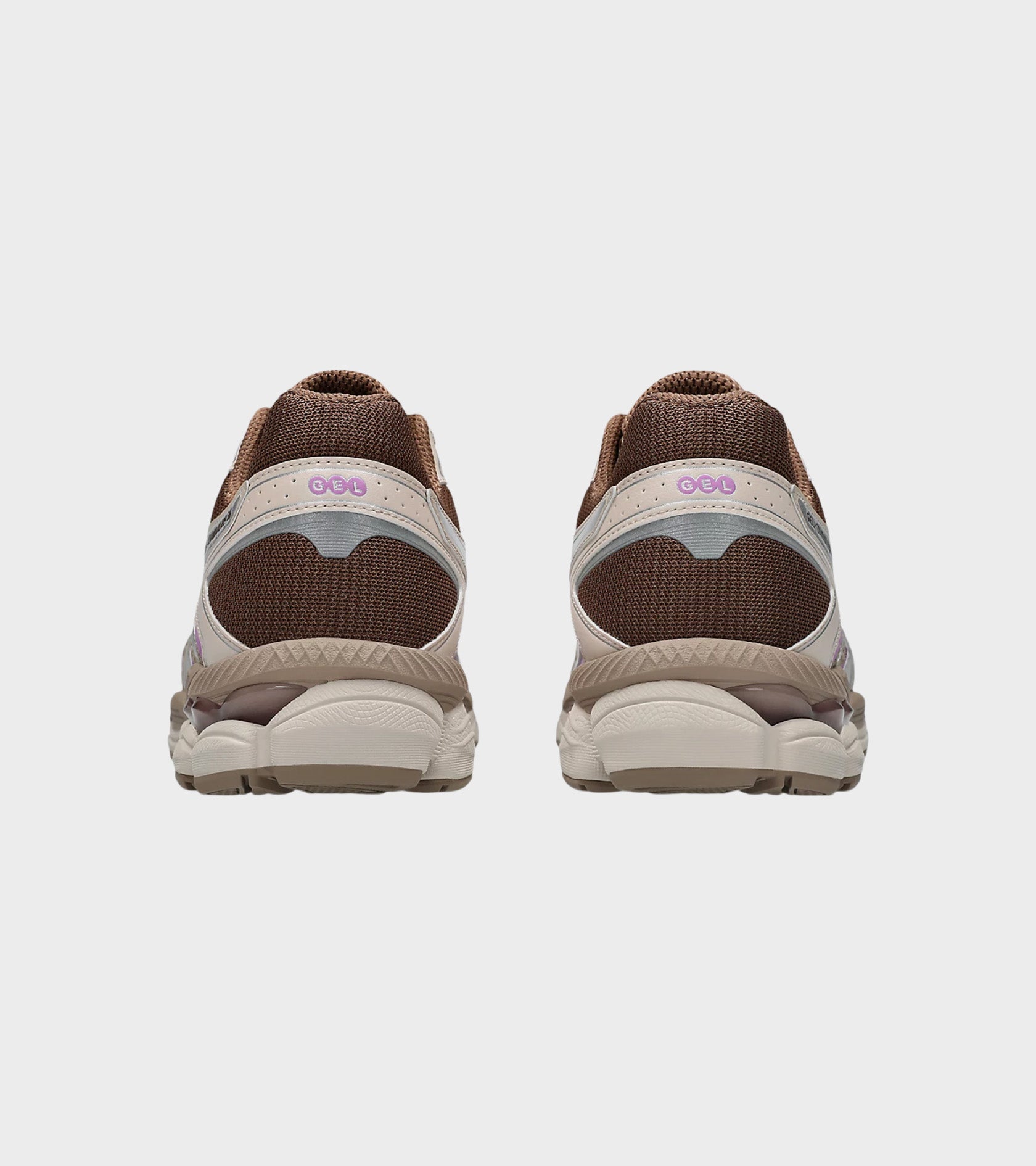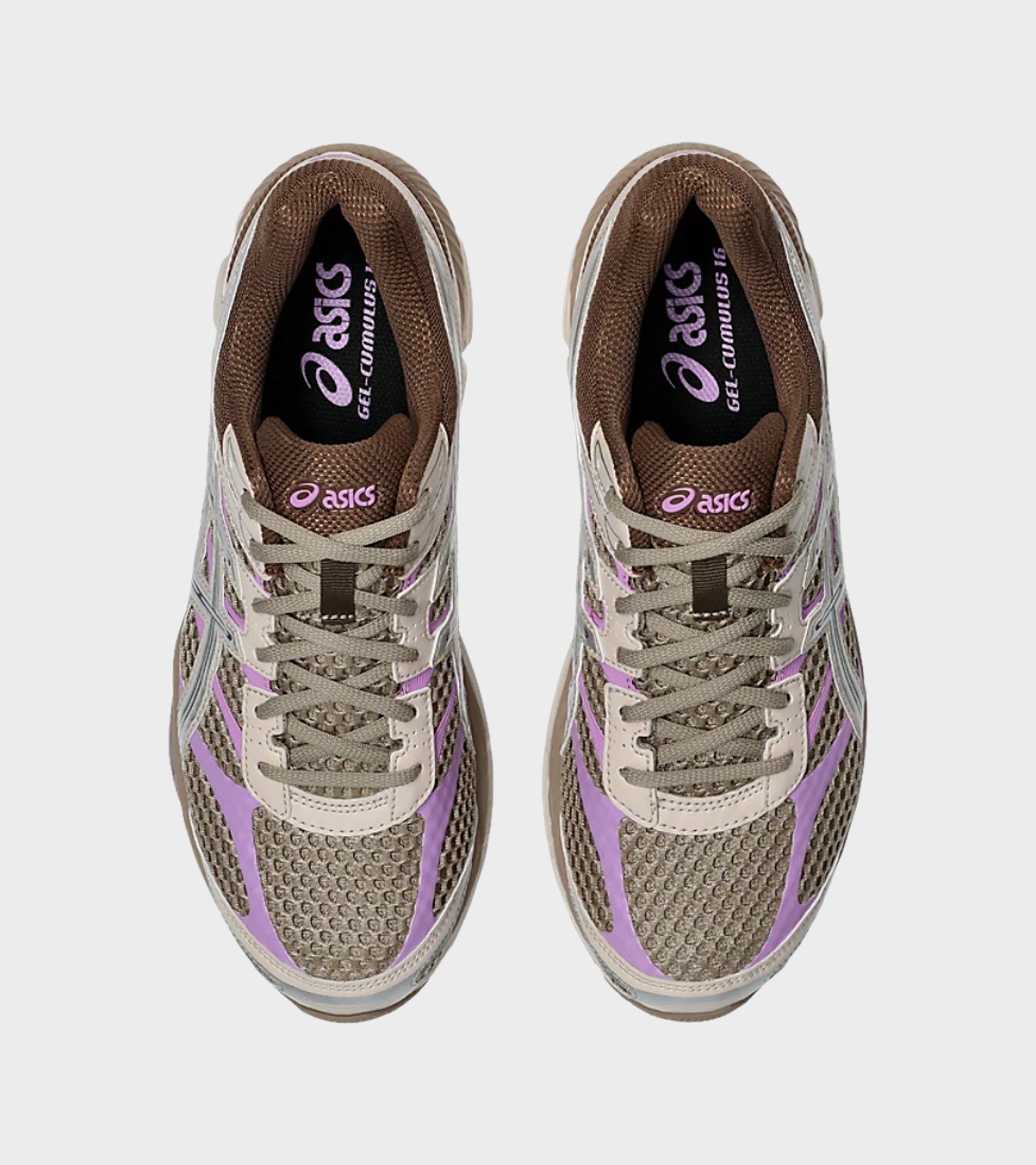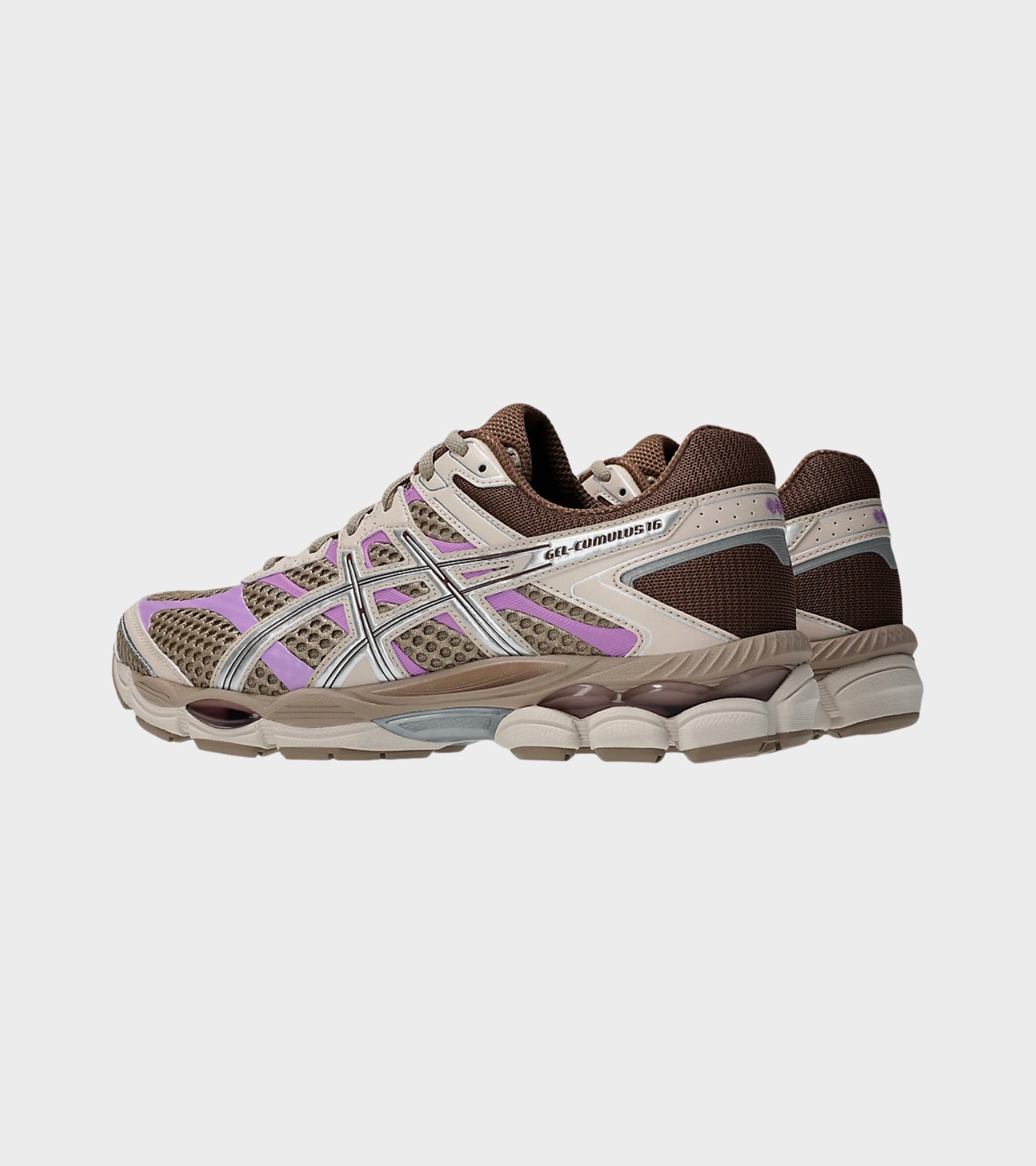 Gel-Cumulus 16 fra Asics i en brun og beige farvekombination med detaljer i sølv samt en violet-pink nuance.