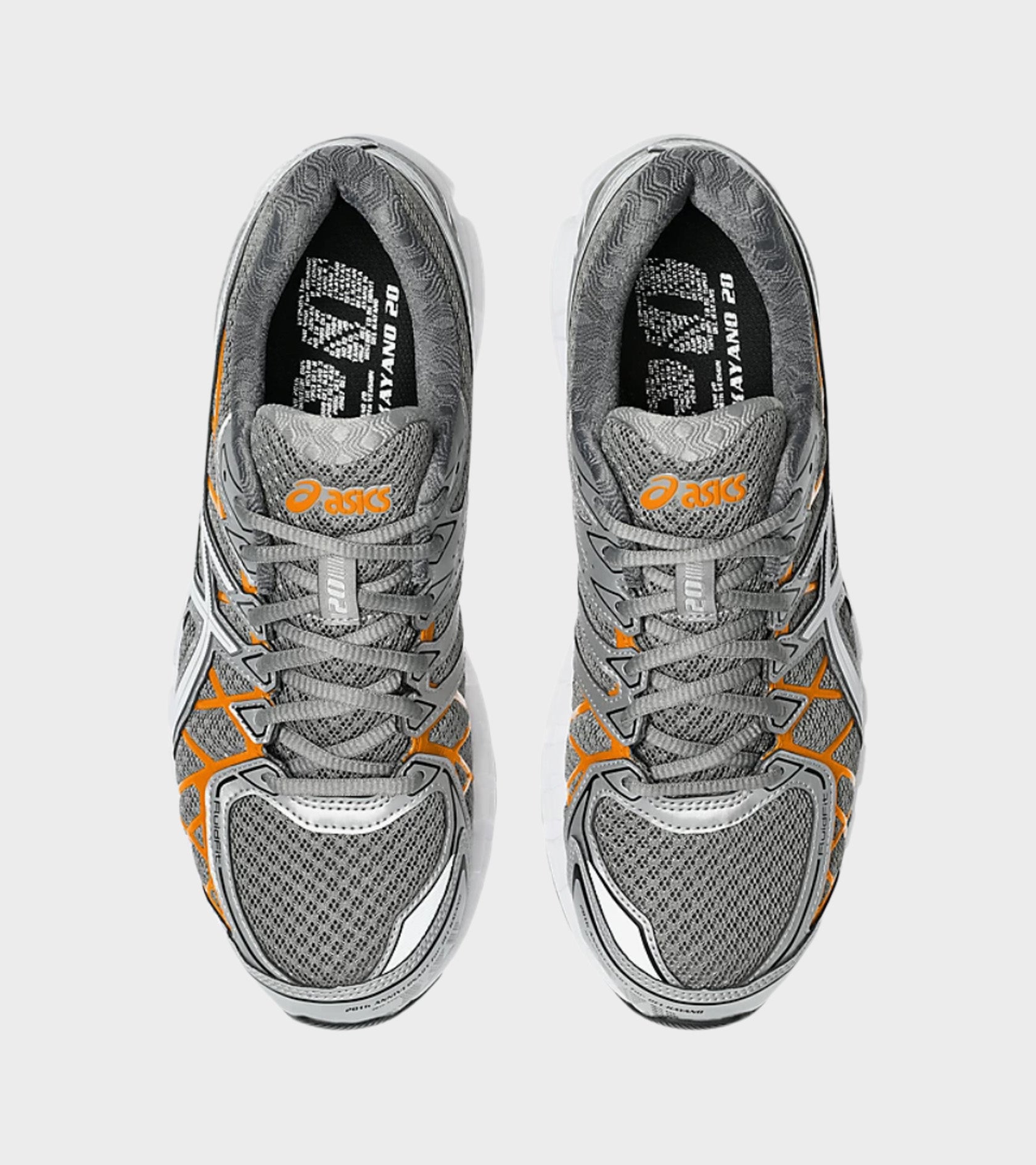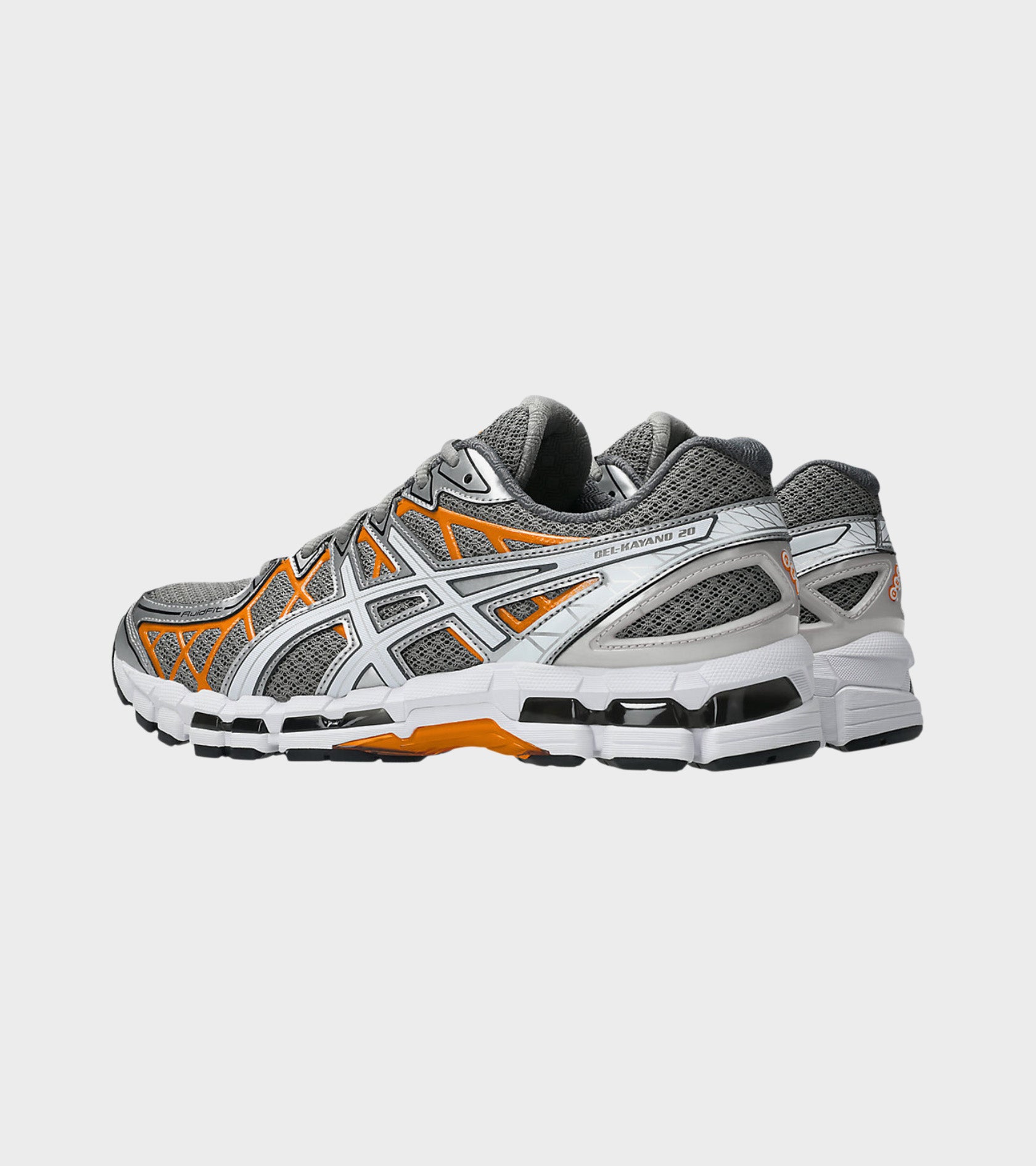 Gel-Kayano 20 fra Asics i en grå farvekombination med orange og sølv detaljer.