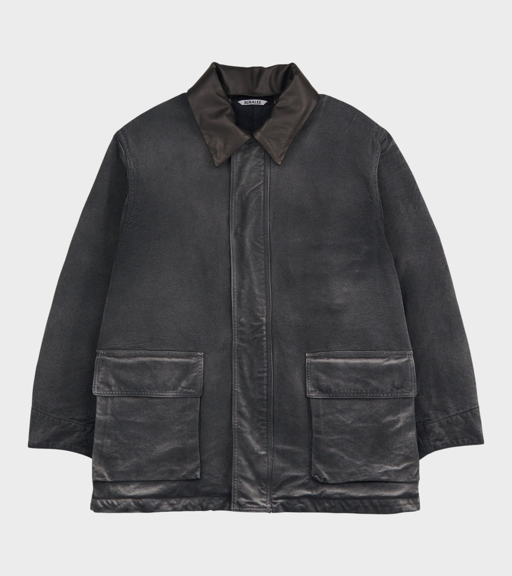 Jakke i foret bomuldskanvas fra Auralee. Jakken har en aftagelig krave i læder - under læderet er en krave i sort fløjl. Jakken har en skjult lynlås- og trykknaplukning samt to store lommer på fronten.