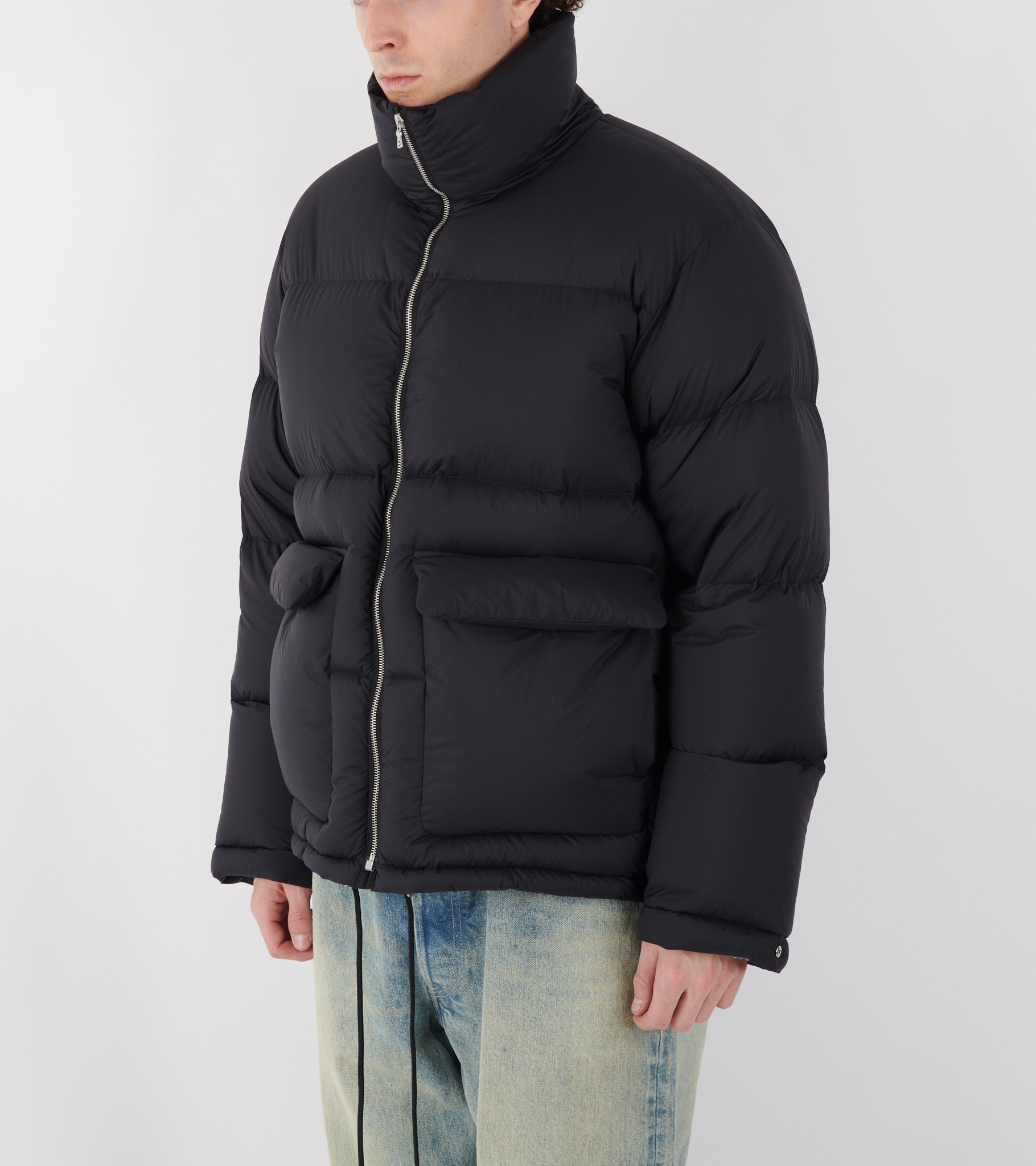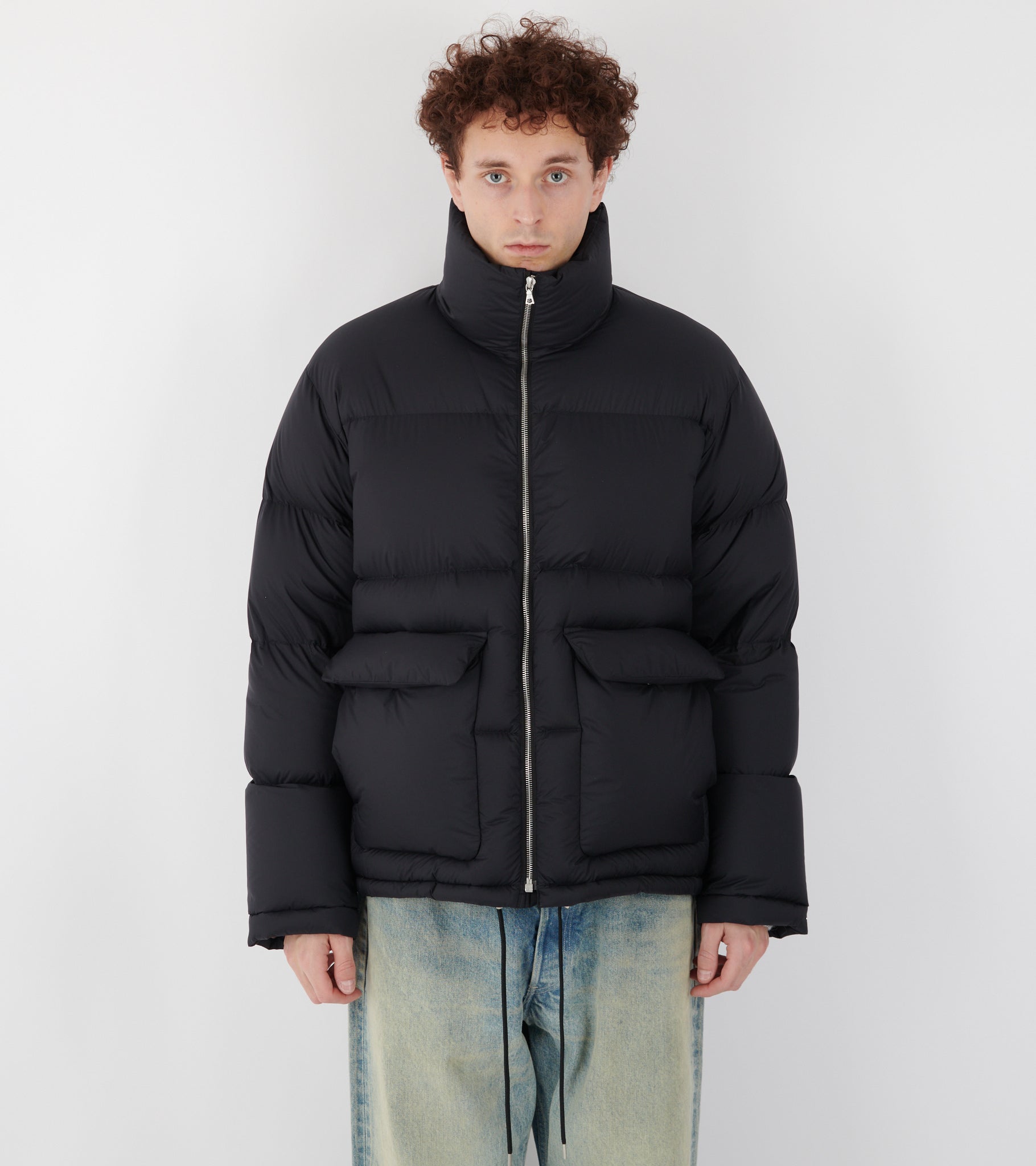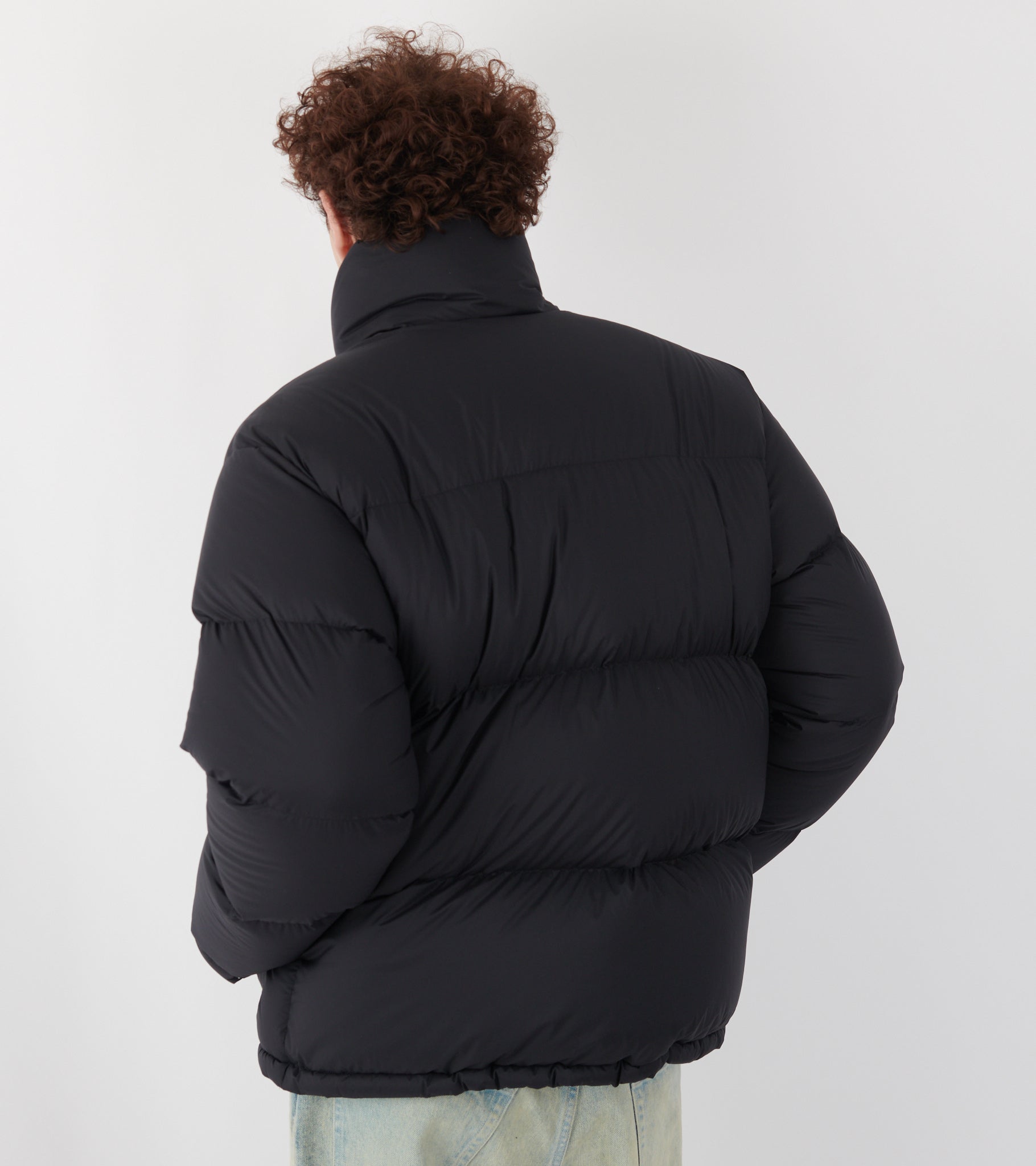 Ultra let sort dunjakke i en mini-ripstop nylonkvalitet fra Auralee. Jakken er vind- og vandafvisende og har en høj hals, en lynlåslukning samt to lommer på fronten. Jakken er foret med andedun og har en indvendig justerbar snor i bunden.