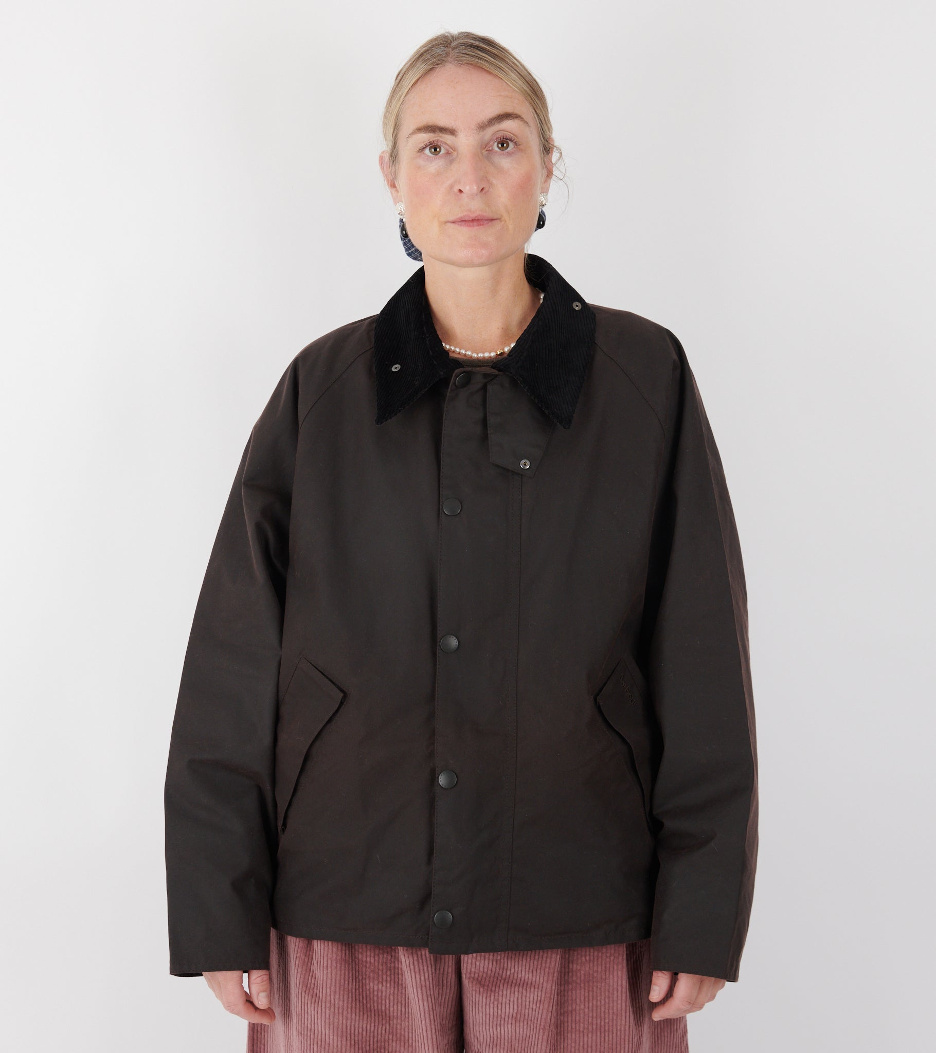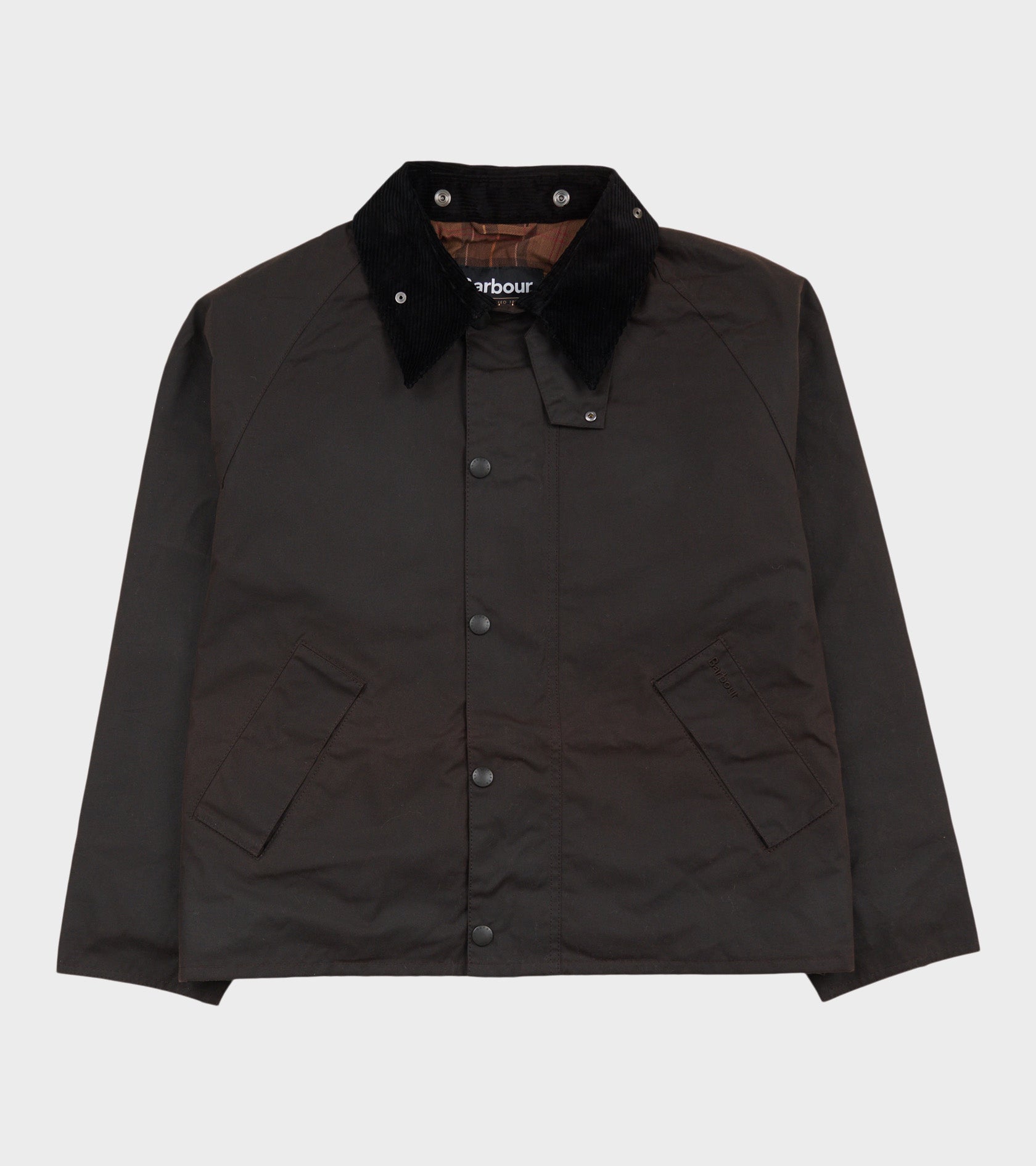 Brun jakke fra Barbour. Jakken er voksbehandlet og har en skjult lynlåslukning, en trykknaplukning og en krave i sort bomuldsfløjl.