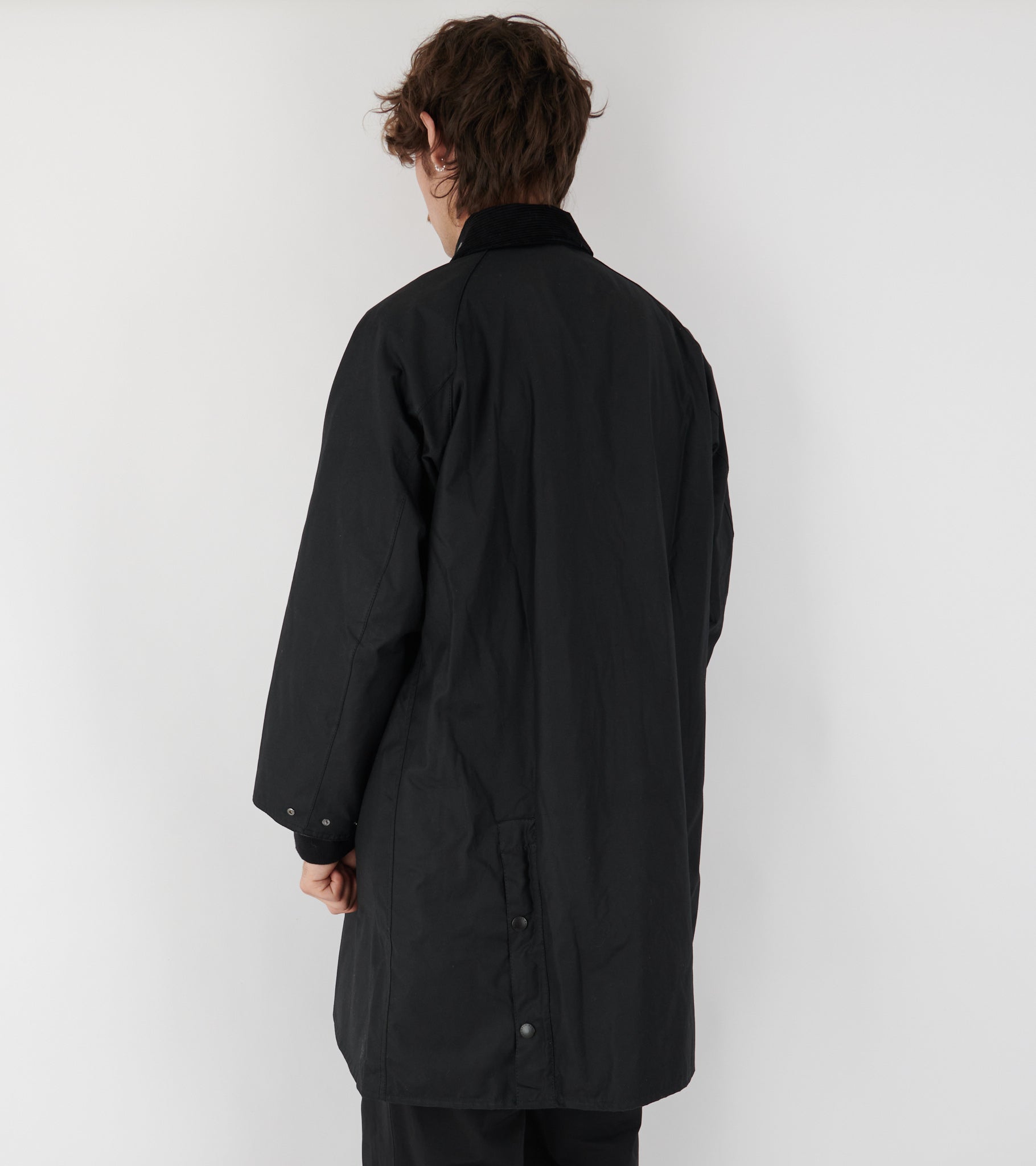 Sort lang frakke i waxed bomuld fra Barbour.