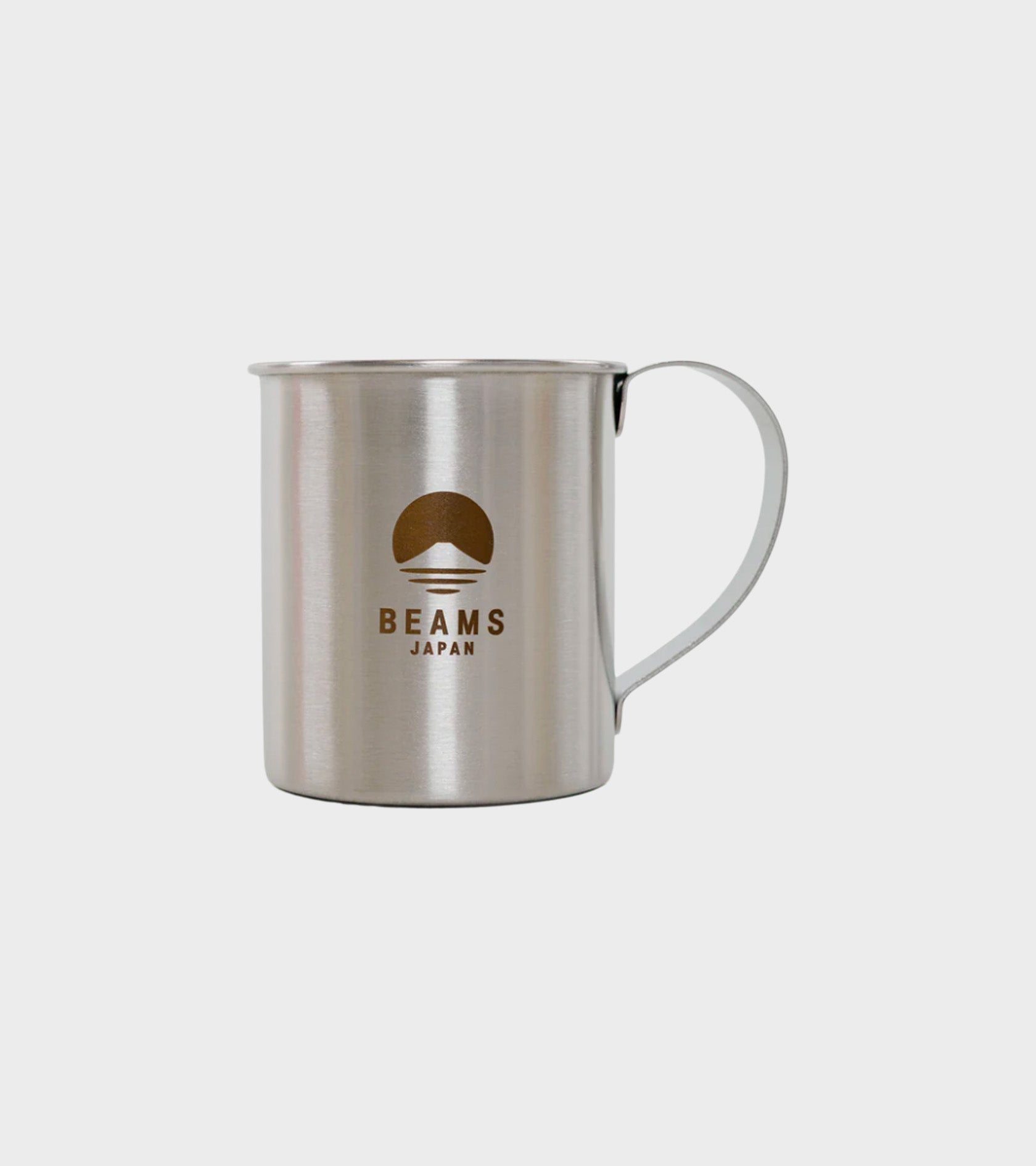 Lille krus i rustfrit stål fra BEAMS Japan. På fronten er et brunt logo.