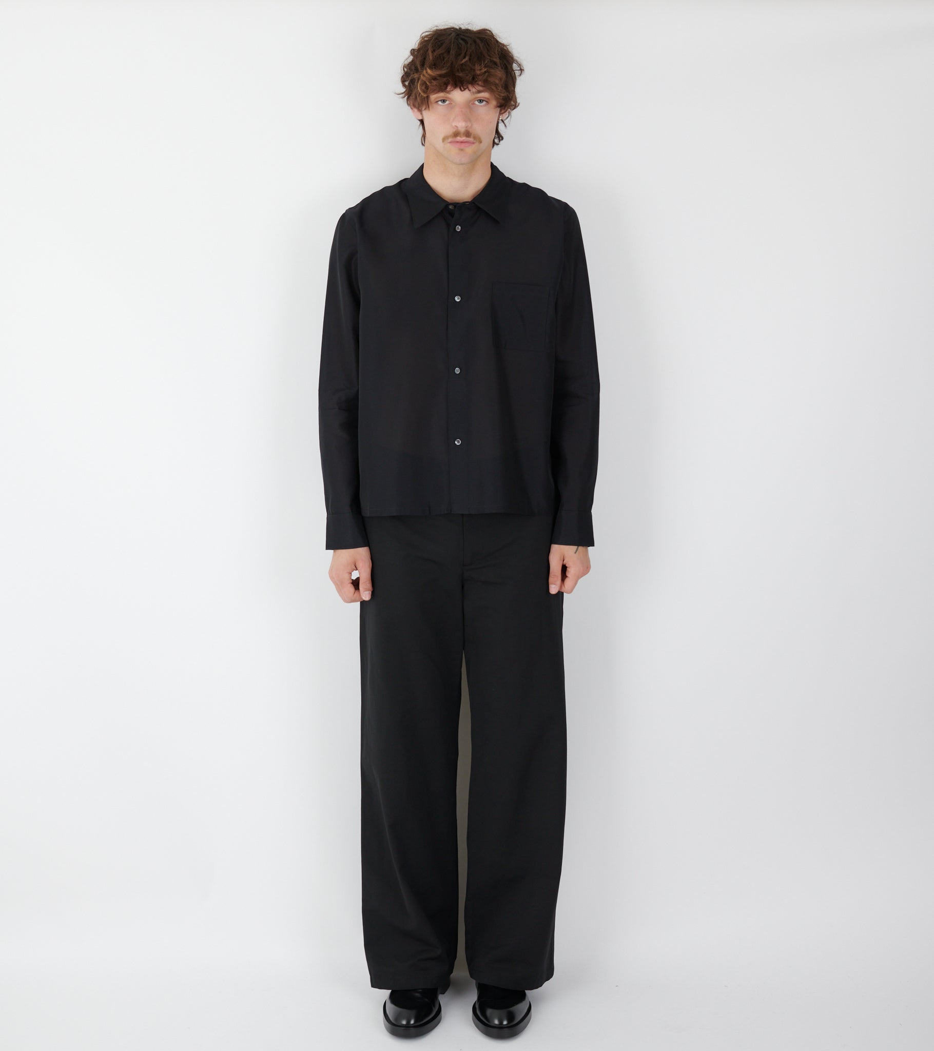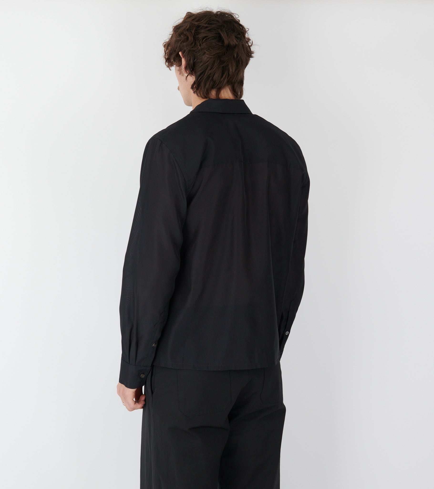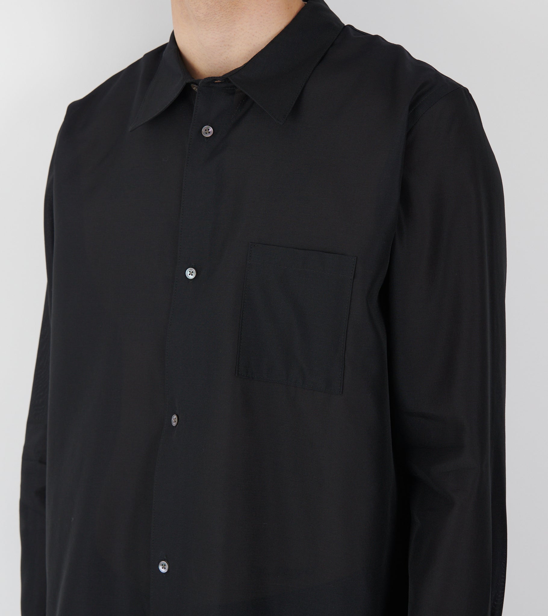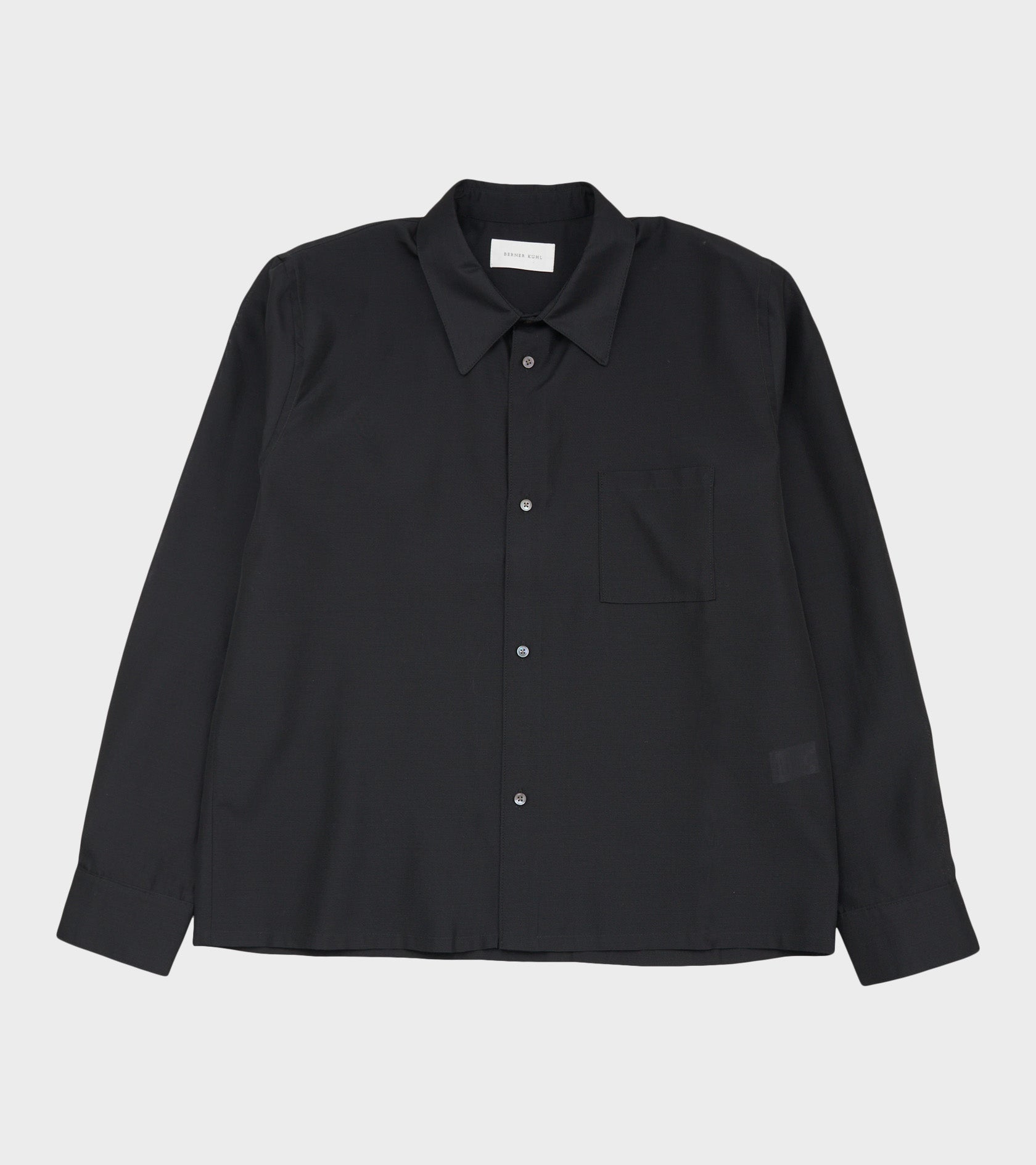 Sort skjorte fra Berner Kühl. Dinner Shirt har en klassisk krave, en brystlomme og en knaplukning med mørkegrå perlemorsknapper. Skjorten er fremstillet i en see through deadstock kvalitet, bestående af silke og uld.