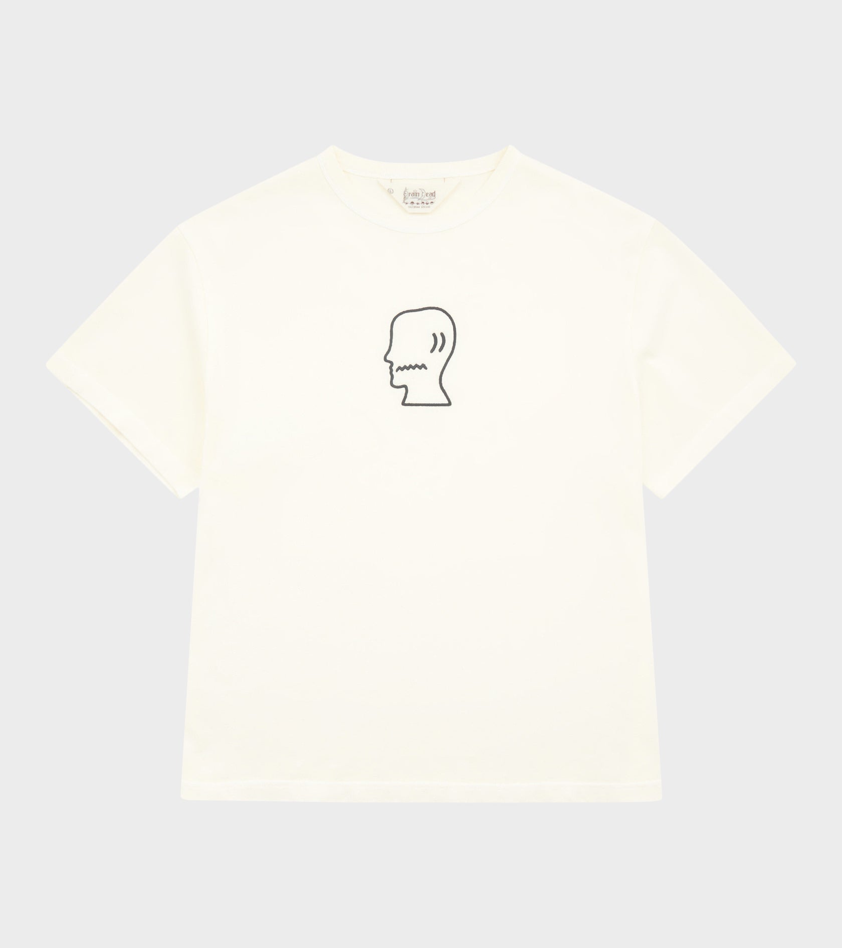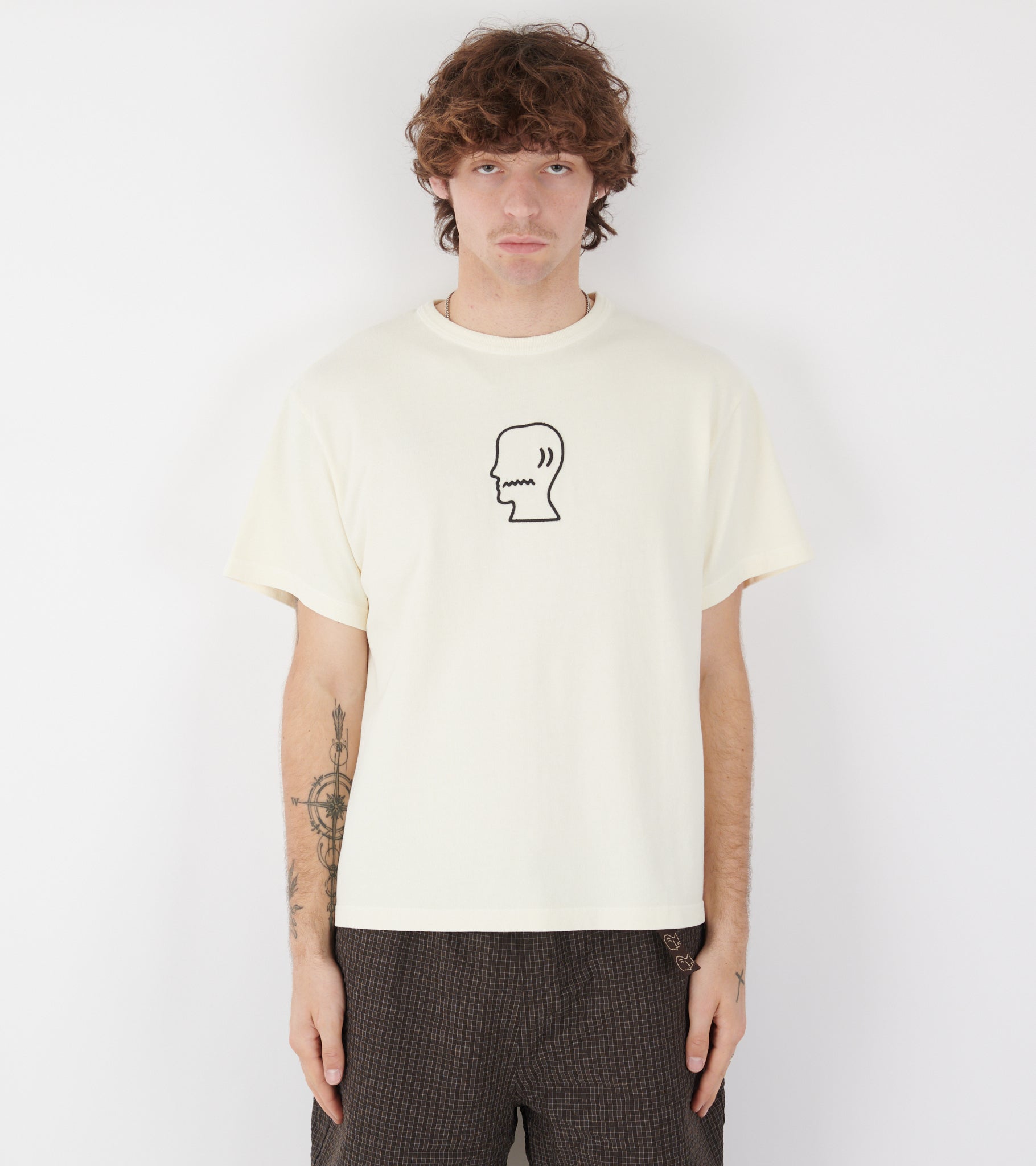 Råhvid t-shirt i en kraftig bomuldskvalitet fra Brain Dead. På fronten er et sort broderet logo.